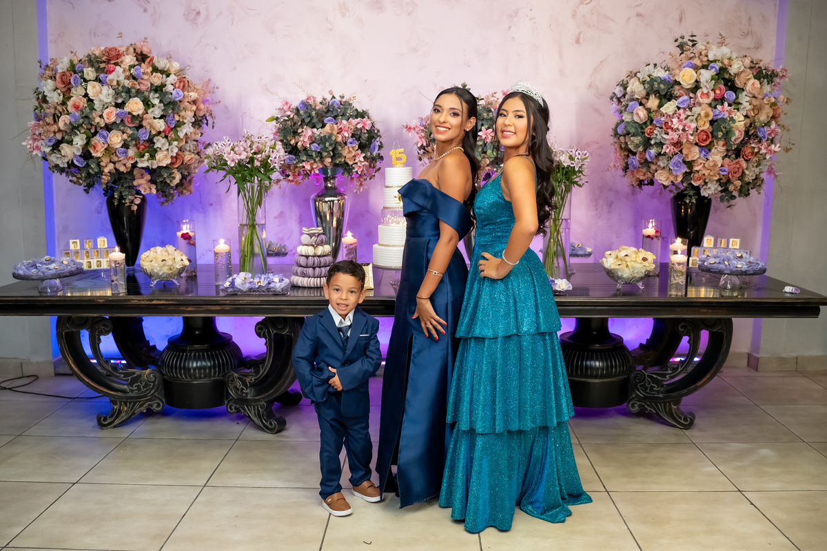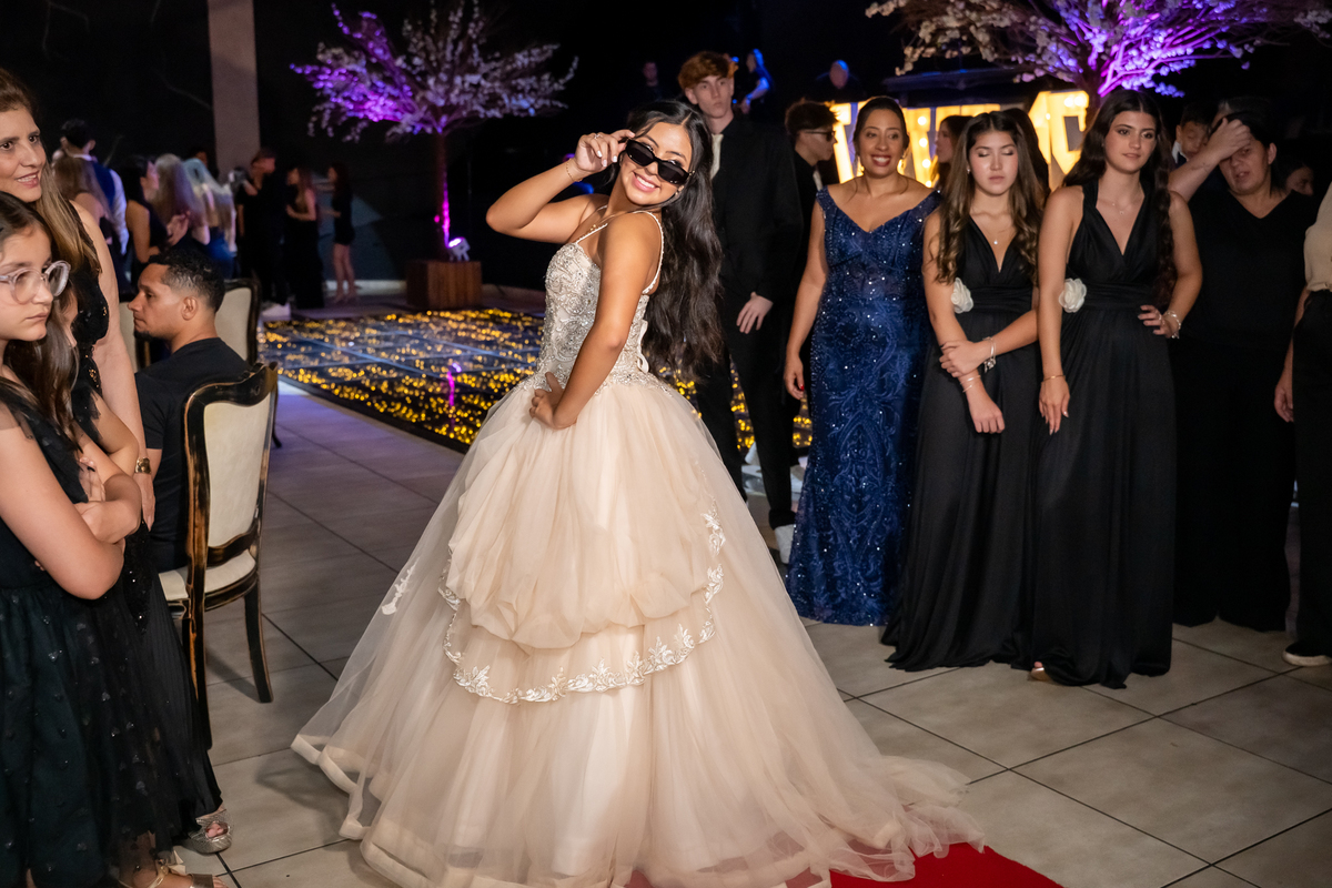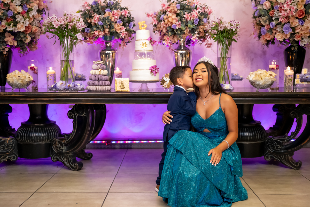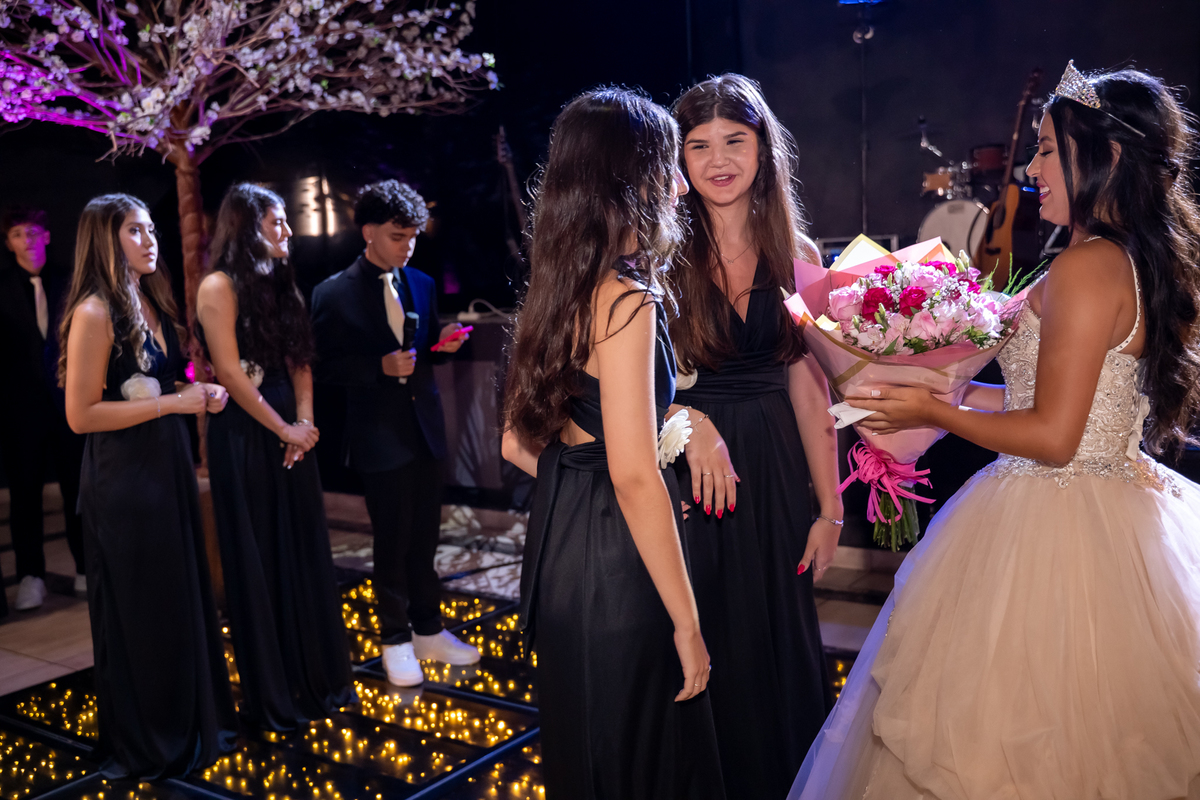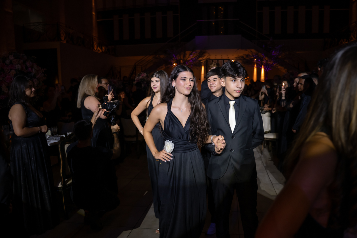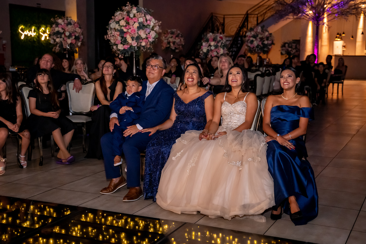 Sua primeira entrada foi simplesmente emocionante: vestida com o traje da valsa, ela desceu as escadas do Salão Sarah Soleil, enquanto seus pais a aguardavam para dar início à cerimônia. Um momento cheio de significado, que arrancou aplausos e olhares emocionados. Em seguida, a pista se transformou em palco para uma linda sequência de valsas, dançadas com os pais, o irmão, o tio e o avô, celebrando o amor, a família e essa nova fase da vida.