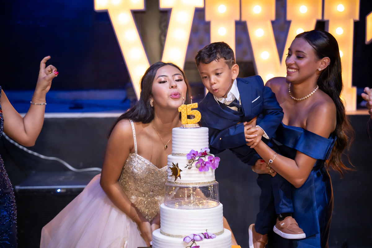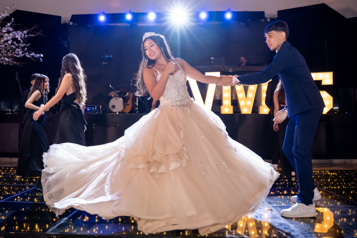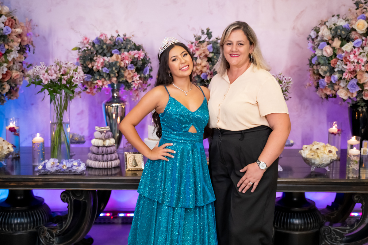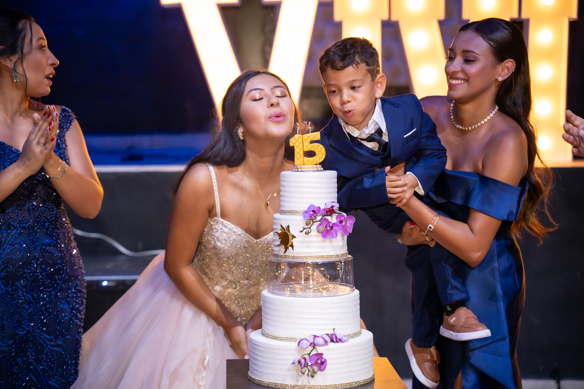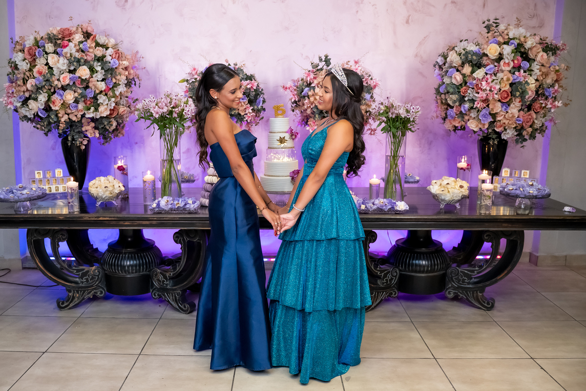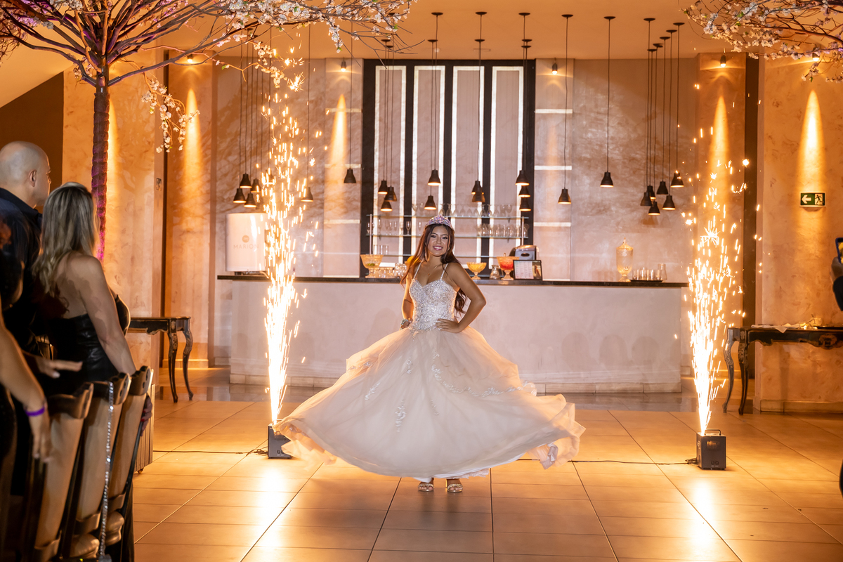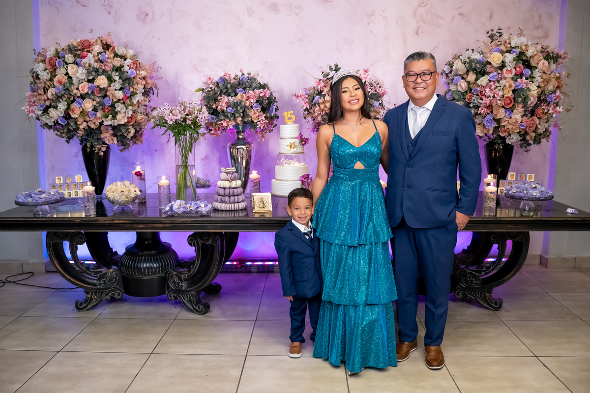 Sua primeira entrada foi simplesmente emocionante: vestida com o traje da valsa, ela desceu as escadas do Salão Sarah Soleil, enquanto seus pais a aguardavam para dar início à cerimônia. Um momento cheio de significado, que arrancou aplausos e olhares emocionados. Em seguida, a pista se transformou em palco para uma linda sequência de valsas, dançadas com os pais, o irmão, o tio e o avô, celebrando o amor, a família e essa nova fase da vida.