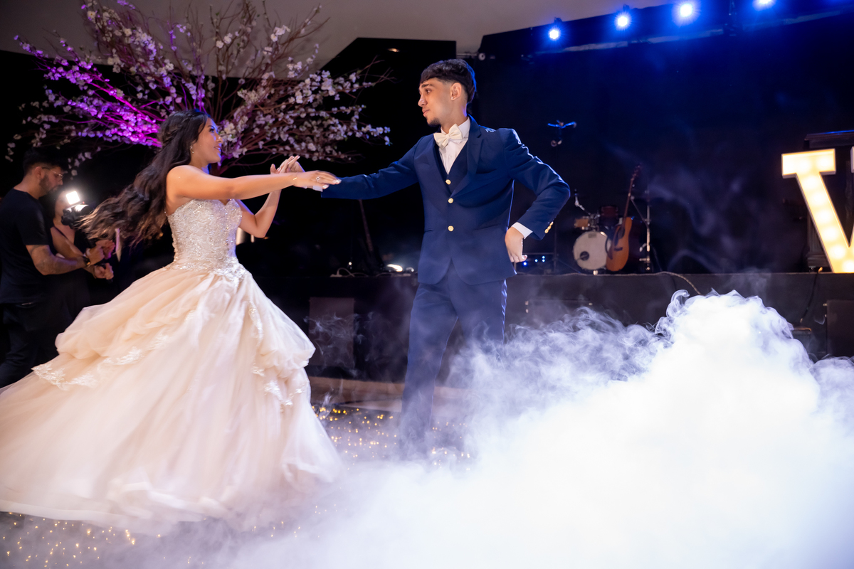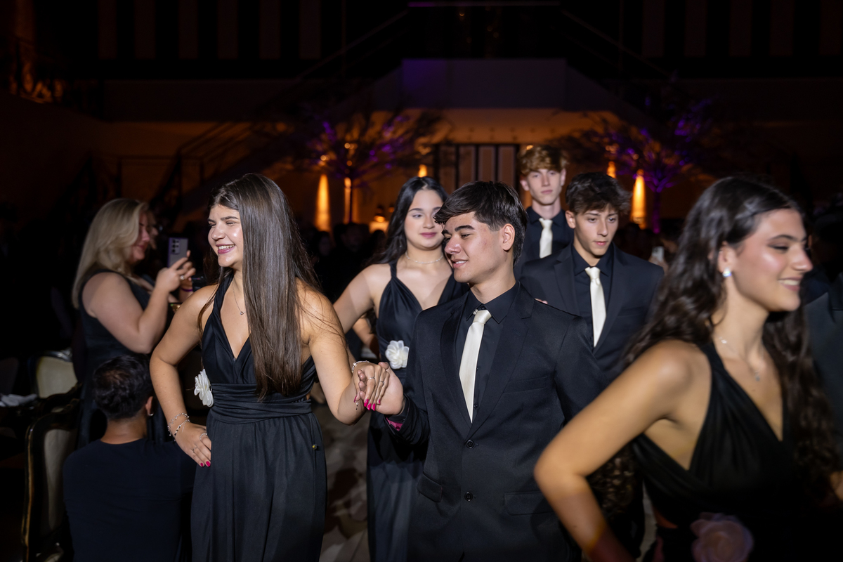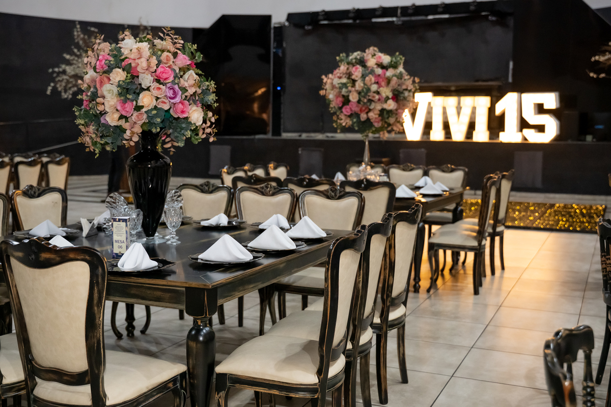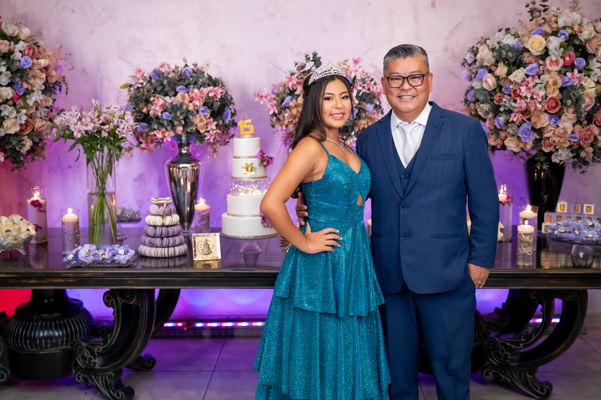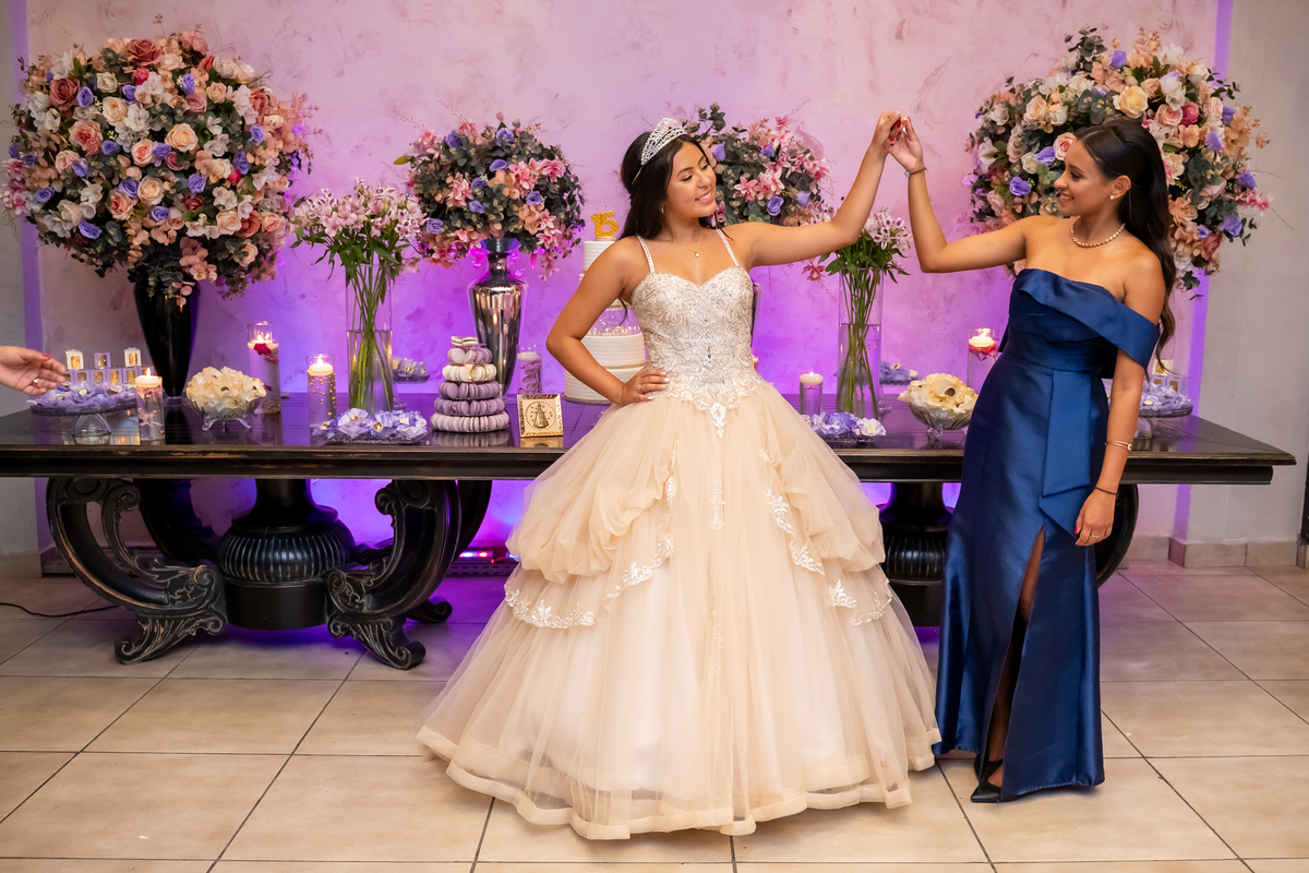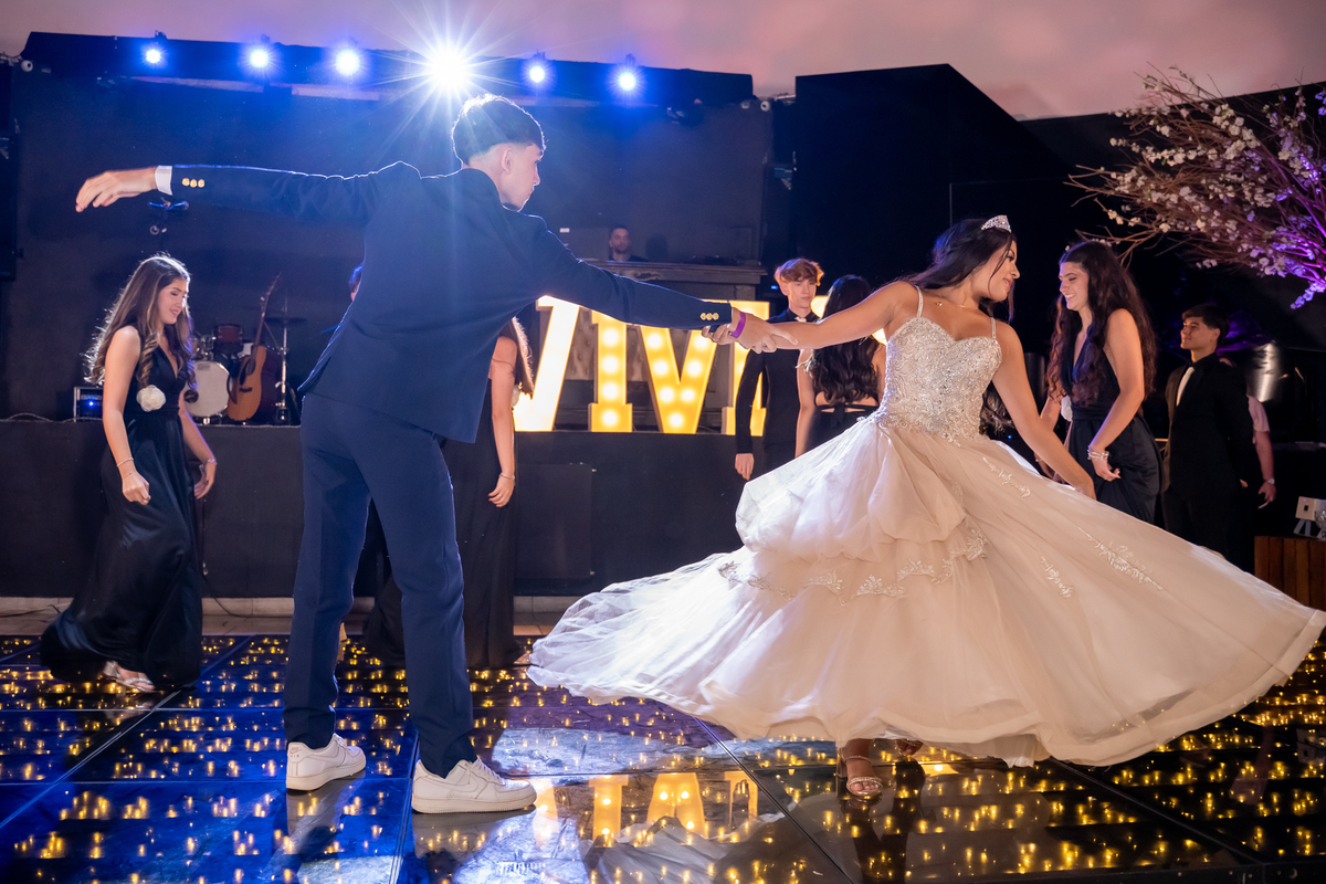 Sua primeira entrada foi simplesmente emocionante: vestida com o traje da valsa, ela desceu as escadas do Salão Sarah Soleil, enquanto seus pais a aguardavam para dar início à cerimônia. Um momento cheio de significado, que arrancou aplausos e olhares emocionados. Em seguida, a pista se transformou em palco para uma linda sequência de valsas, dançadas com os pais, o irmão, o tio e o avô, celebrando o amor, a família e essa nova fase da vida.