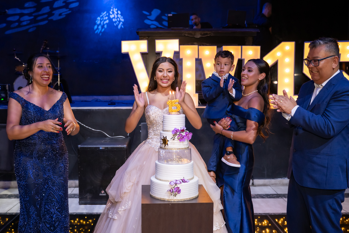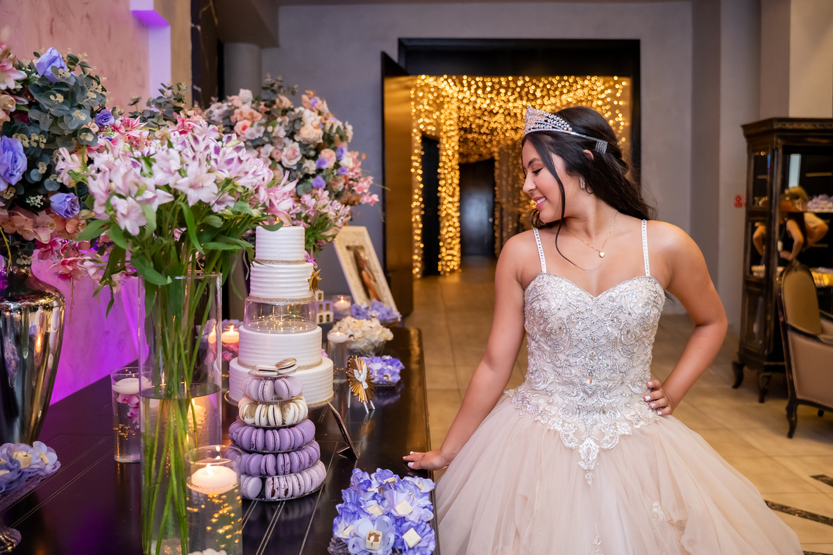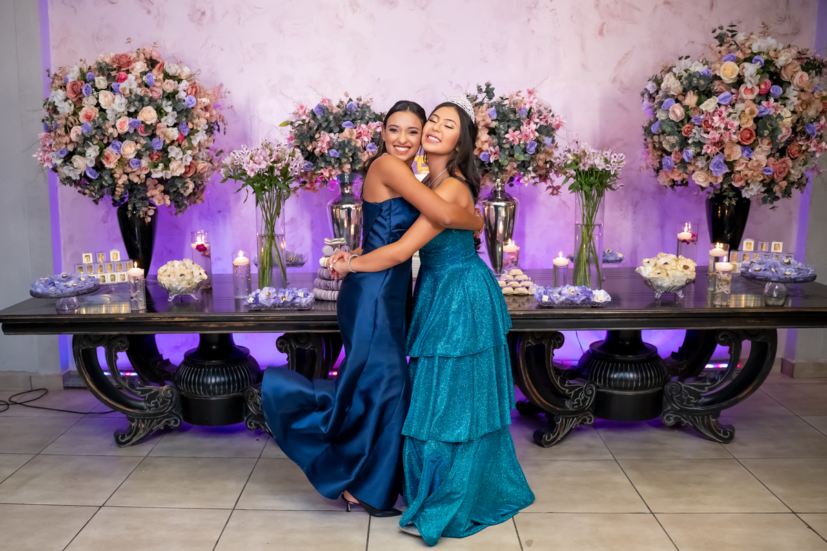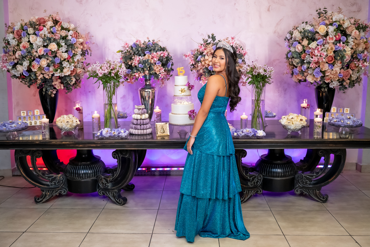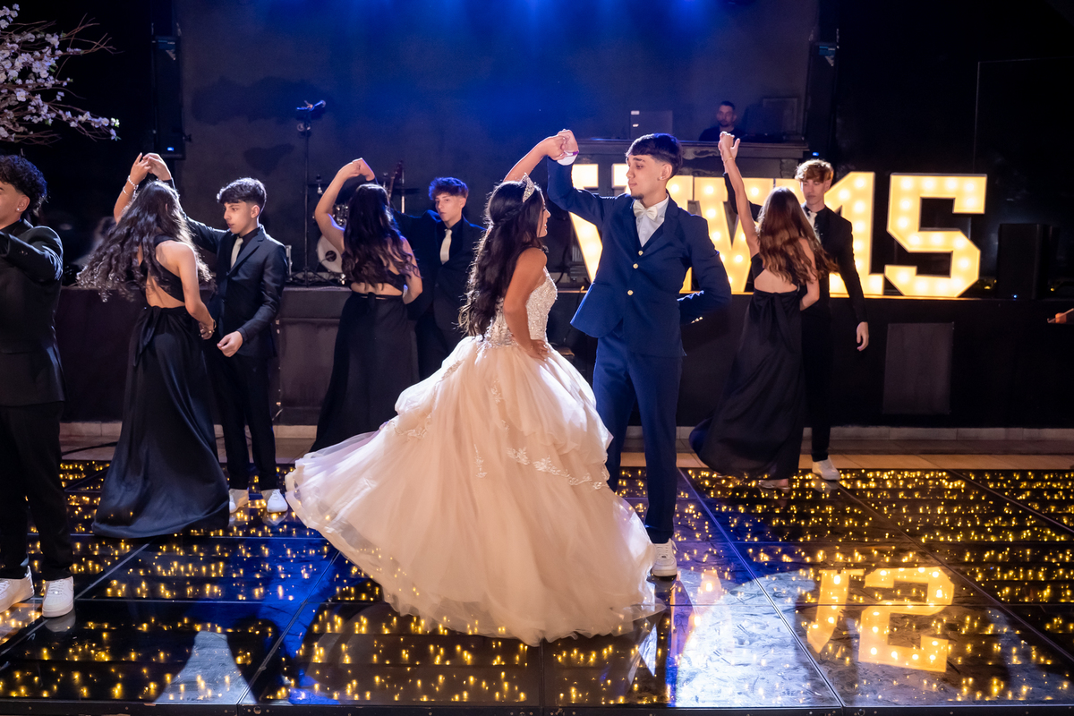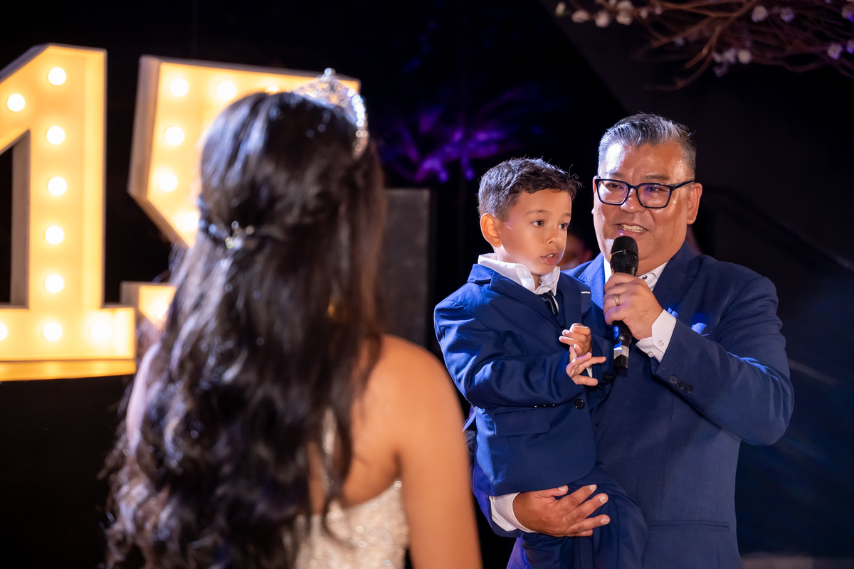 Sua primeira entrada foi simplesmente emocionante: vestida com o traje da valsa, ela desceu as escadas do Salão Sarah Soleil, enquanto seus pais a aguardavam para dar início à cerimônia. Um momento cheio de significado, que arrancou aplausos e olhares emocionados. Em seguida, a pista se transformou em palco para uma linda sequência de valsas, dançadas com os pais, o irmão, o tio e o avô, celebrando o amor, a família e essa nova fase da vida.