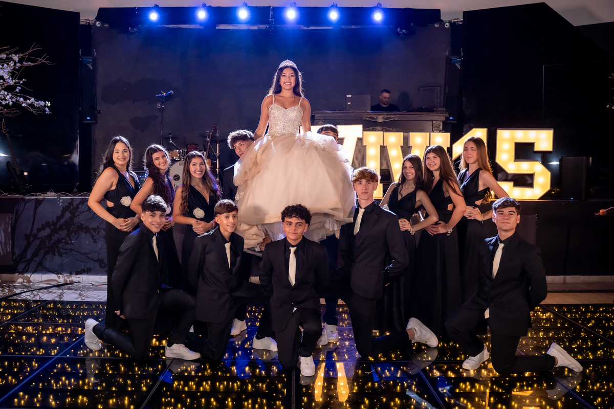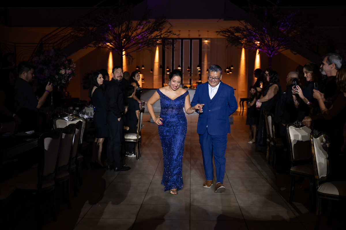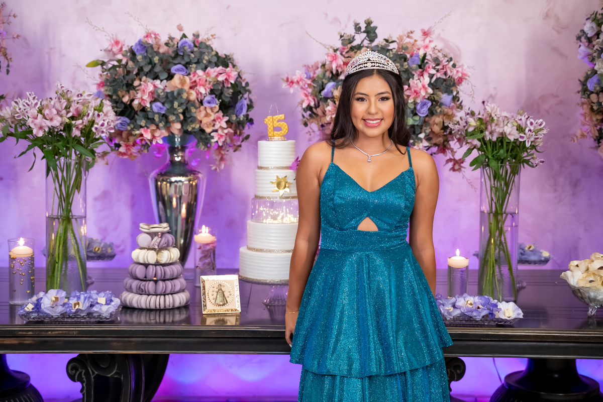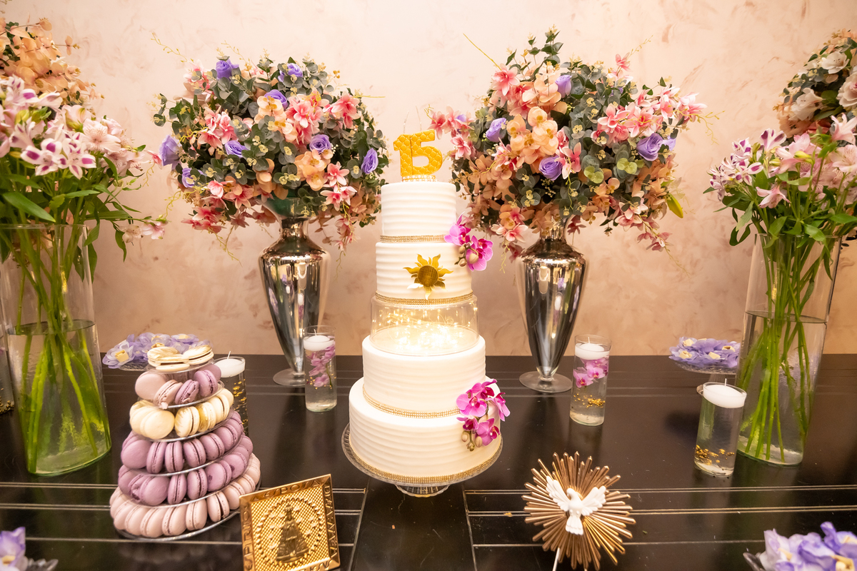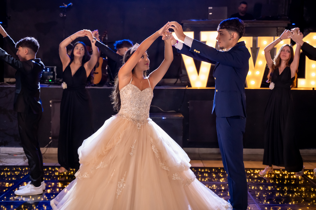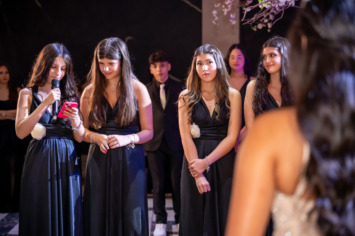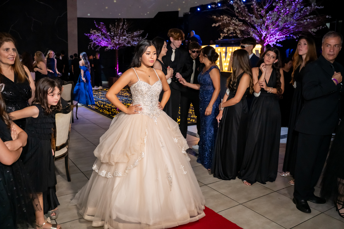 Sua primeira entrada foi simplesmente emocionante: vestida com o traje da valsa, ela desceu as escadas do Salão Sarah Soleil, enquanto seus pais a aguardavam para dar início à cerimônia. Um momento cheio de significado, que arrancou aplausos e olhares emocionados. Em seguida, a pista se transformou em palco para uma linda sequência de valsas, dançadas com os pais, o irmão, o tio e o avô, celebrando o amor, a família e essa nova fase da vida.