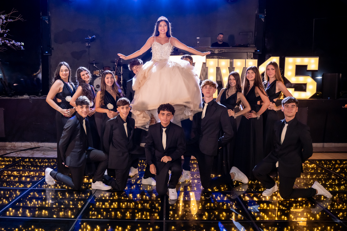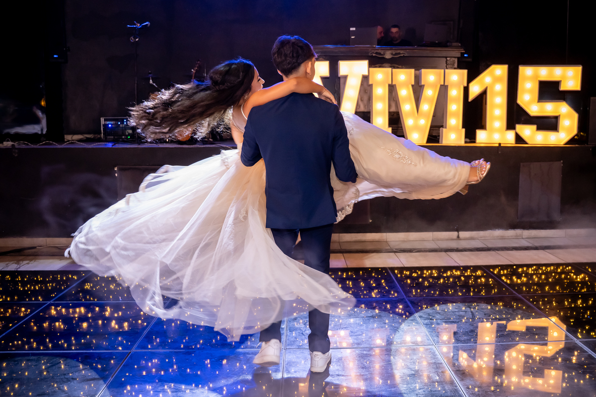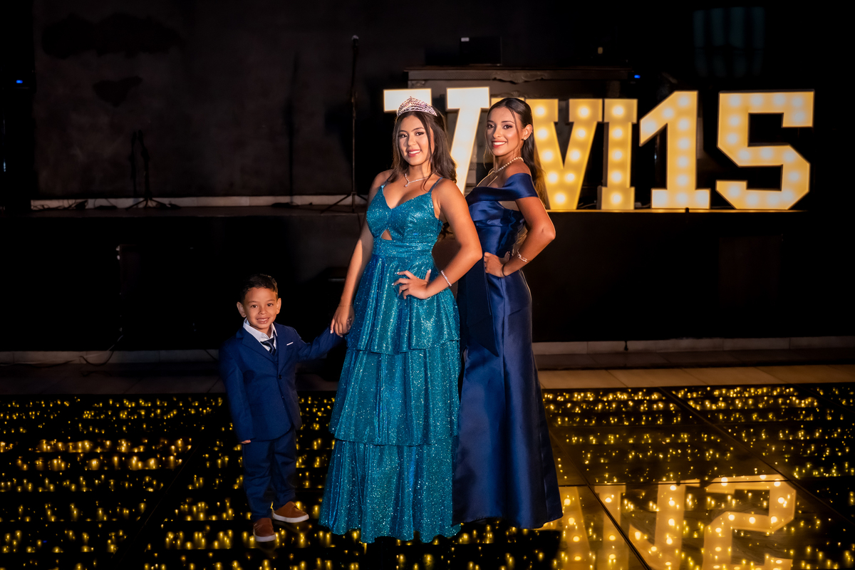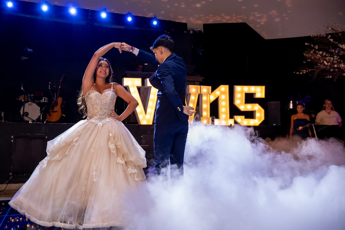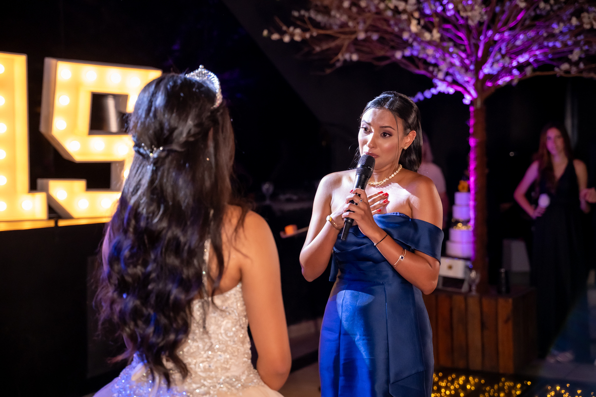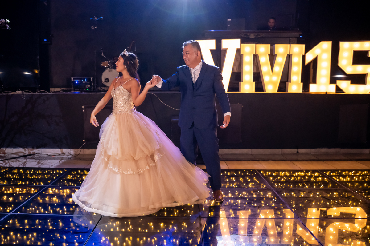 Sua primeira entrada foi simplesmente emocionante: vestida com o traje da valsa, ela desceu as escadas do Salão Sarah Soleil, enquanto seus pais a aguardavam para dar início à cerimônia. Um momento cheio de significado, que arrancou aplausos e olhares emocionados. Em seguida, a pista se transformou em palco para uma linda sequência de valsas, dançadas com os pais, o irmão, o tio e o avô, celebrando o amor, a família e essa nova fase da vida.