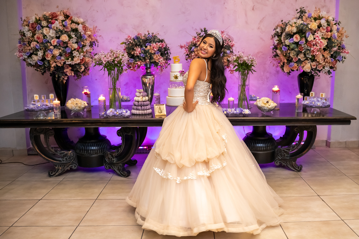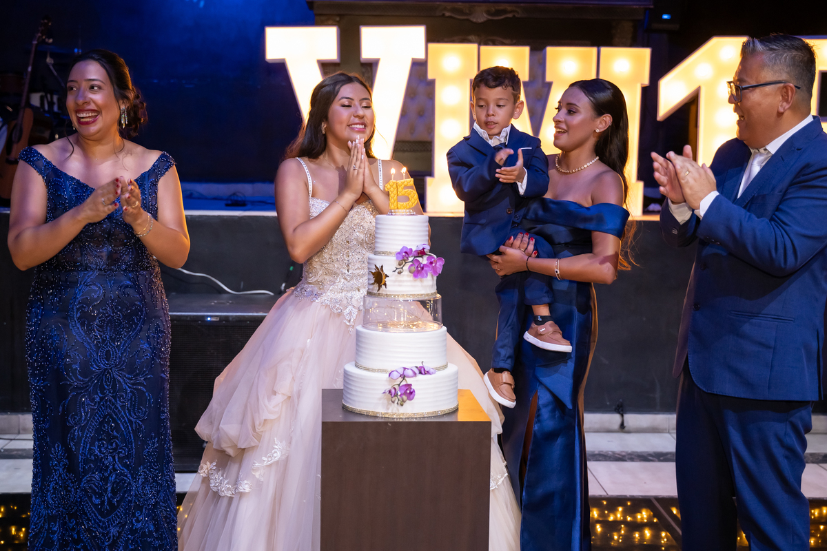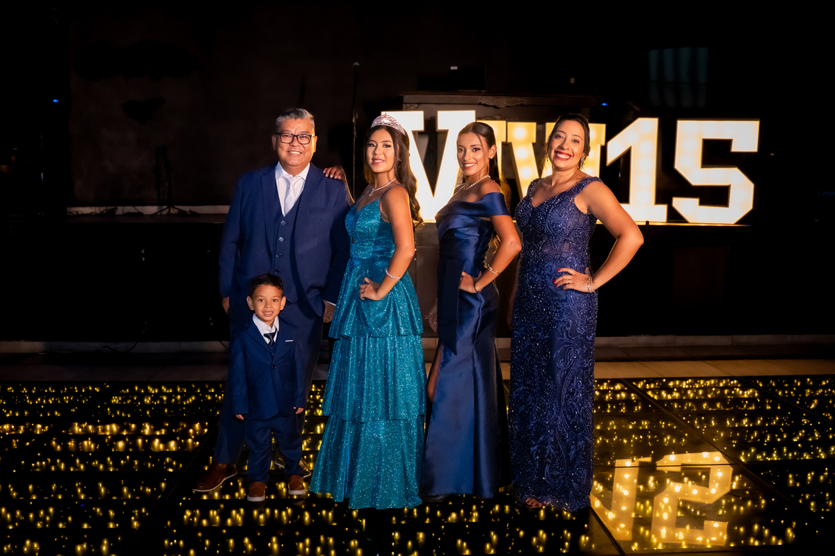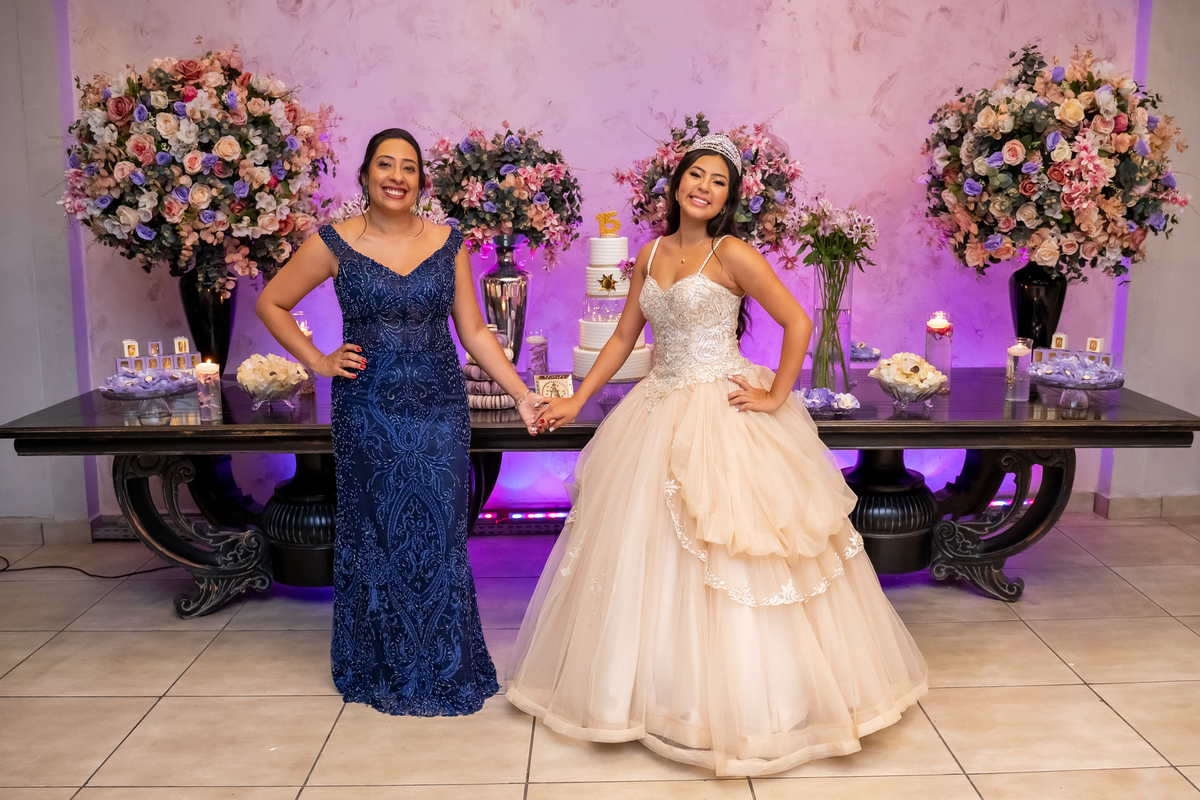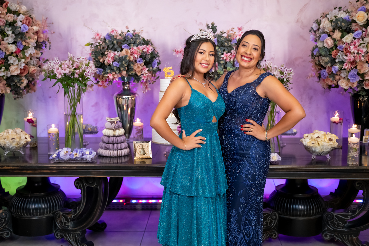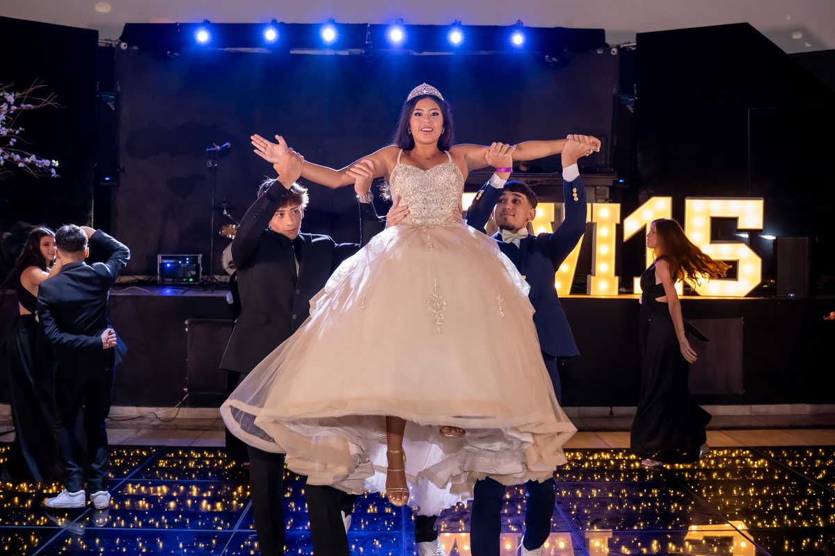 Sua primeira entrada foi simplesmente emocionante: vestida com o traje da valsa, ela desceu as escadas do Salão Sarah Soleil, enquanto seus pais a aguardavam para dar início à cerimônia. Um momento cheio de significado, que arrancou aplausos e olhares emocionados. Em seguida, a pista se transformou em palco para uma linda sequência de valsas, dançadas com os pais, o irmão, o tio e o avô, celebrando o amor, a família e essa nova fase da vida.