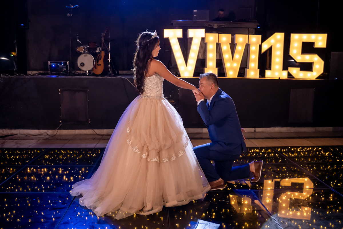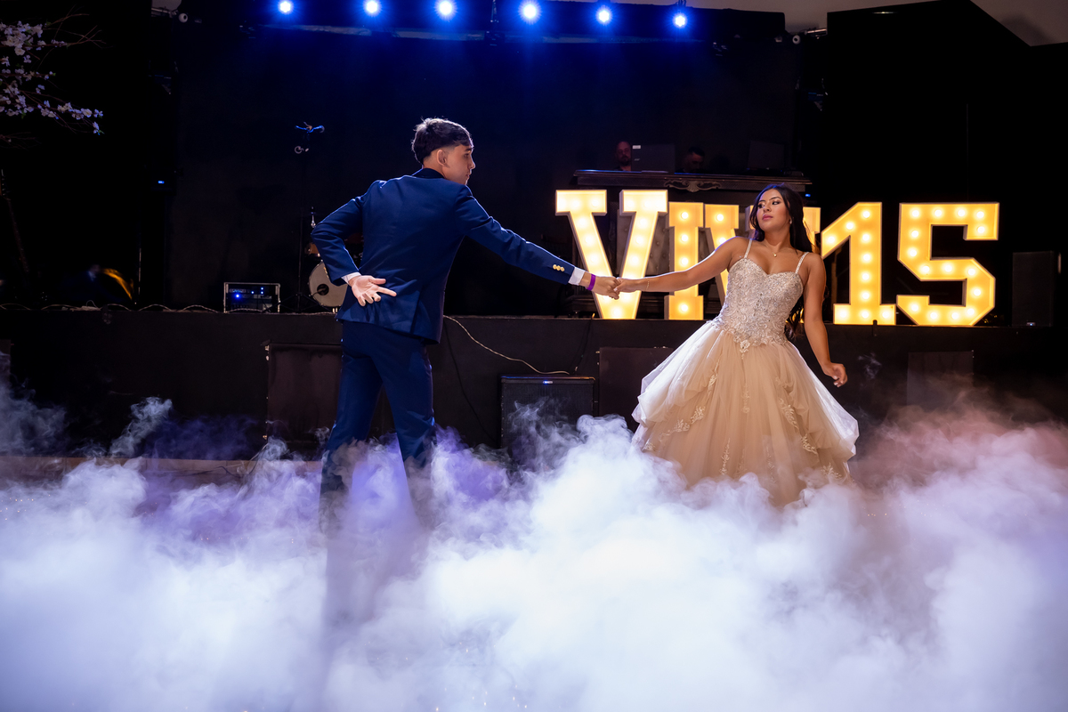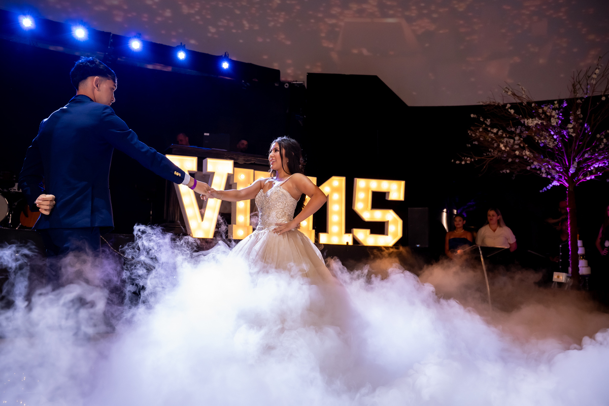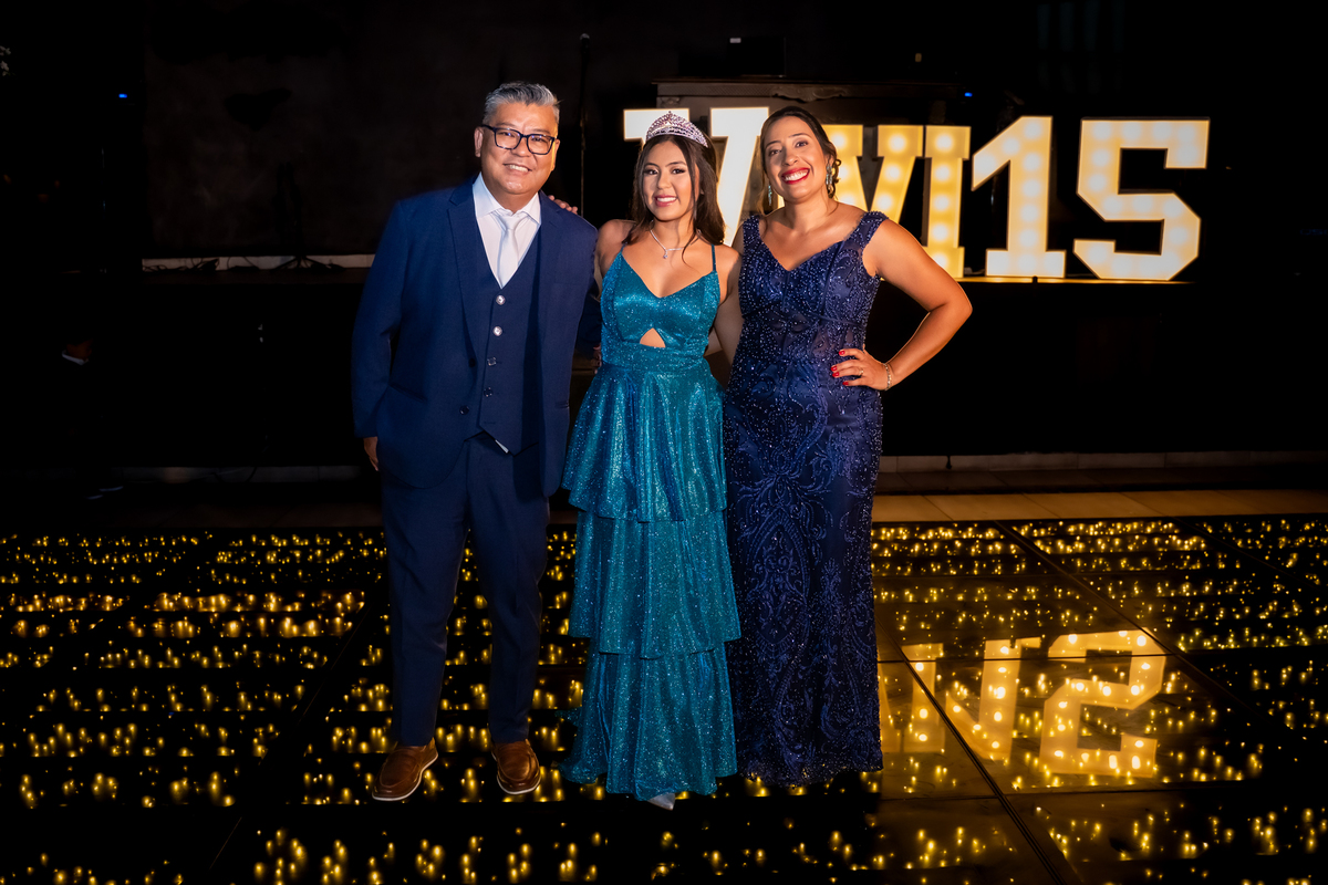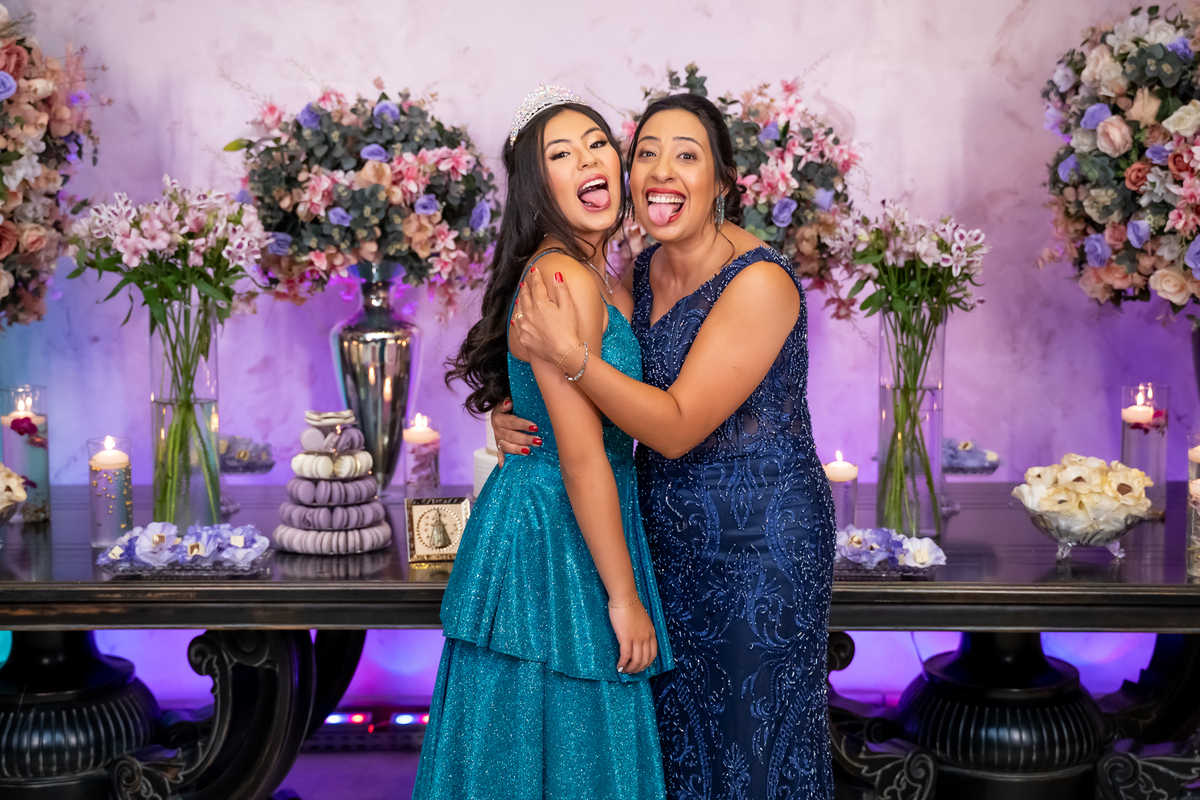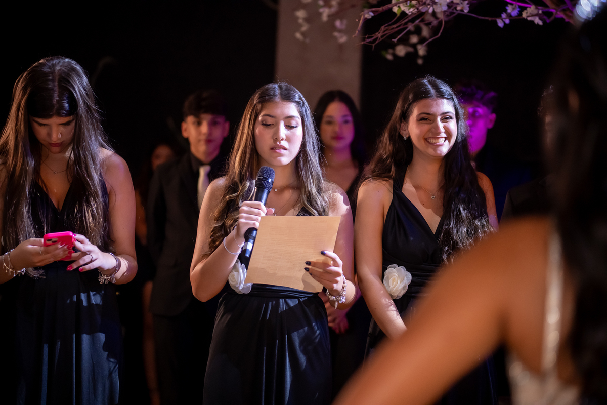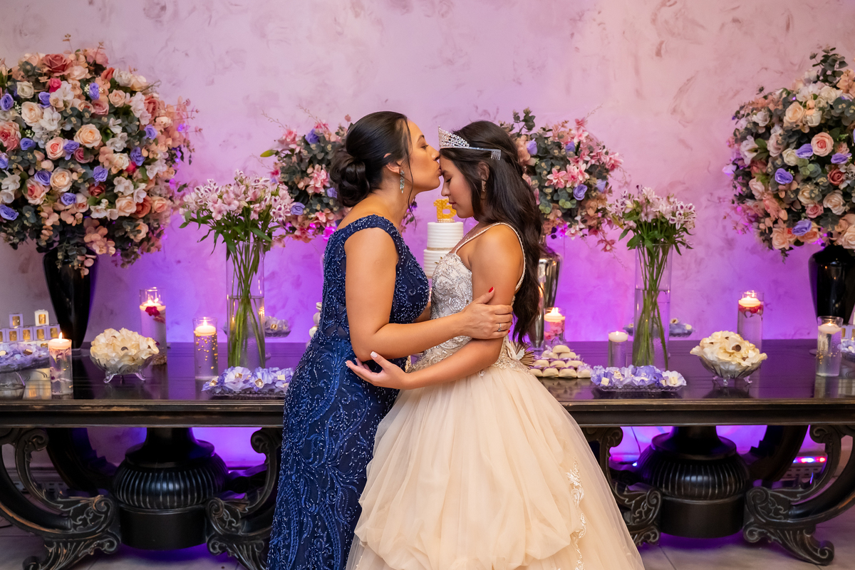 Sua primeira entrada foi simplesmente emocionante: vestida com o traje da valsa, ela desceu as escadas do Salão Sarah Soleil, enquanto seus pais a aguardavam para dar início à cerimônia. Um momento cheio de significado, que arrancou aplausos e olhares emocionados. Em seguida, a pista se transformou em palco para uma linda sequência de valsas, dançadas com os pais, o irmão, o tio e o avô, celebrando o amor, a família e essa nova fase da vida.