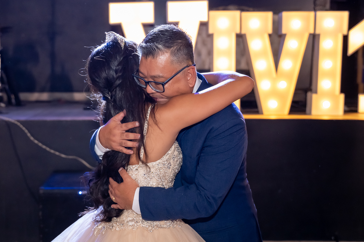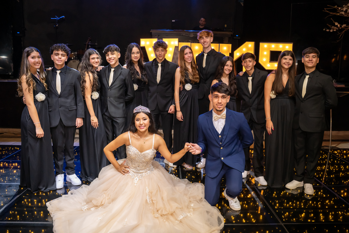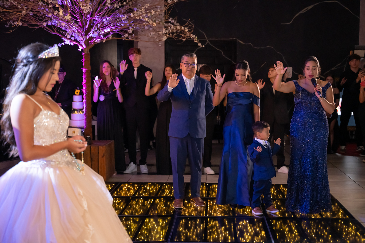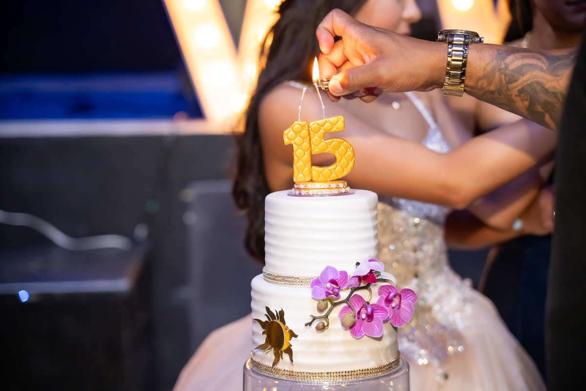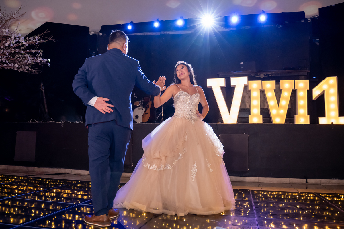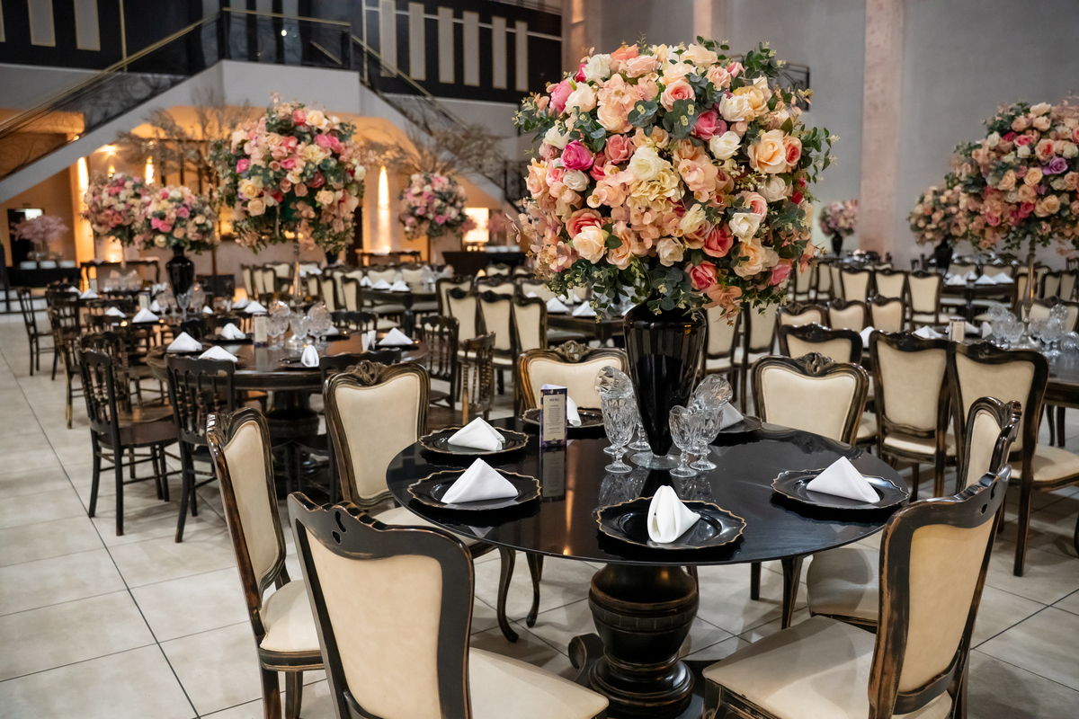 Sua primeira entrada foi simplesmente emocionante: vestida com o traje da valsa, ela desceu as escadas do Salão Sarah Soleil, enquanto seus pais a aguardavam para dar início à cerimônia. Um momento cheio de significado, que arrancou aplausos e olhares emocionados. Em seguida, a pista se transformou em palco para uma linda sequência de valsas, dançadas com os pais, o irmão, o tio e o avô, celebrando o amor, a família e essa nova fase da vida.