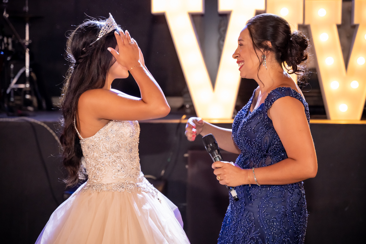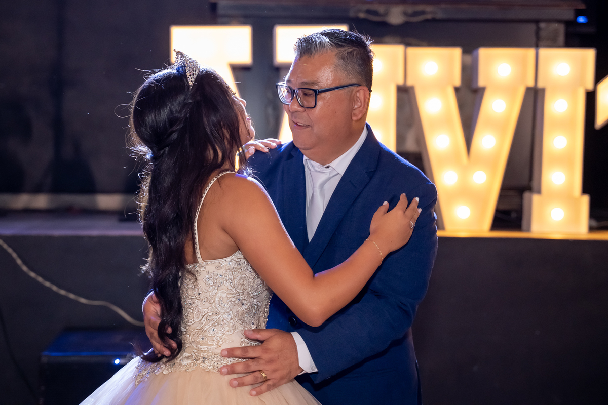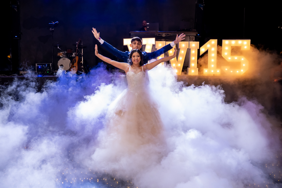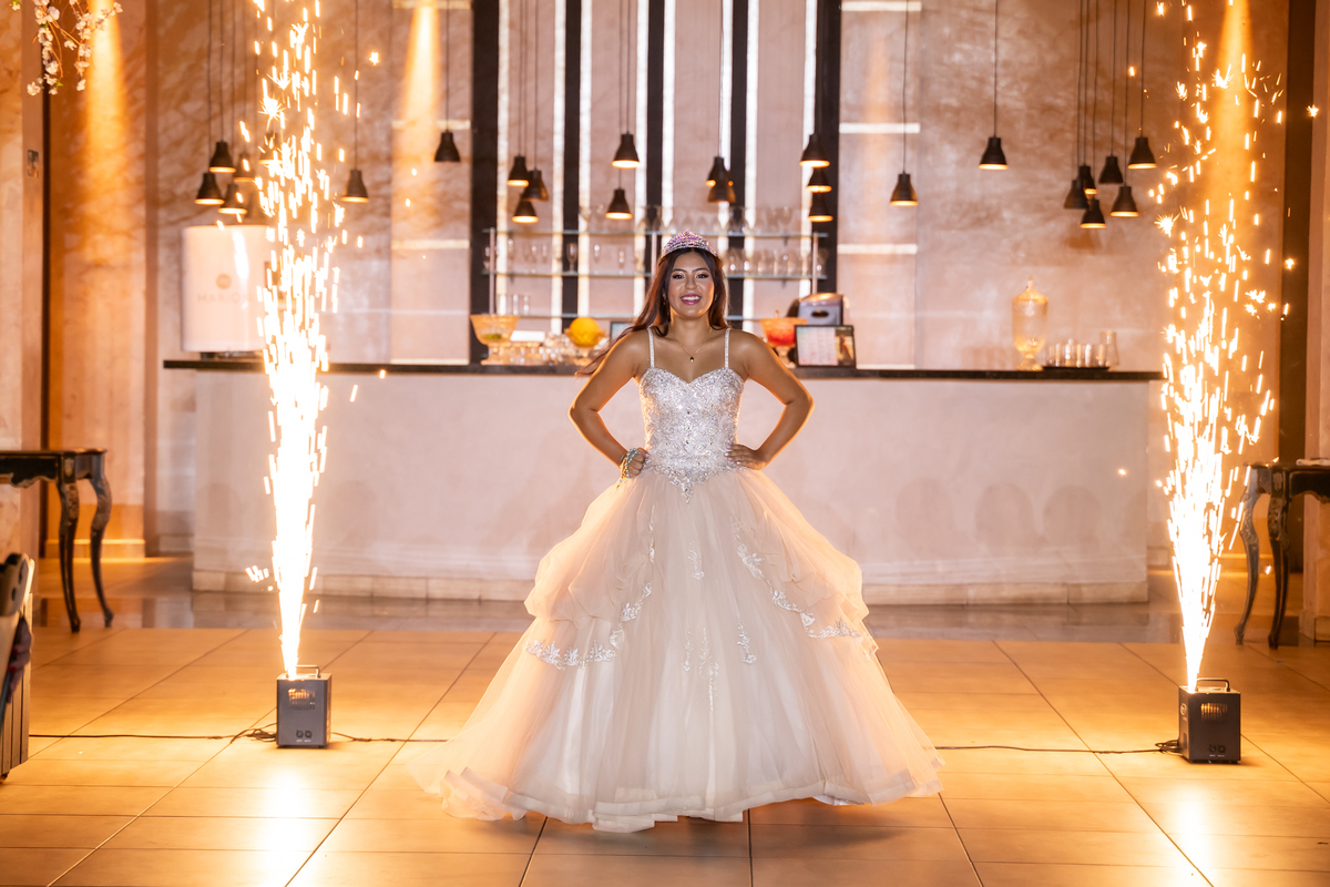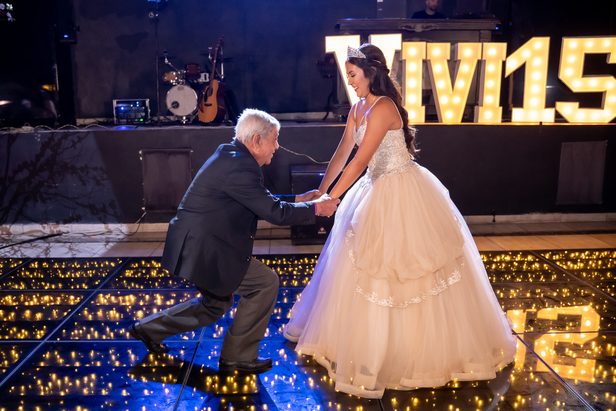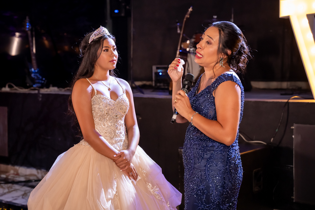 Sua primeira entrada foi simplesmente emocionante: vestida com o traje da valsa, ela desceu as escadas do Salão Sarah Soleil, enquanto seus pais a aguardavam para dar início à cerimônia. Um momento cheio de significado, que arrancou aplausos e olhares emocionados. Em seguida, a pista se transformou em palco para uma linda sequência de valsas, dançadas com os pais, o irmão, o tio e o avô, celebrando o amor, a família e essa nova fase da vida.