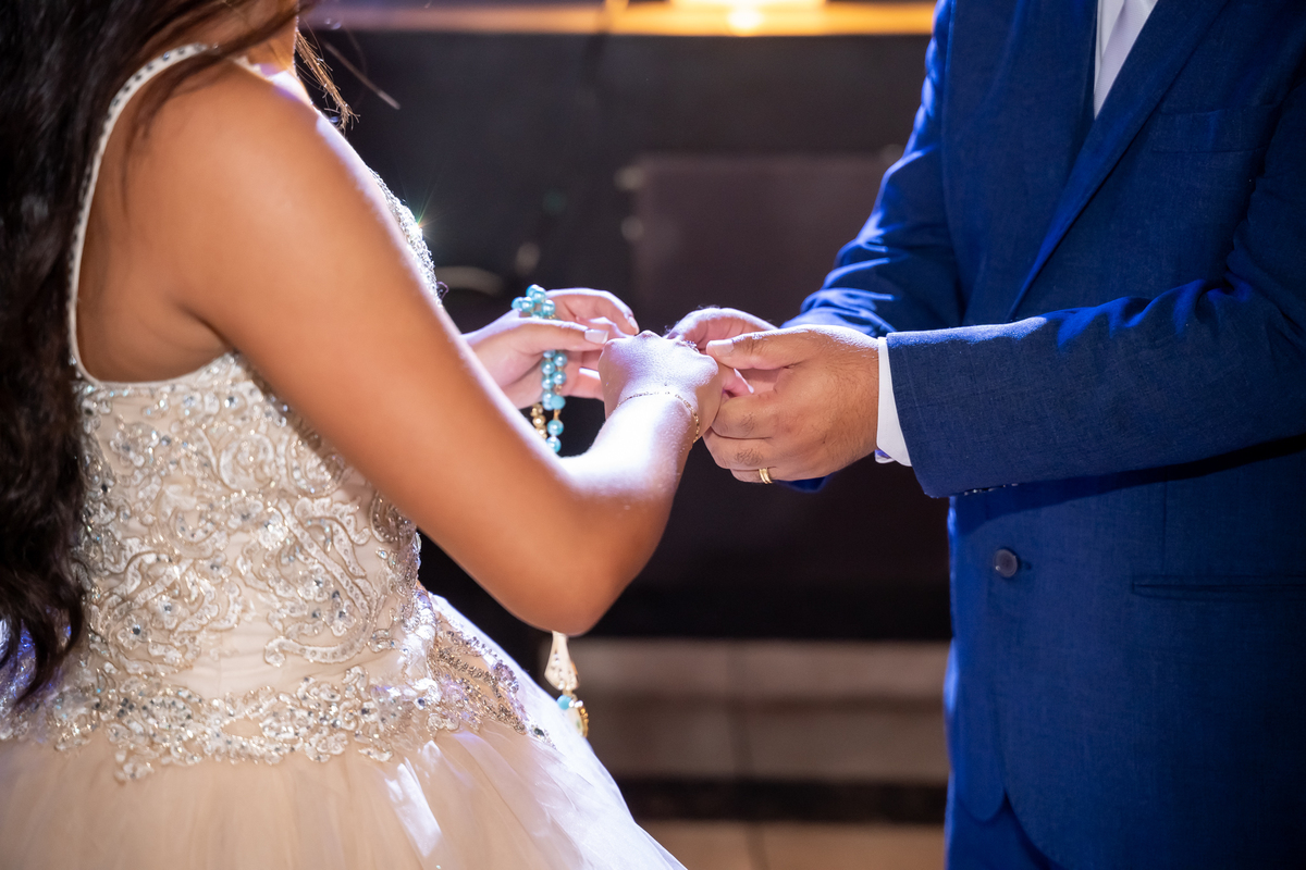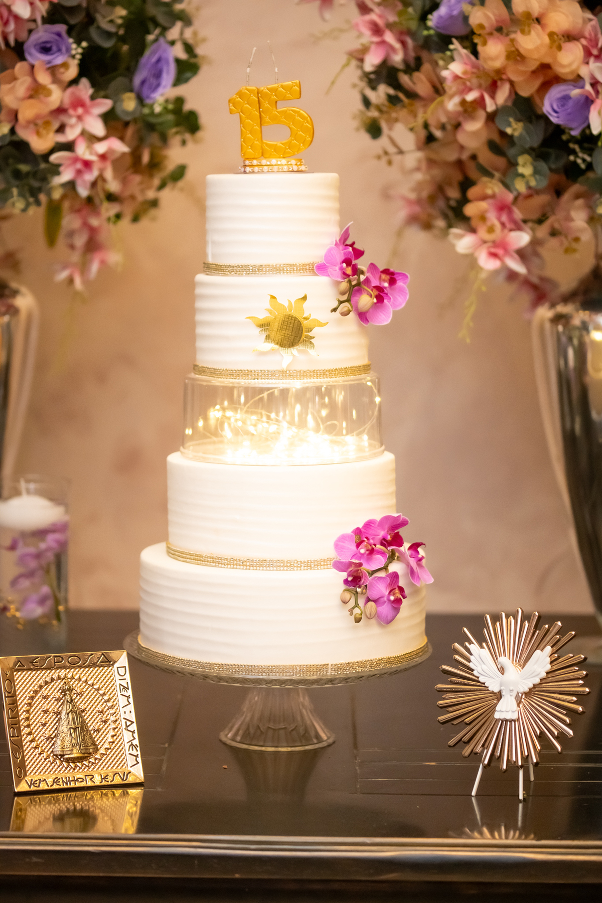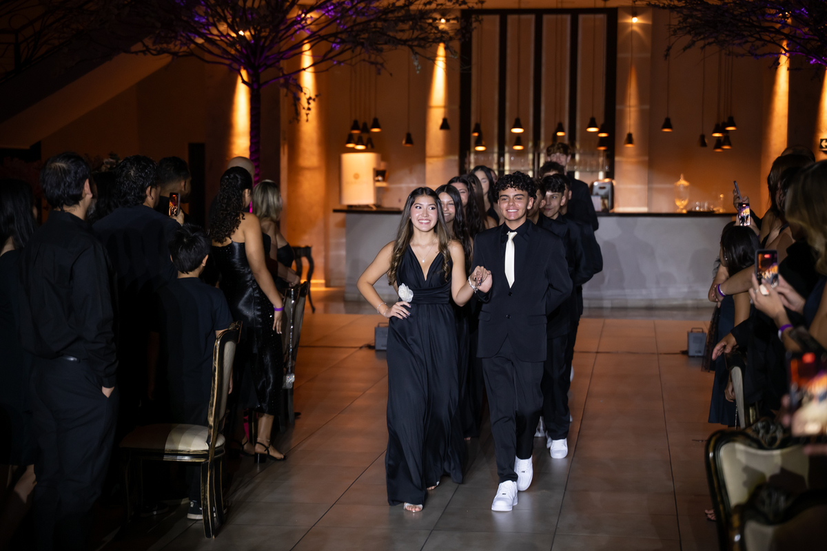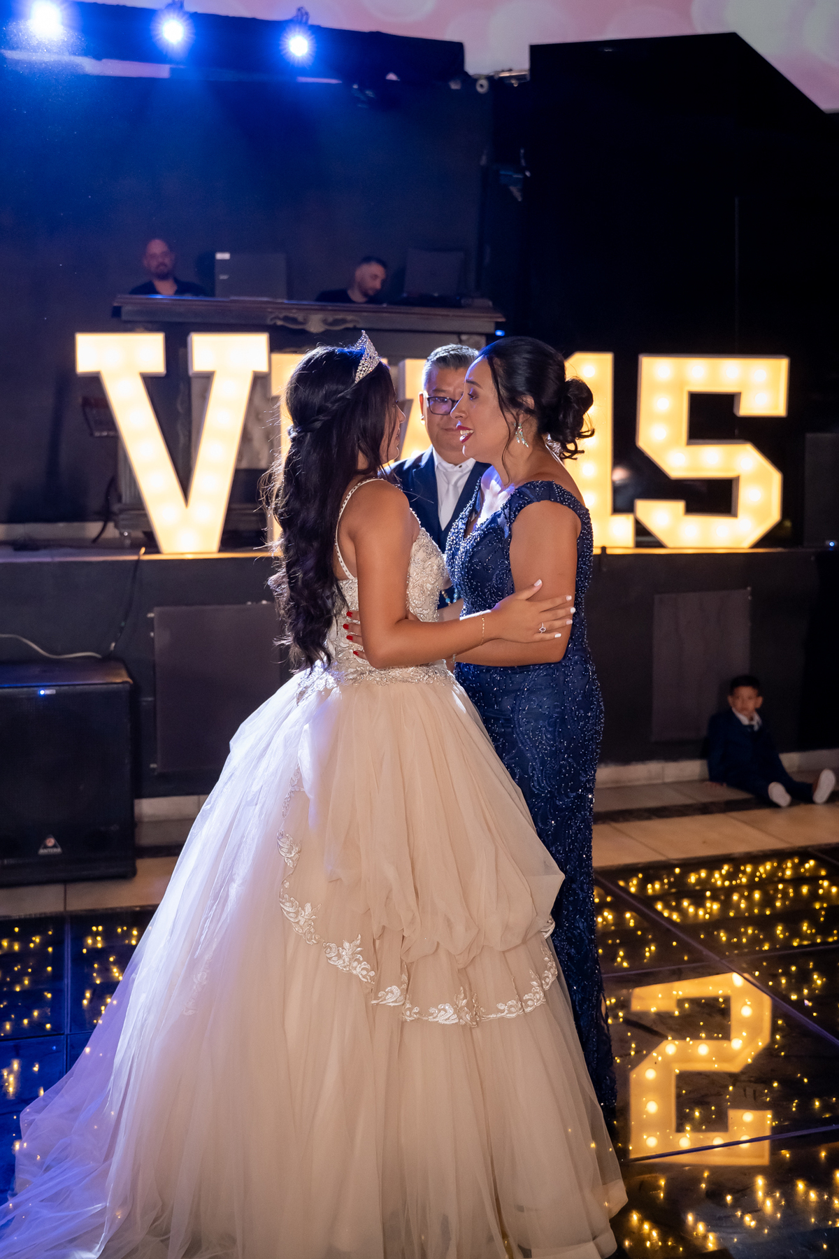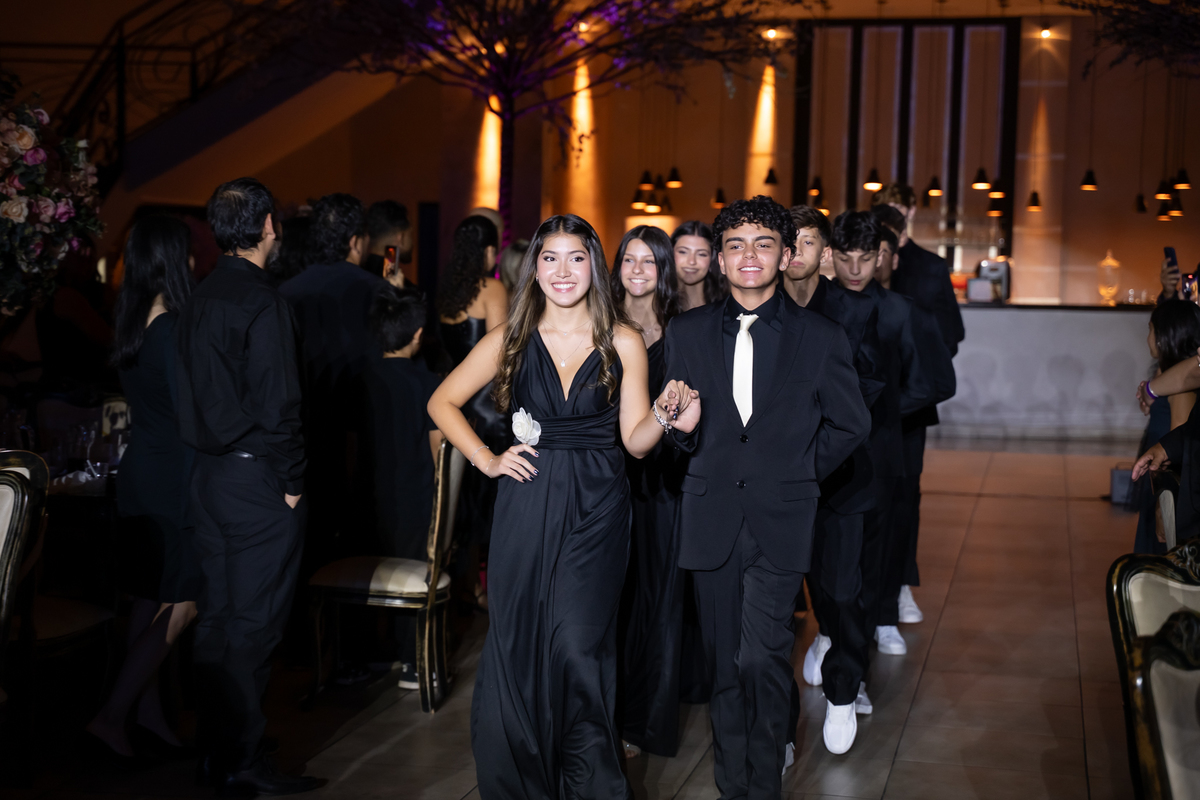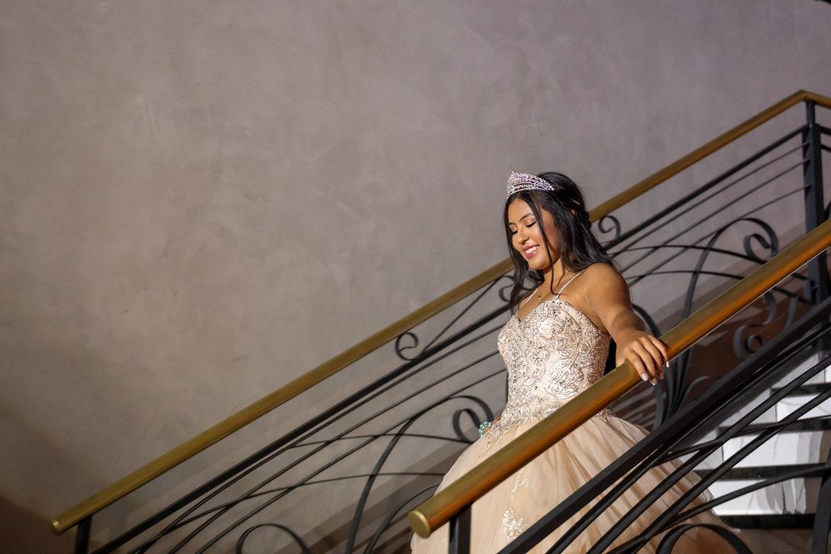 Sua primeira entrada foi simplesmente emocionante: vestida com o traje da valsa, ela desceu as escadas do Salão Sarah Soleil, enquanto seus pais a aguardavam para dar início à cerimônia. Um momento cheio de significado, que arrancou aplausos e olhares emocionados. Em seguida, a pista se transformou em palco para uma linda sequência de valsas, dançadas com os pais, o irmão, o tio e o avô, celebrando o amor, a família e essa nova fase da vida.