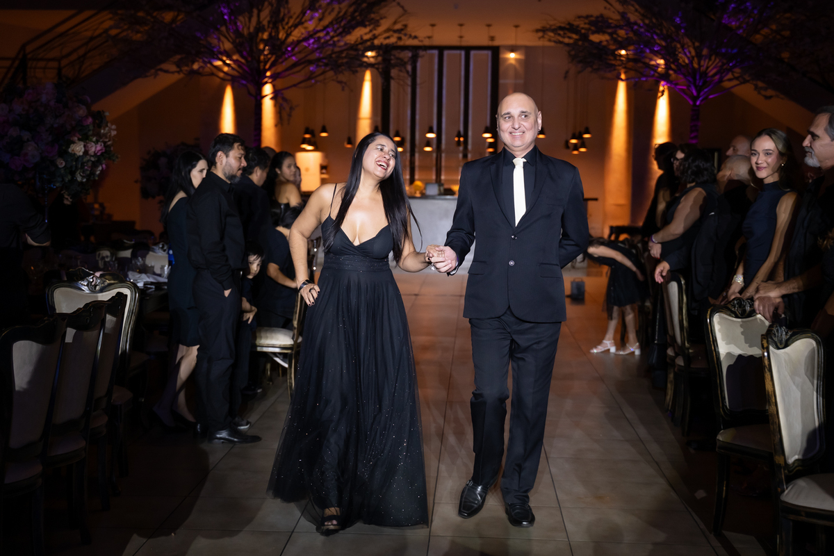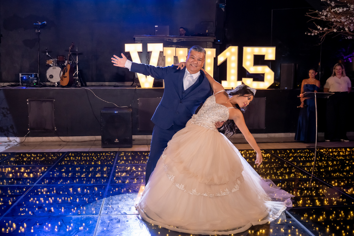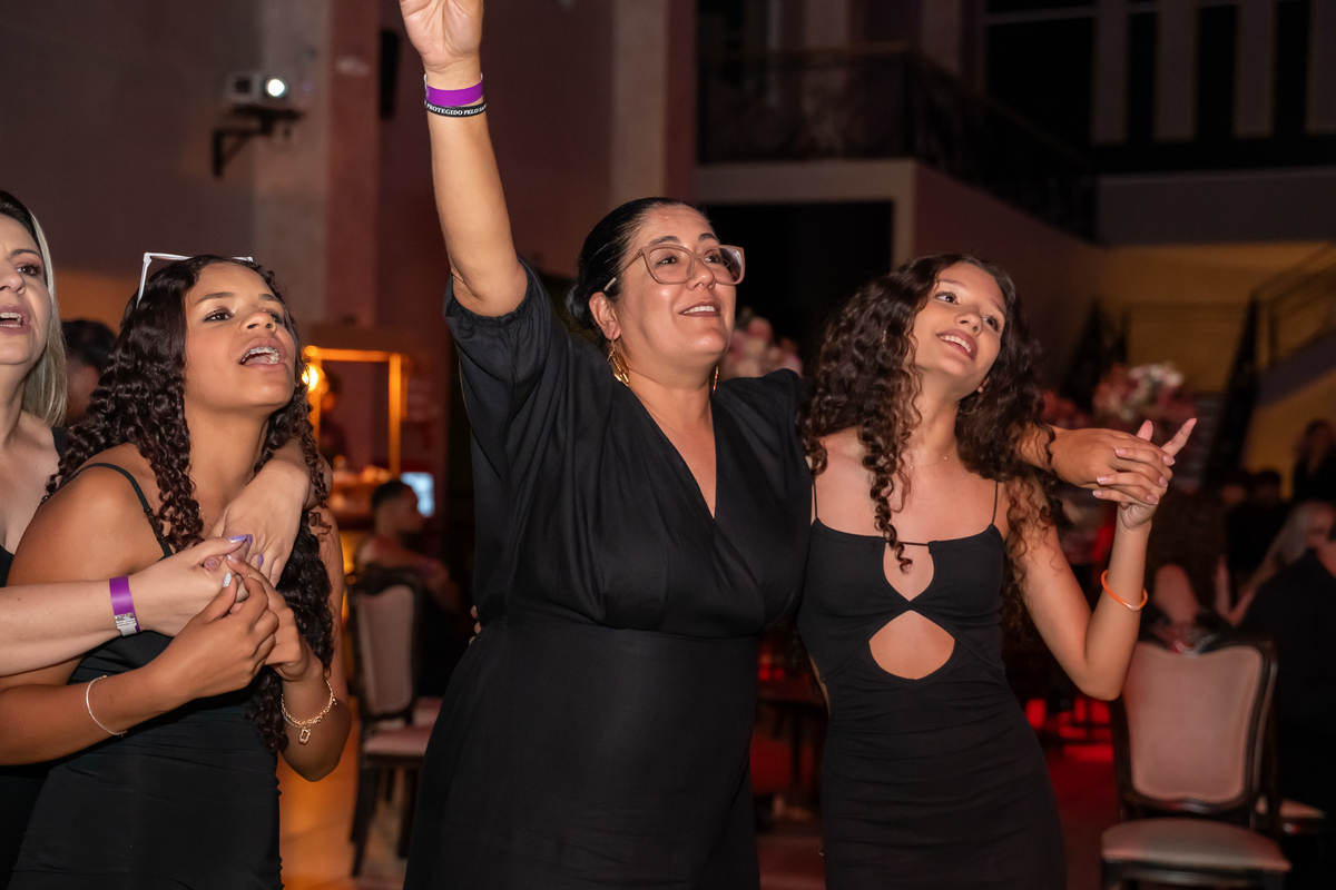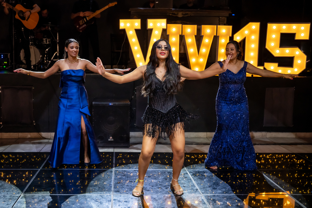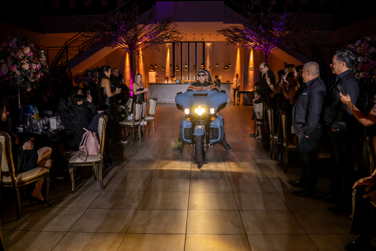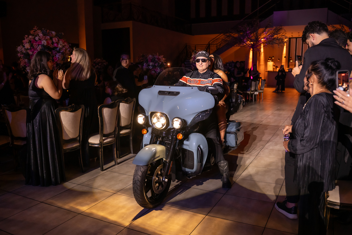 E as surpresas não pararam por aí. Após trocar de figurino, Vitória retornou de forma totalmente inesperada, entrando no salão na garupa de uma moto Harley Davidson, arrancando gritos e aplausos dos convidados. Na sequência, protagonizou uma dança leve e alegre ao lado do pai, da mãe e da irmã, em um momento cheio de cumplicidade e amor.