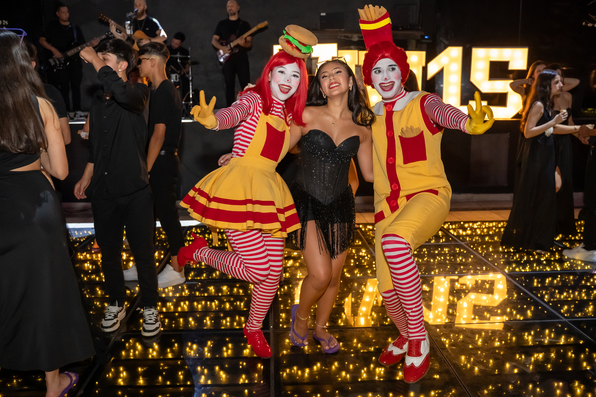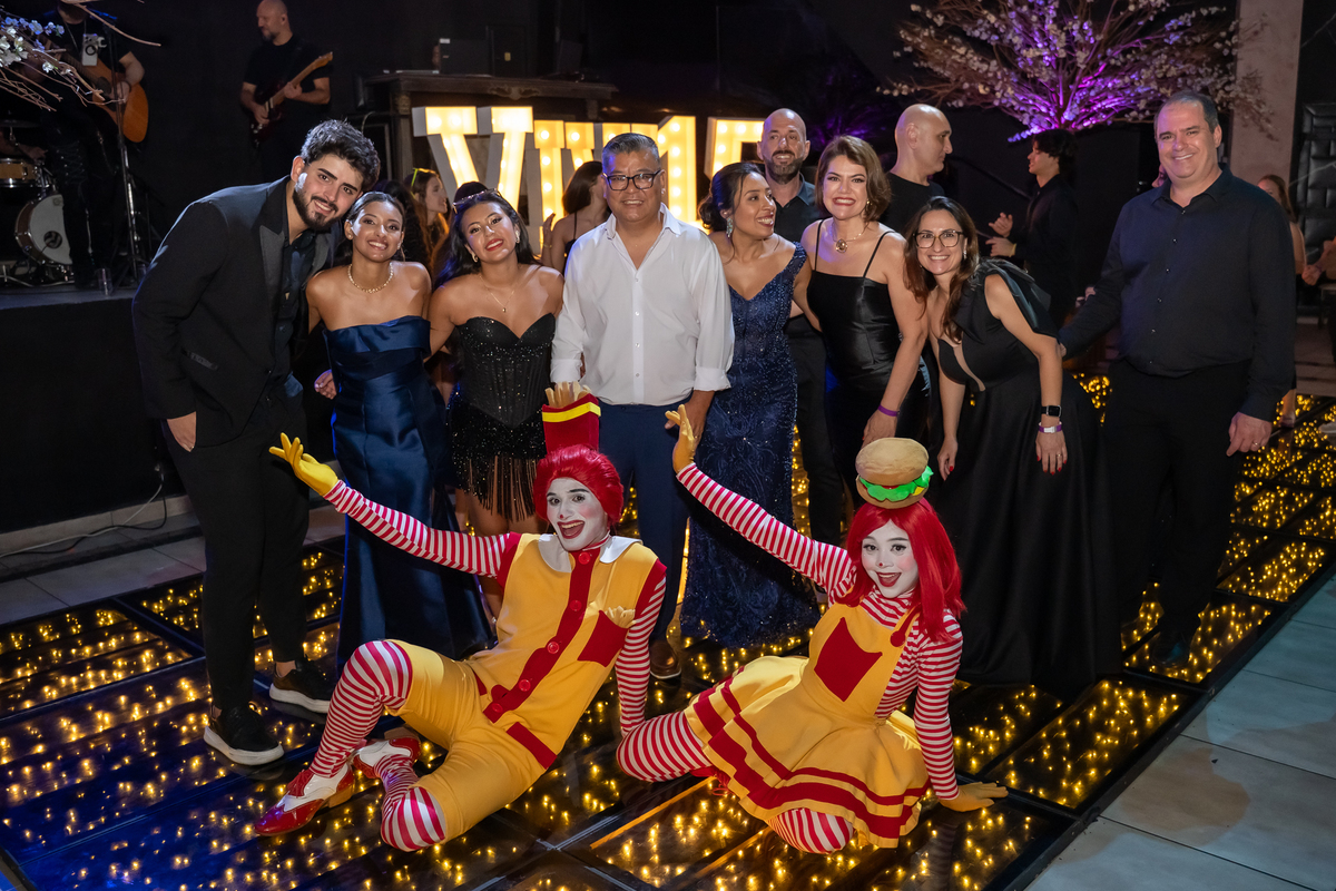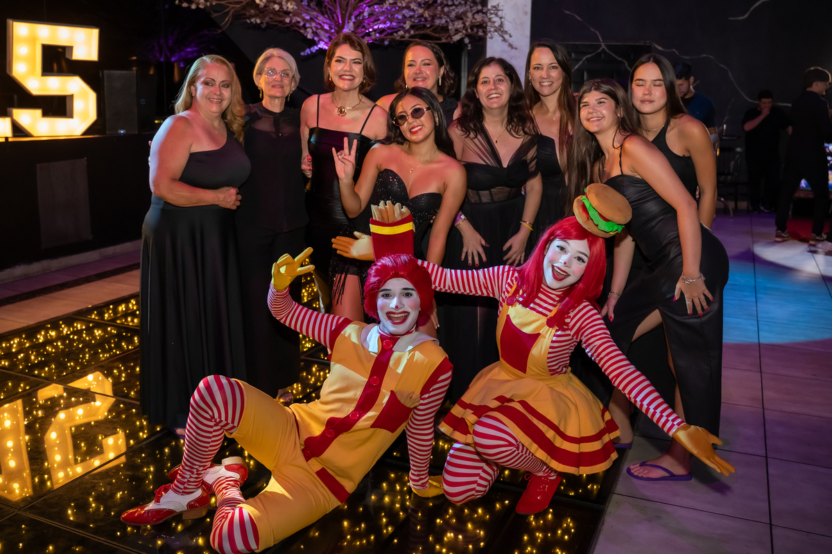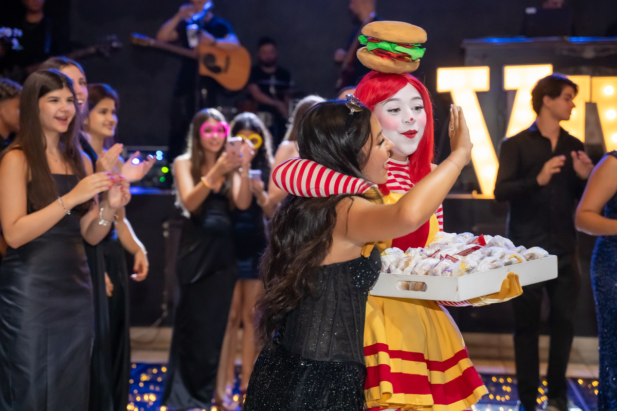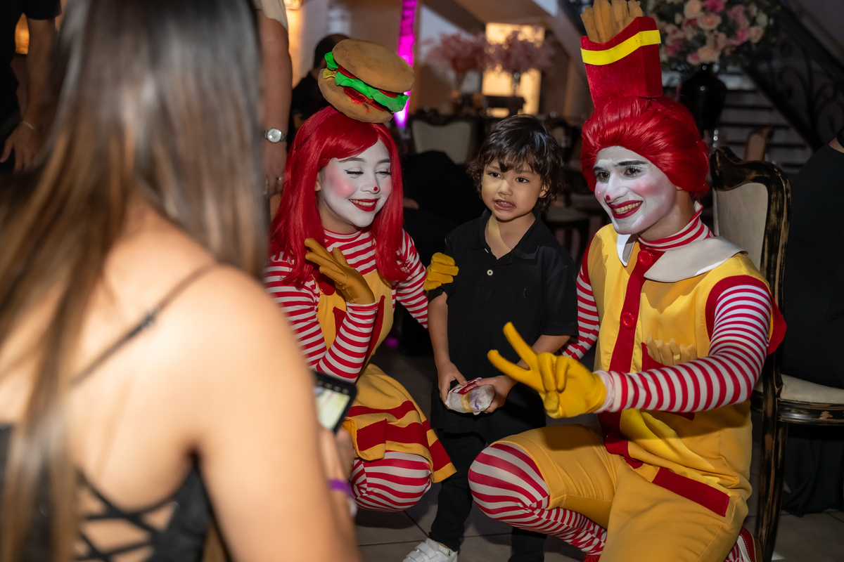A festa seguiu com ainda mais energia quando uma super banda assumiu o palco e agitou a noite. Vitória não resistiu e subiu ao palco para dançar, mostrando toda sua alegria e espontaneidade. De repente, a animação ganhou um toque especial com a chegada da turma do Ronald McDonald’s, levando lanche para todos os convidados. Eles interagiram, tiraram fotos com a galera e deixaram o clima ainda mais descontraído.