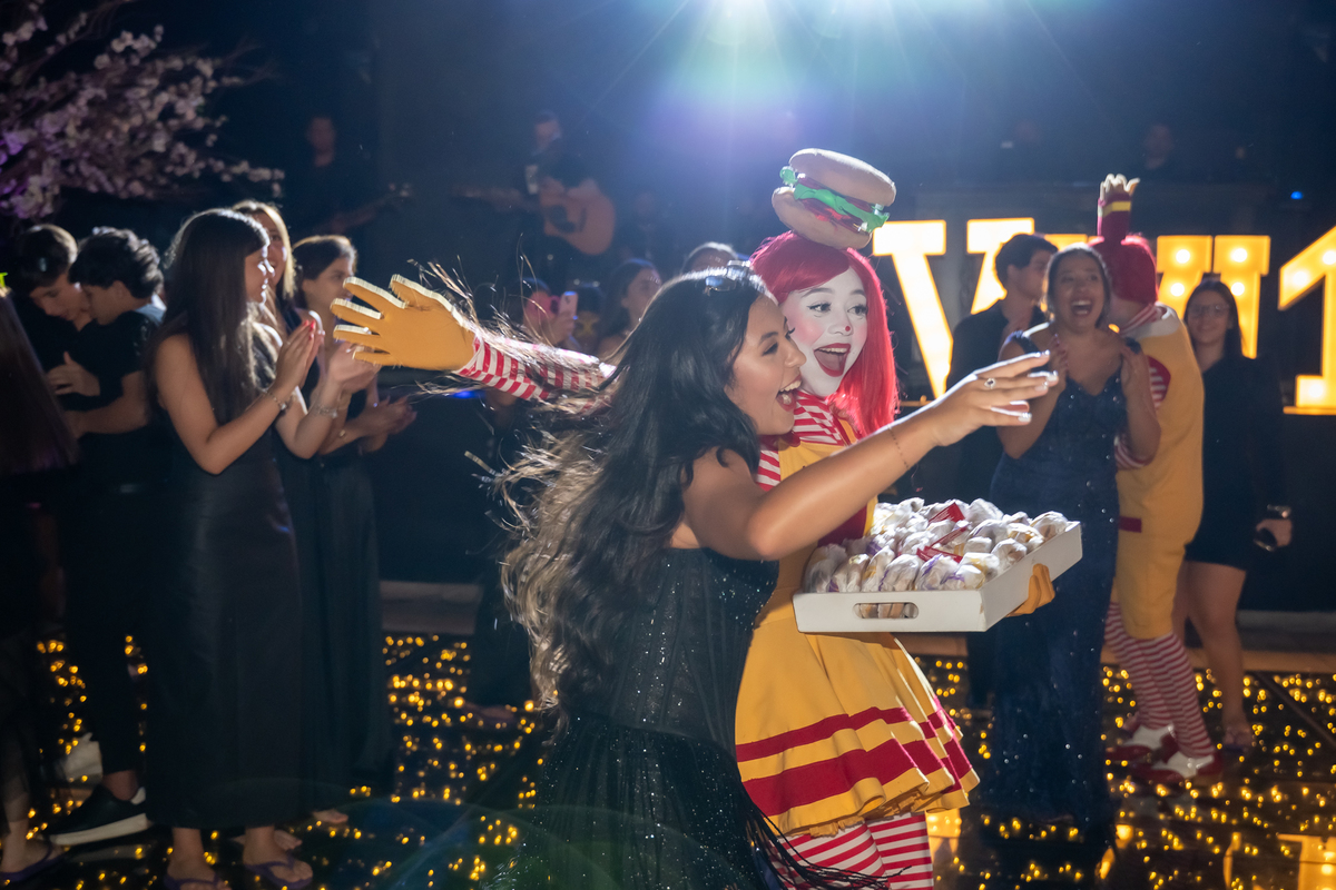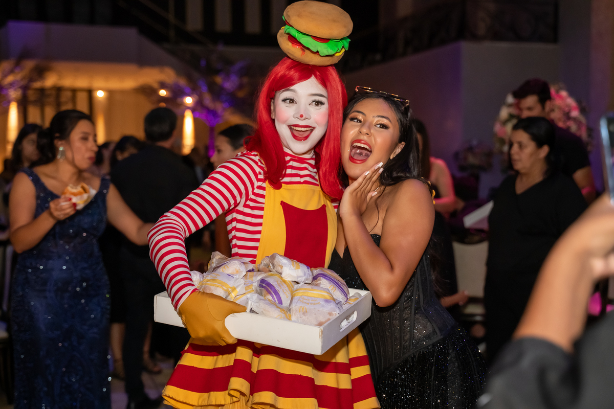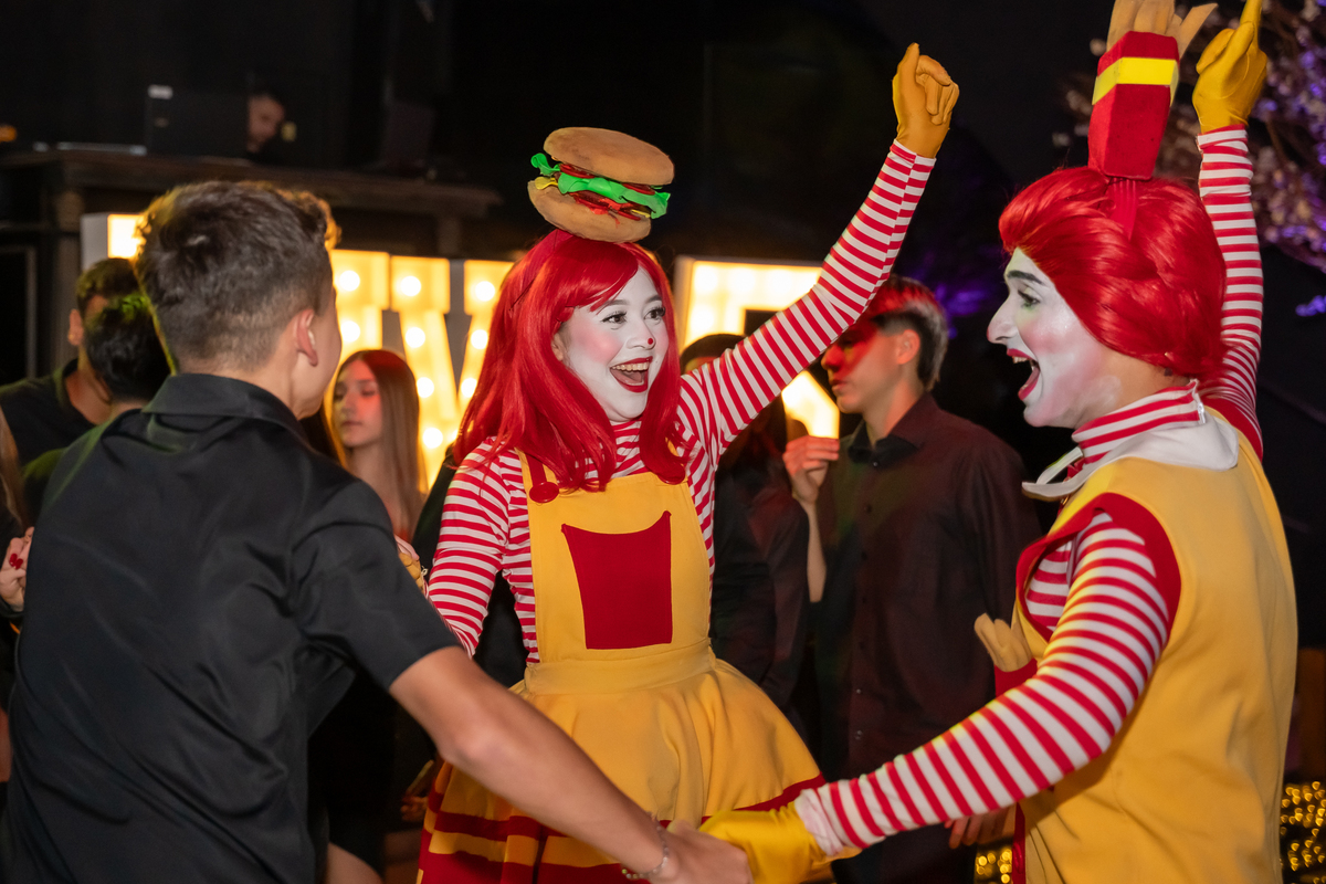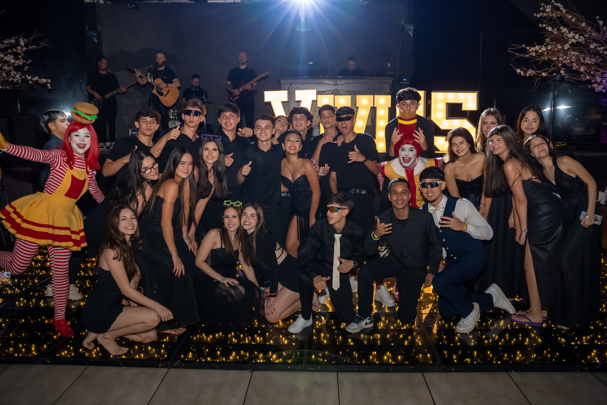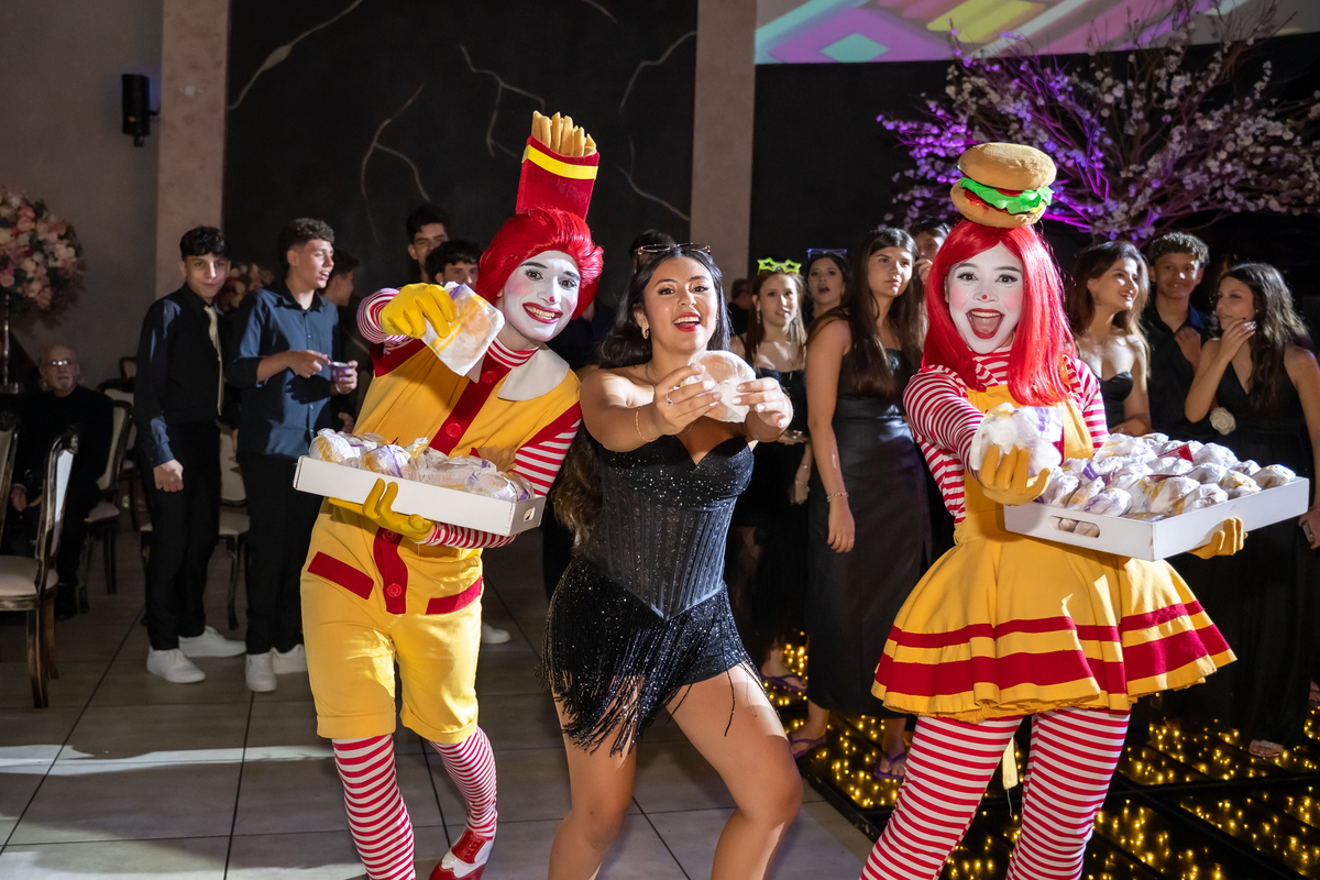 A festa seguiu com ainda mais energia quando uma super banda assumiu o palco e agitou a noite. Vitória não resistiu e subiu ao palco para dançar, mostrando toda sua alegria e espontaneidade. De repente, a animação ganhou um toque especial com a chegada da turma do Ronald McDonald’s, levando lanche para todos os convidados. Eles interagiram, tiraram fotos com a galera e deixaram o clima ainda mais descontraído.