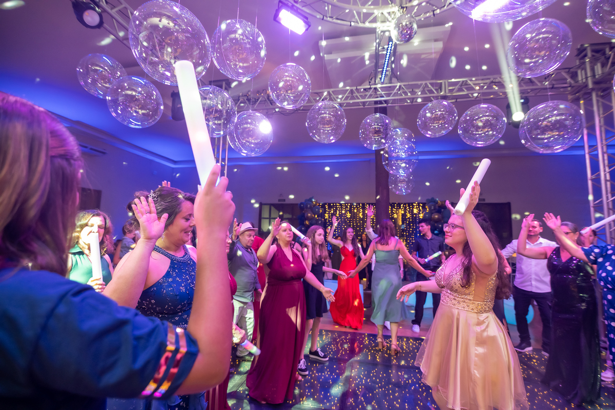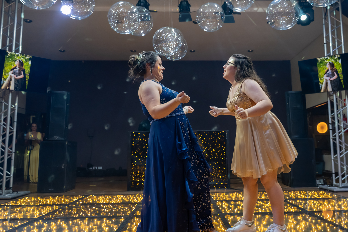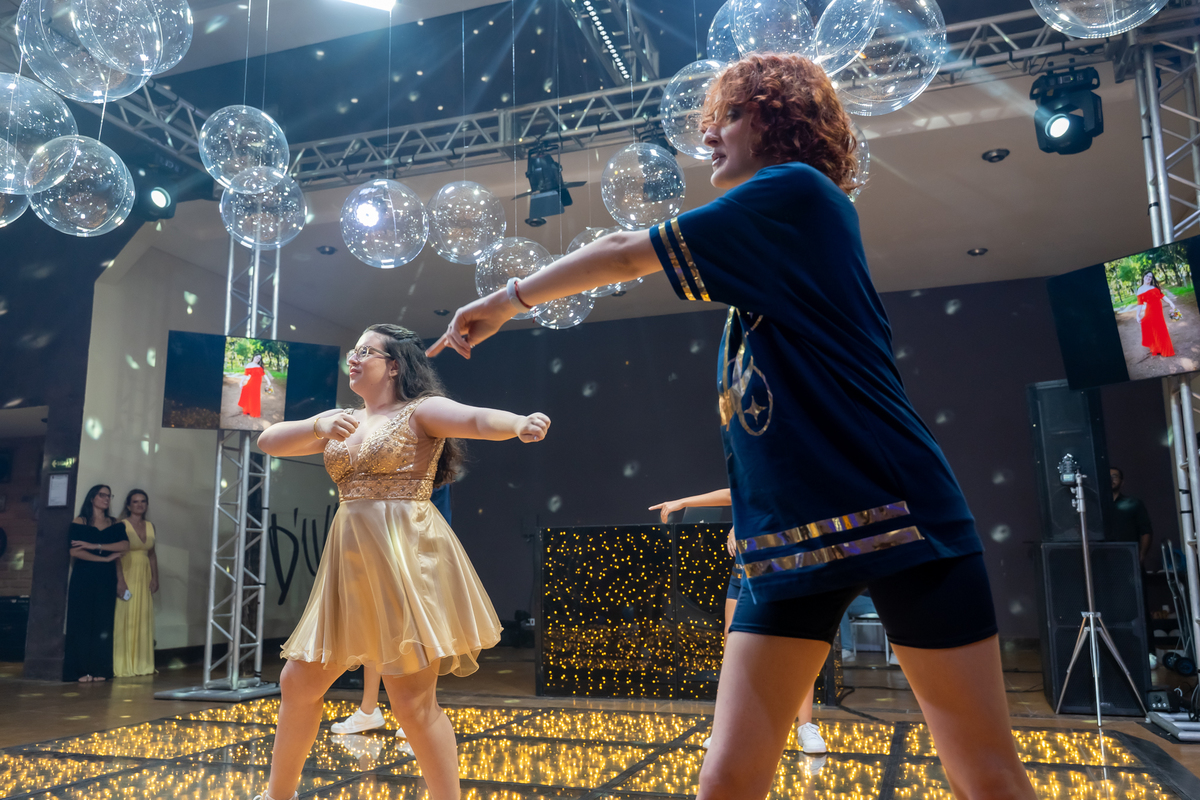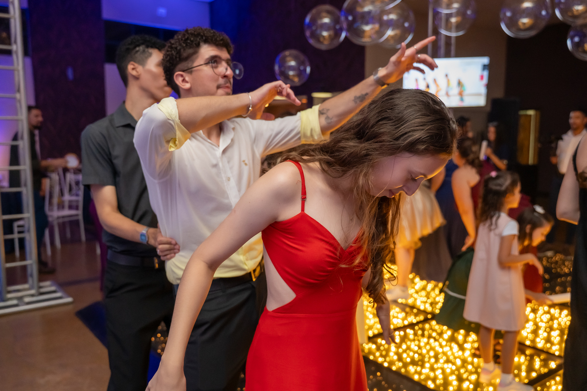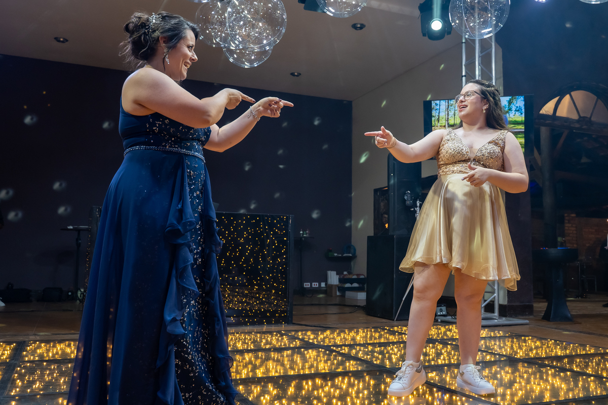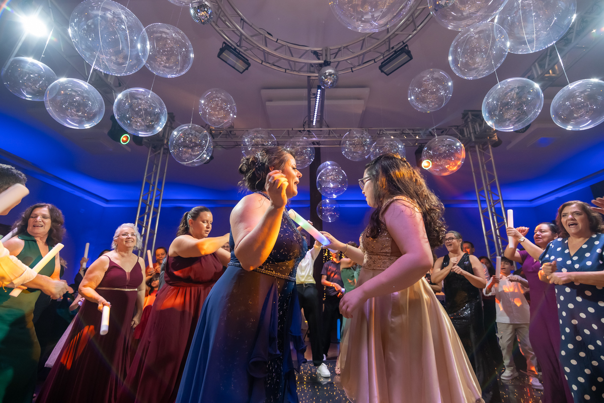 A pista de dança ficou animadíssima, com muita alegria e energia. Teve dança com o pai, com a mãe, com as amigas… momentos emocionantes e cheios de significado.