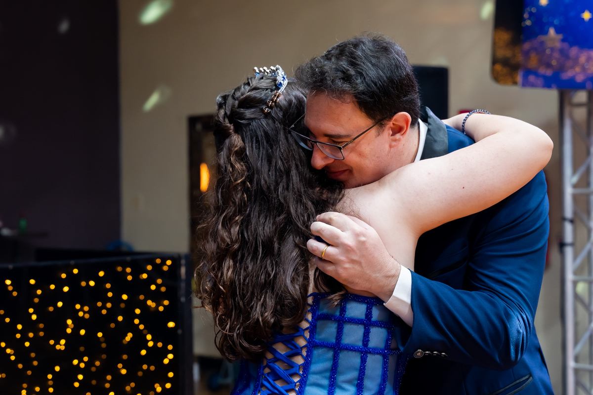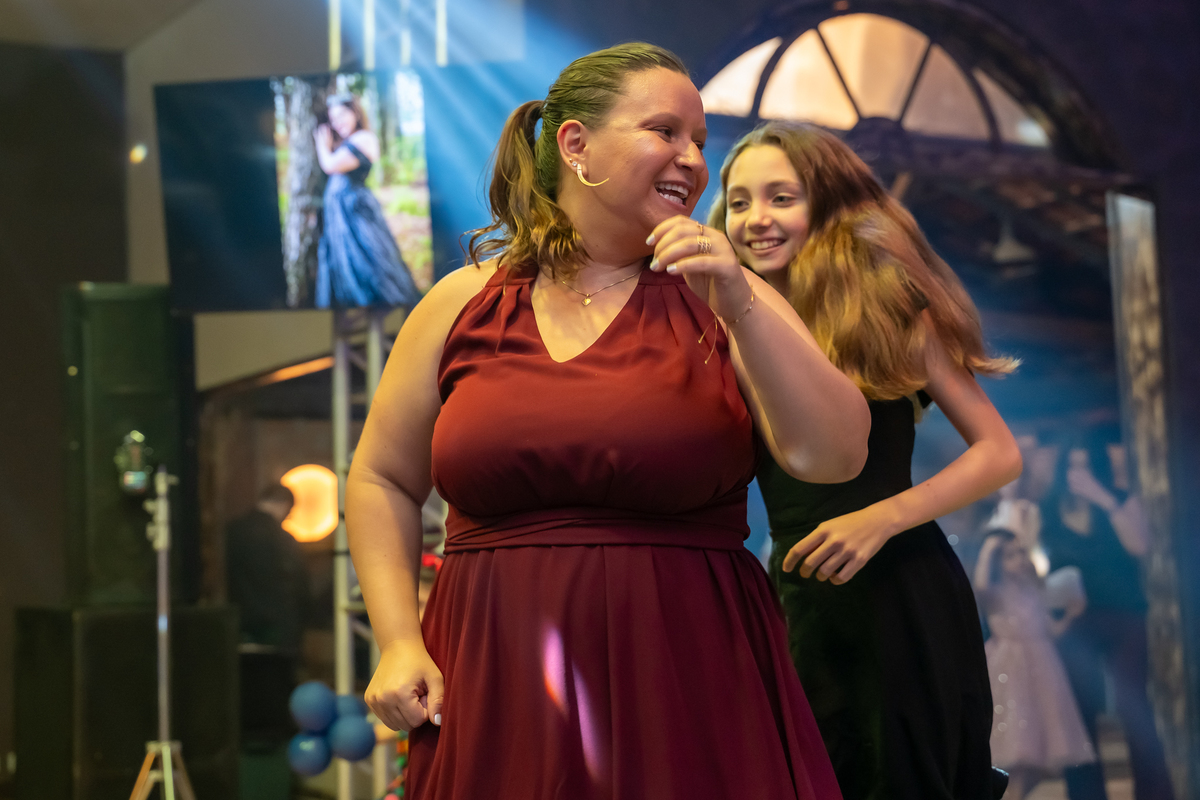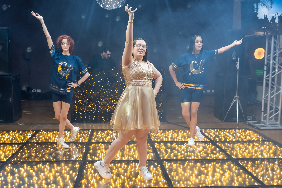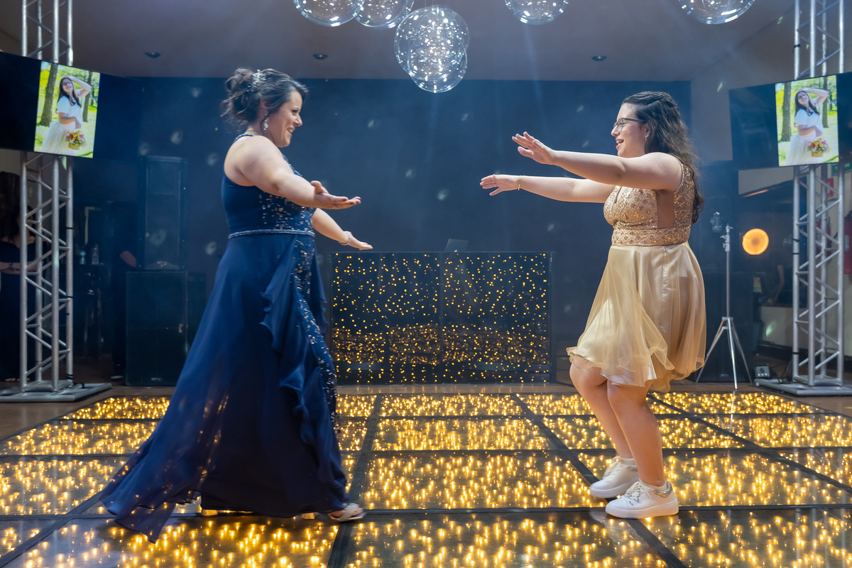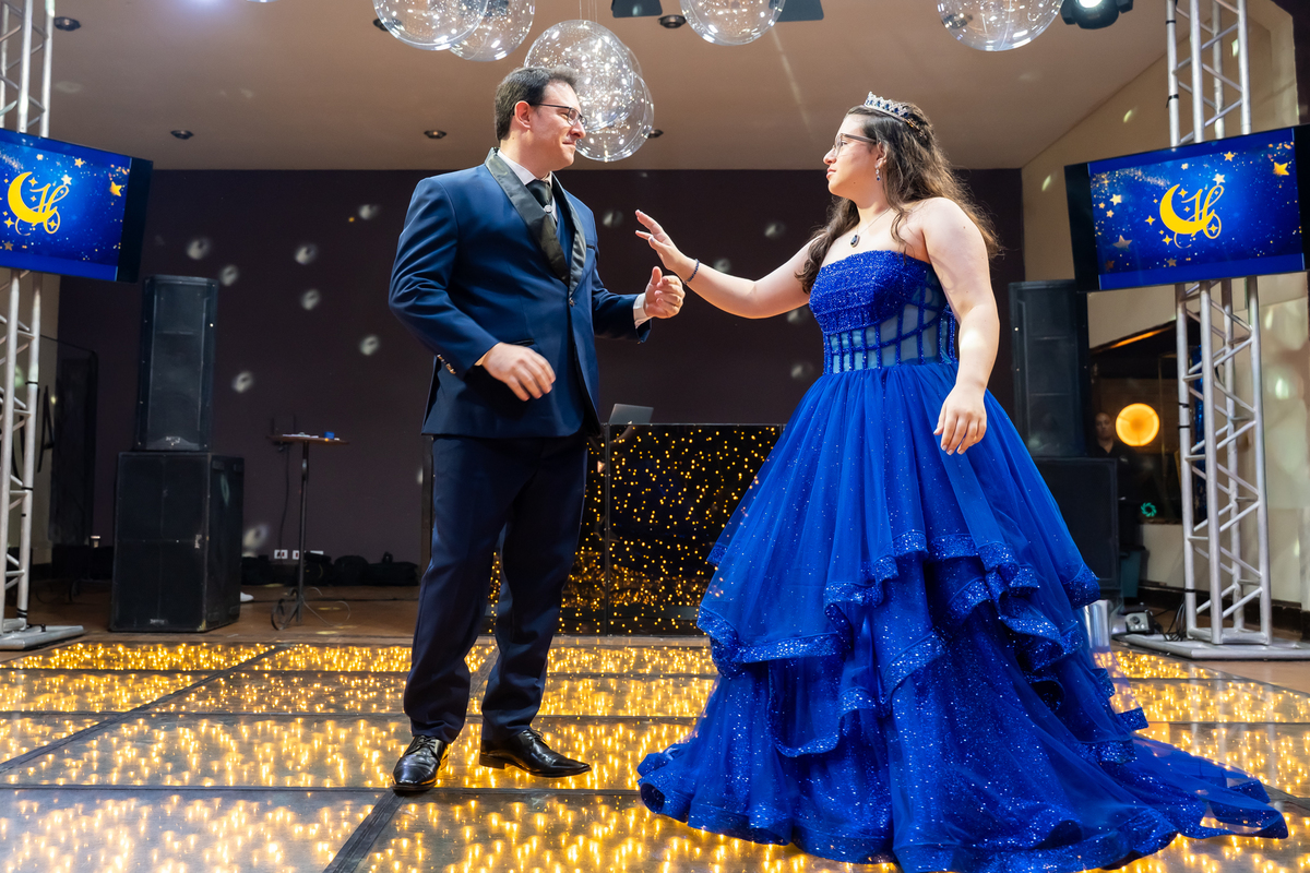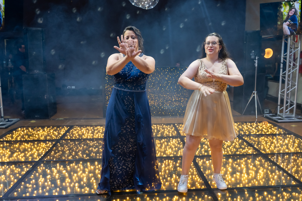 A pista de dança ficou animadíssima, com muita alegria e energia. Teve dança com o pai, com a mãe, com as amigas… momentos emocionantes e cheios de significado.