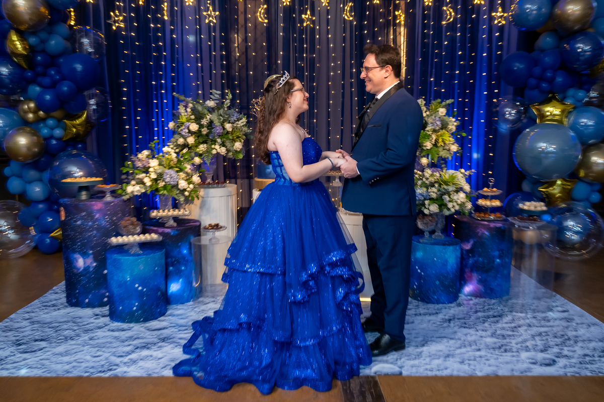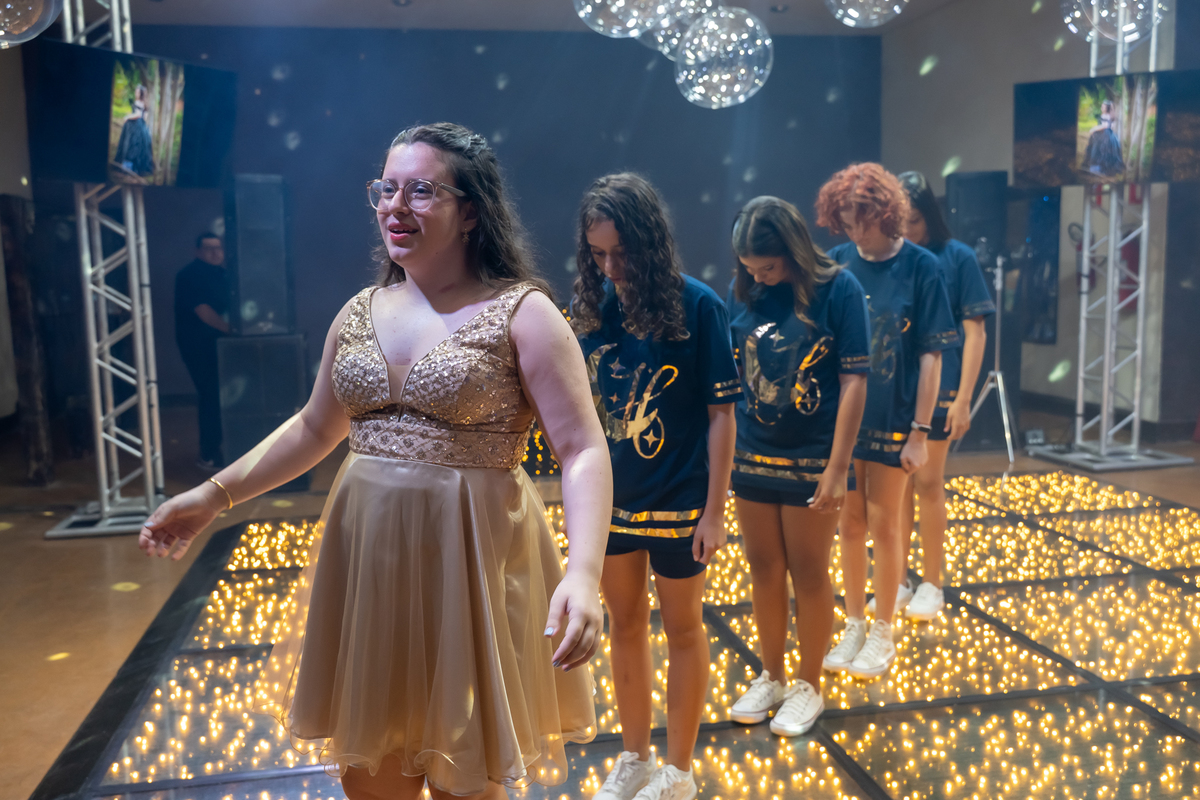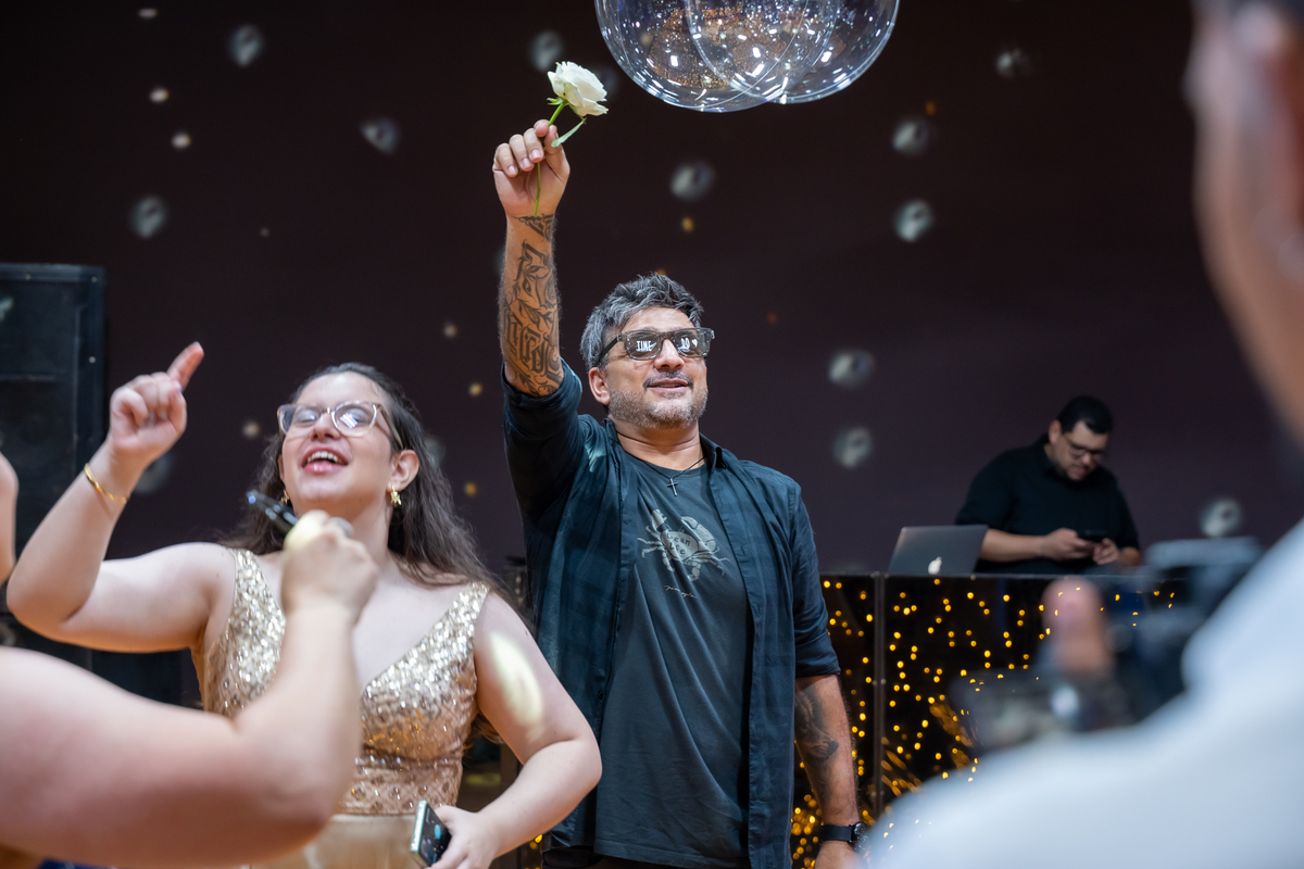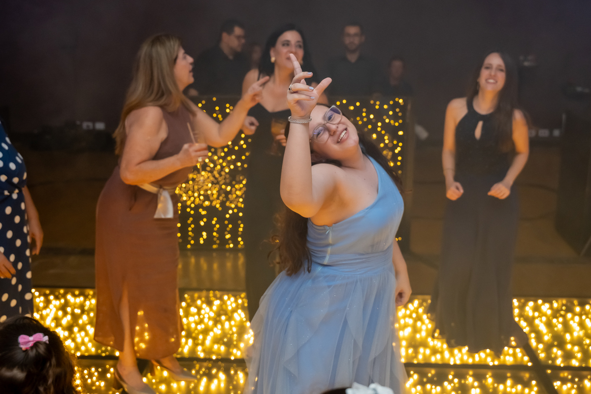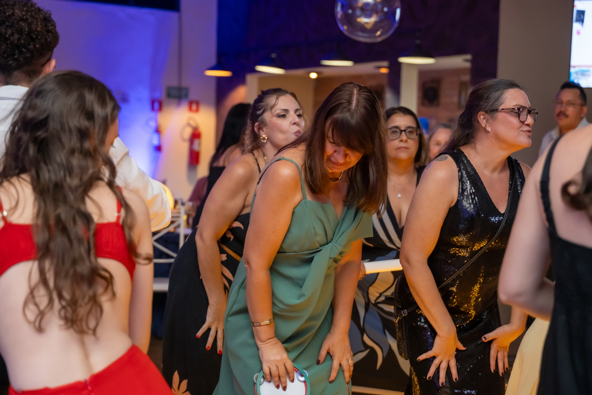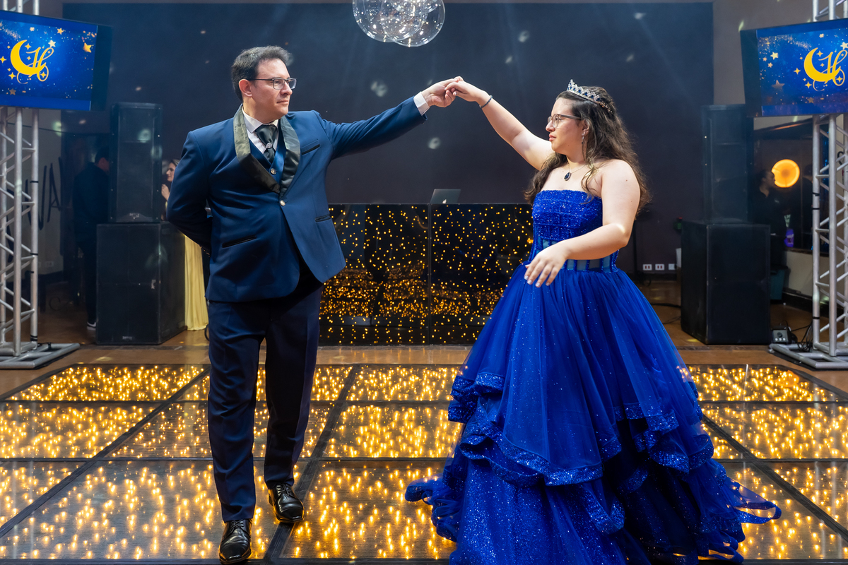 A pista de dança ficou animadíssima, com muita alegria e energia. Teve dança com o pai, com a mãe, com as amigas… momentos emocionantes e cheios de significado.
