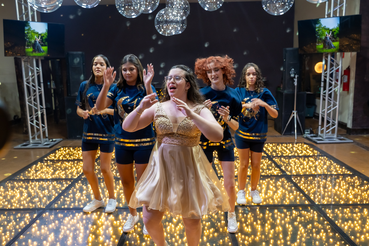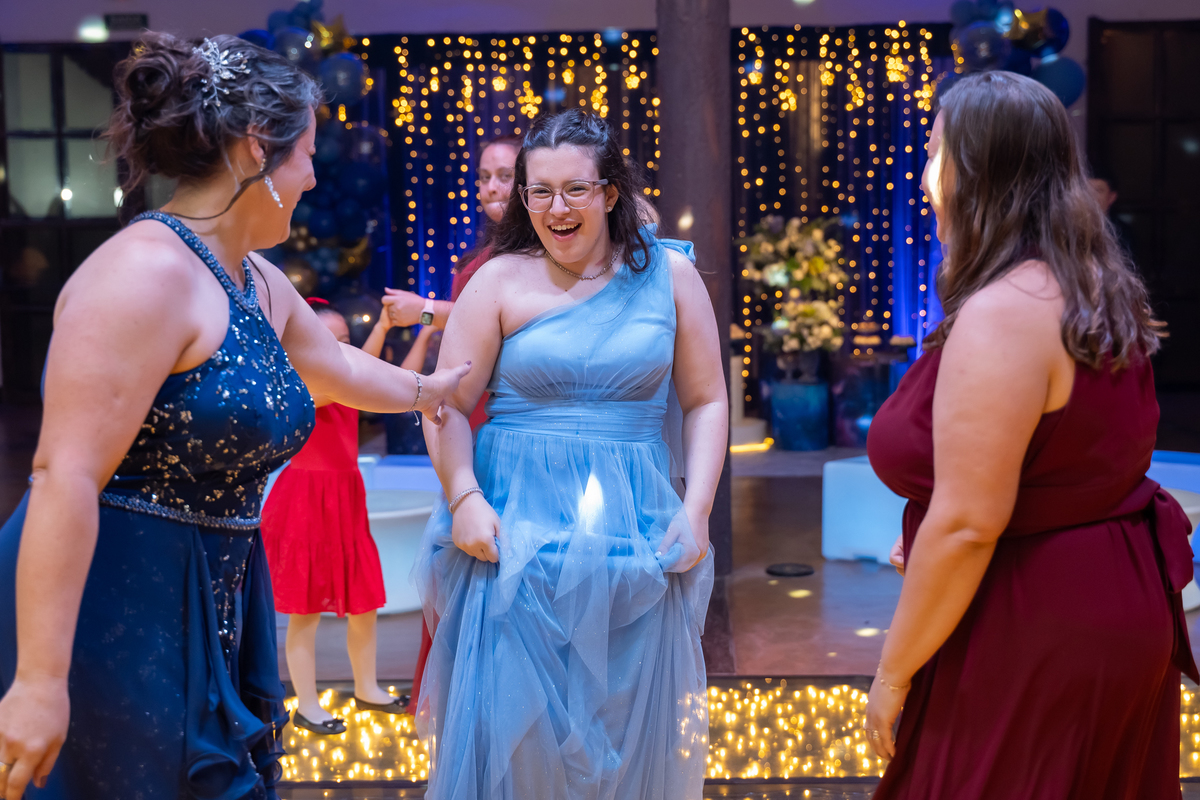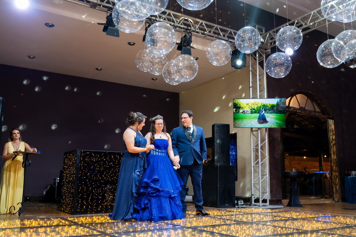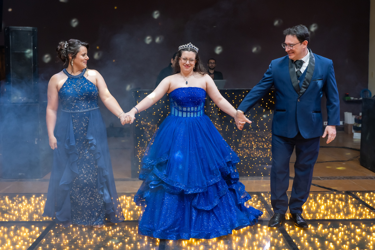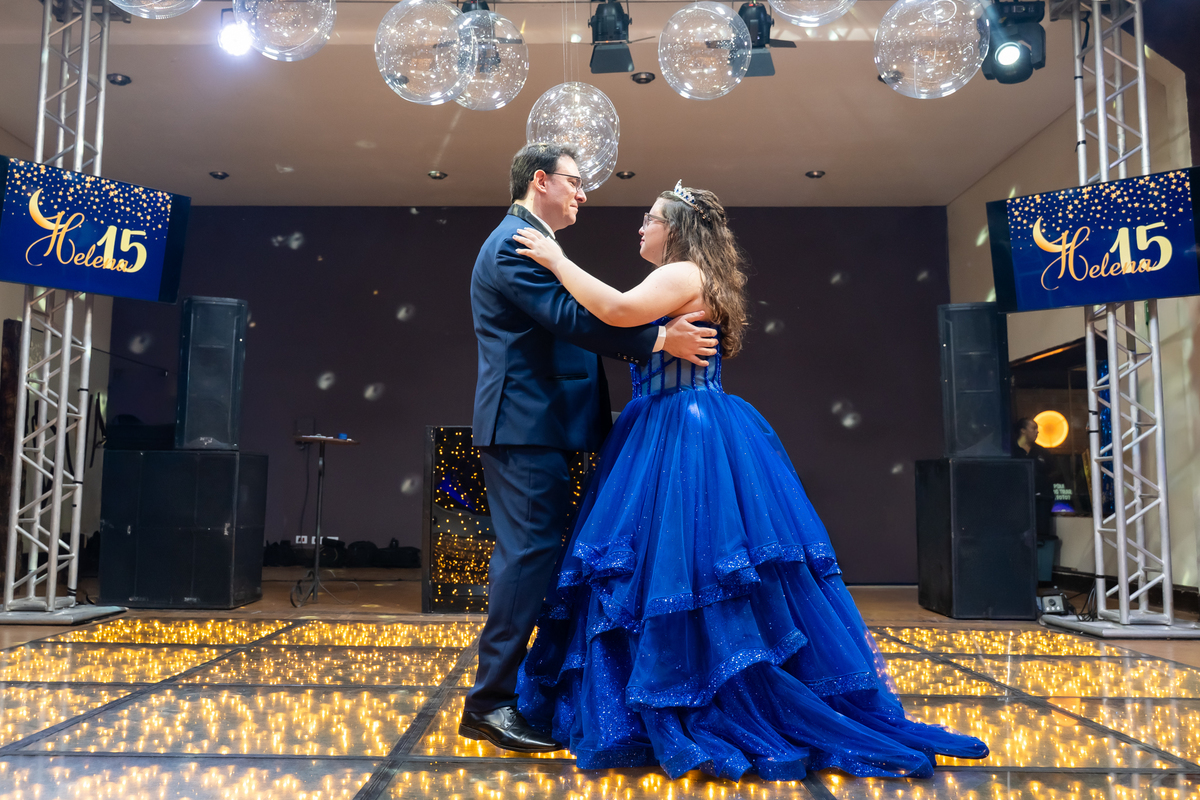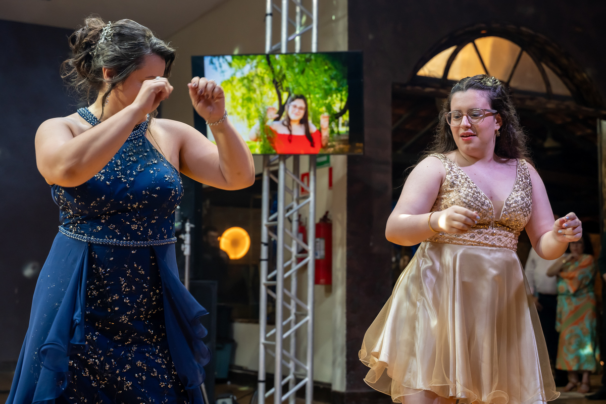 A pista de dança ficou animadíssima, com muita alegria e energia. Teve dança com o pai, com a mãe, com as amigas… momentos emocionantes e cheios de significado.