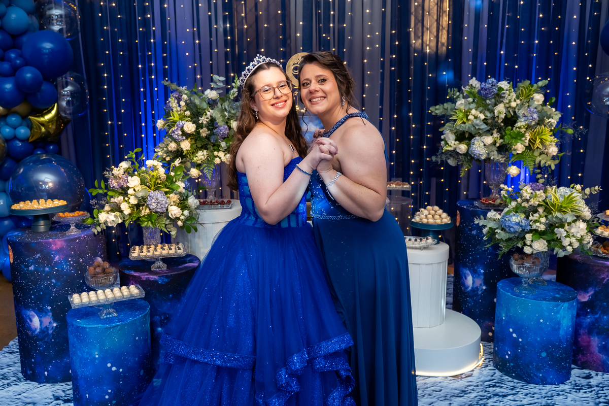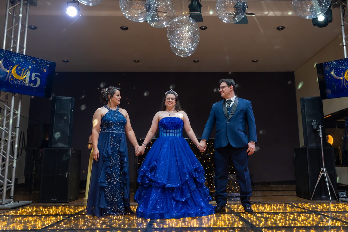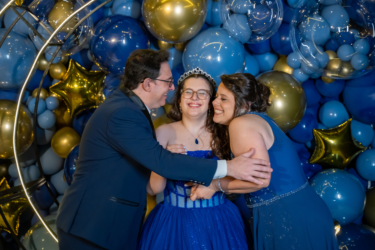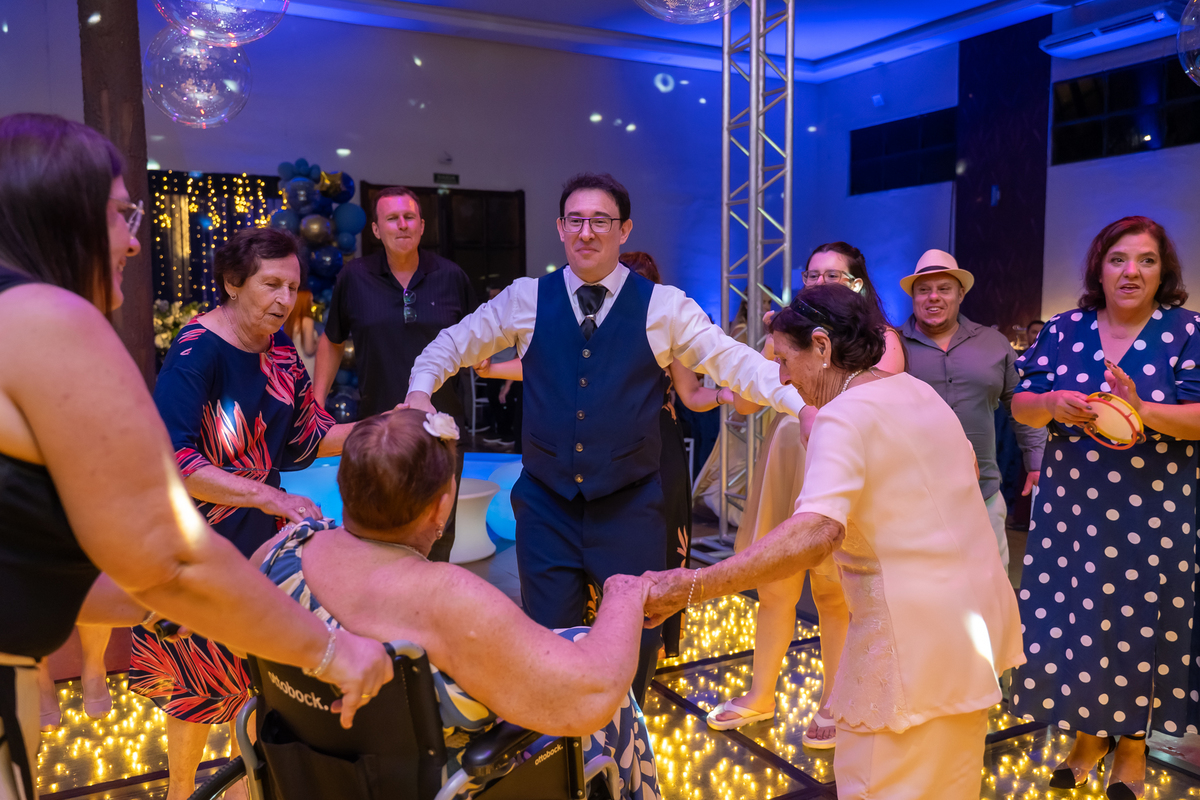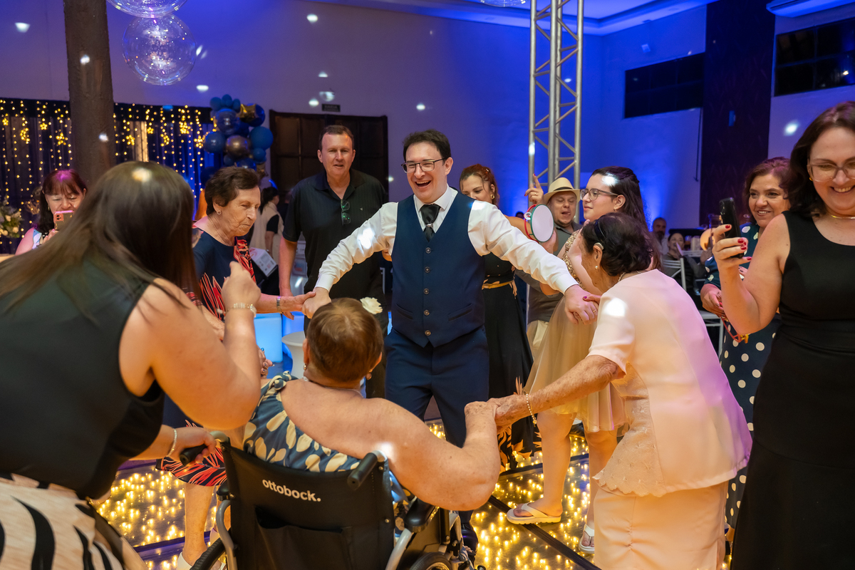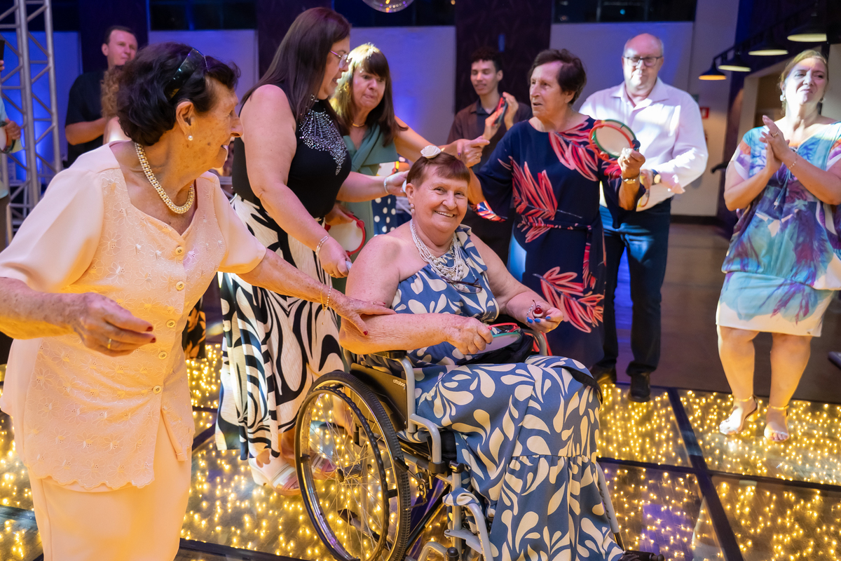 A pista de dança ficou animadíssima, com muita alegria e energia. Teve dança com o pai, com a mãe, com as amigas… momentos emocionantes e cheios de significado.
