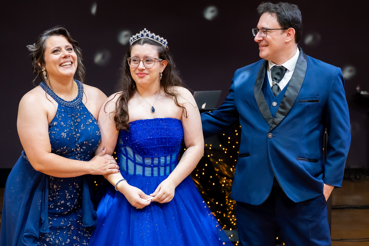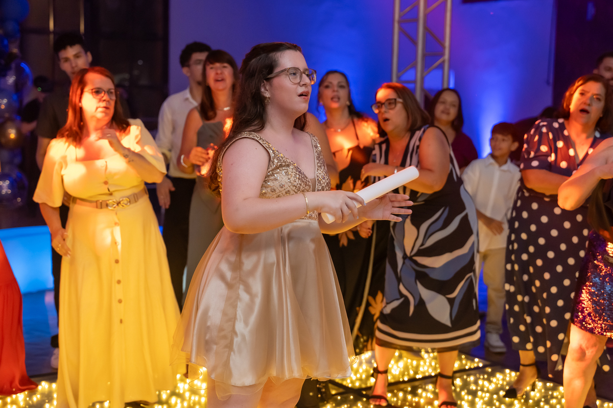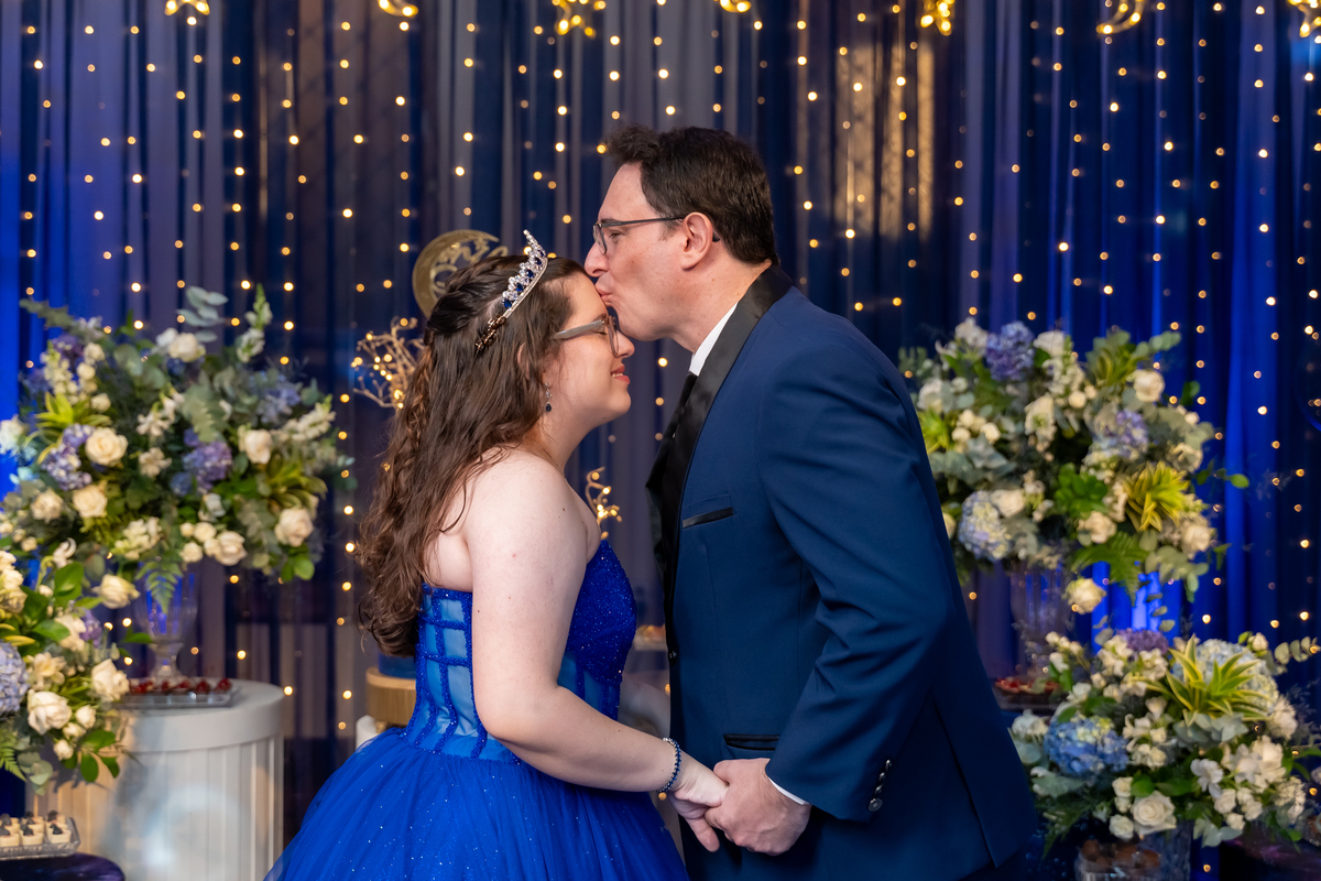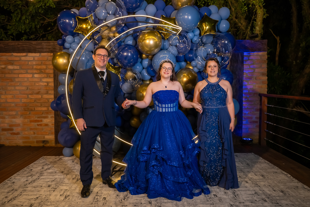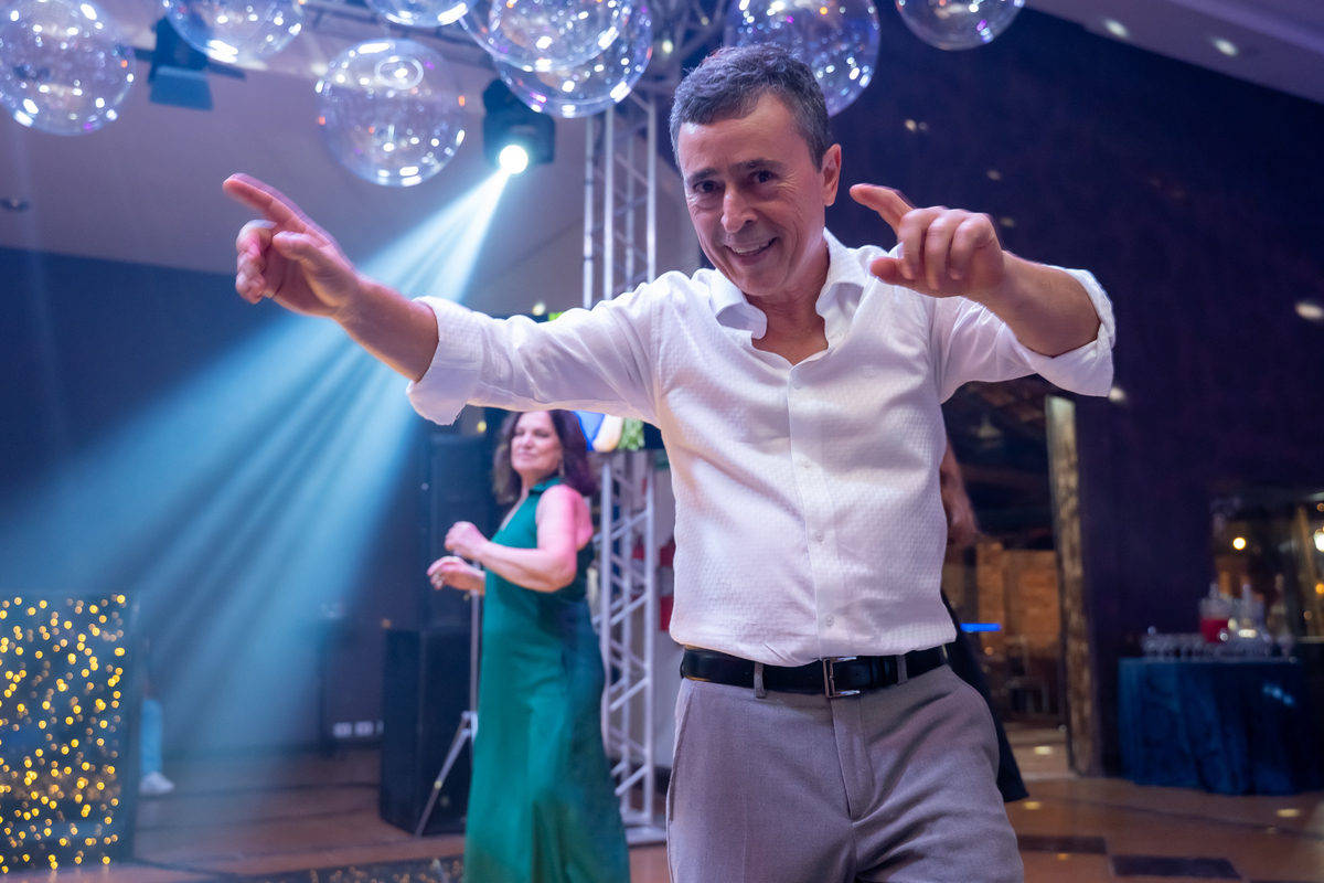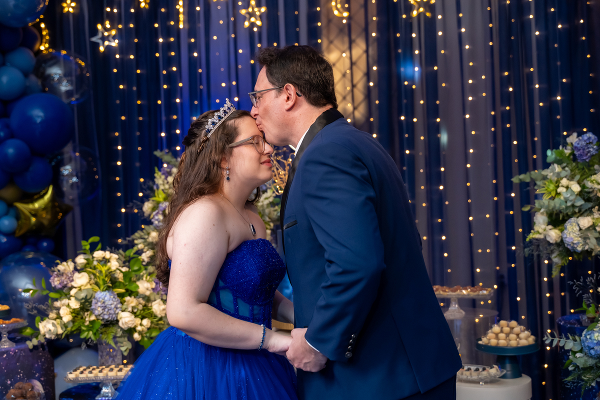 A pista de dança ficou animadíssima, com muita alegria e energia. Teve dança com o pai, com a mãe, com as amigas… momentos emocionantes e cheios de significado.