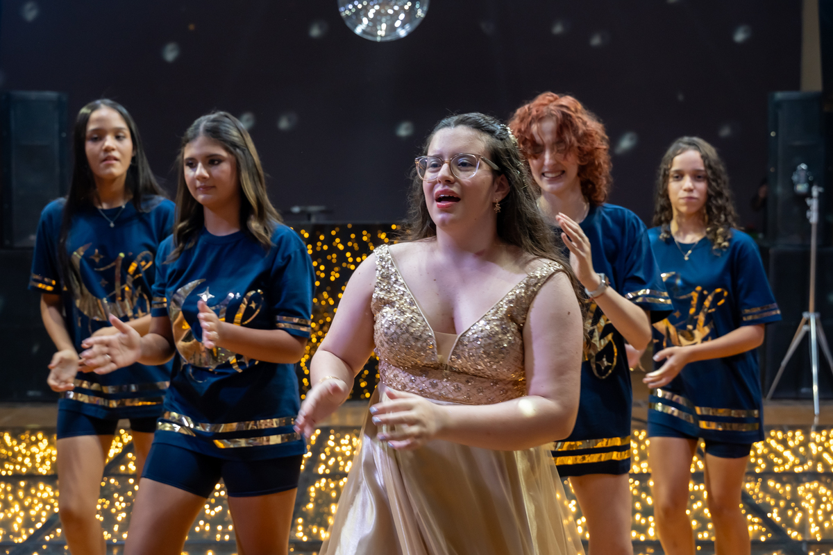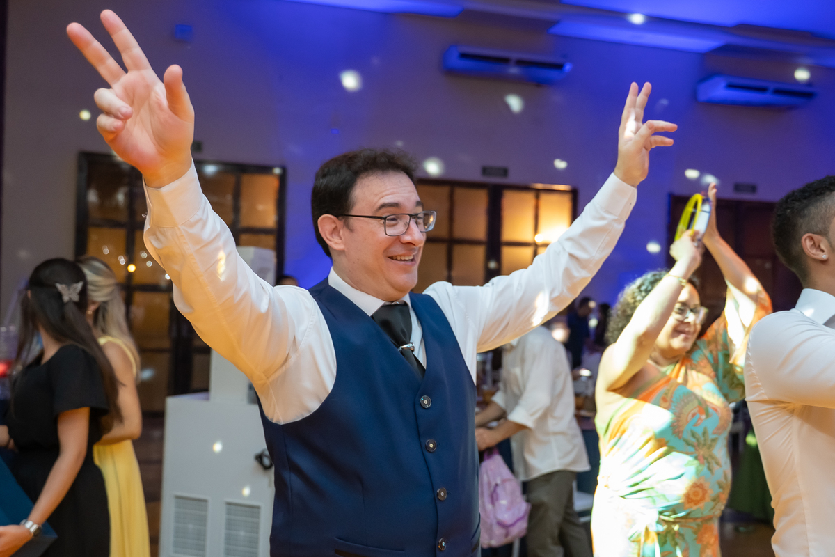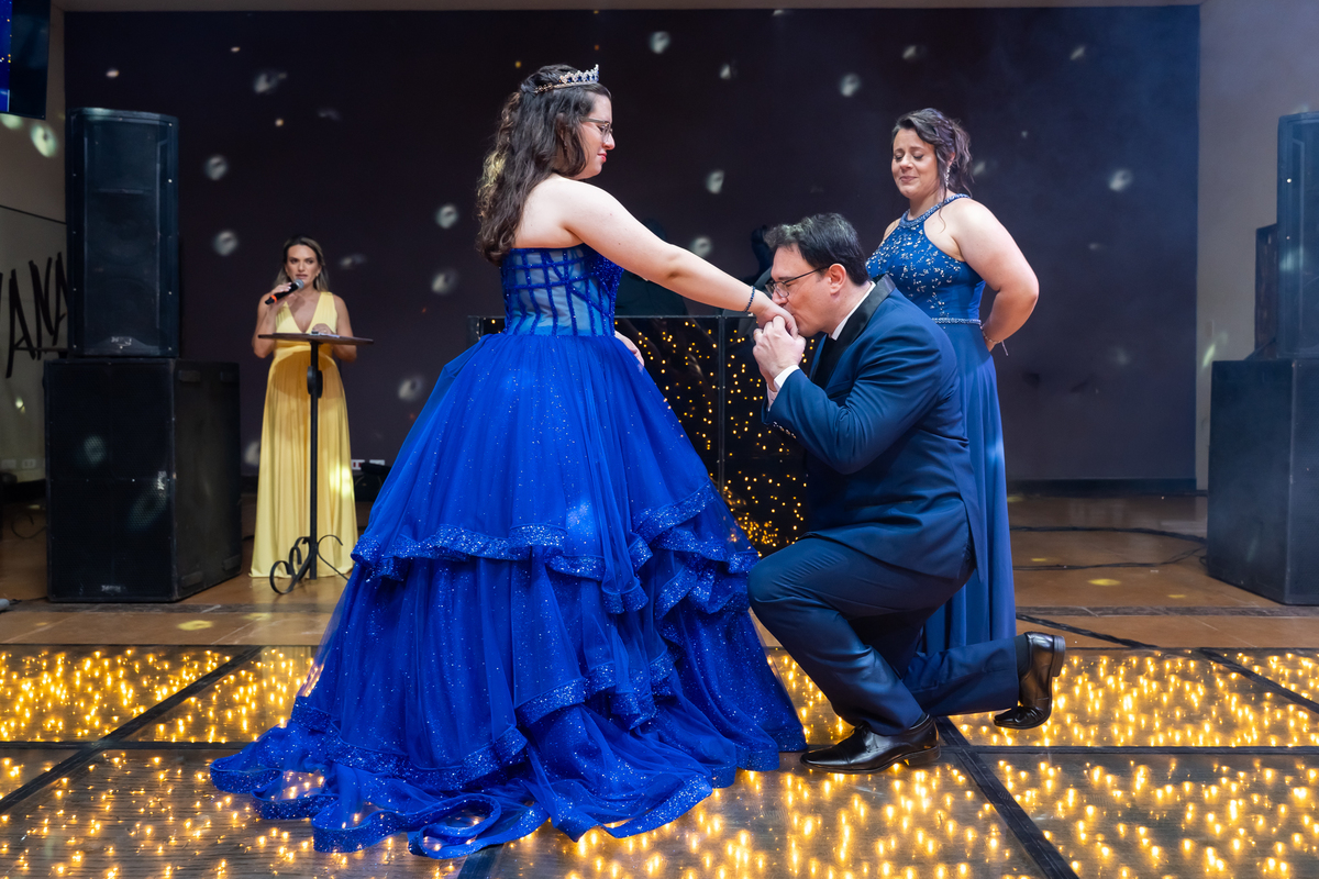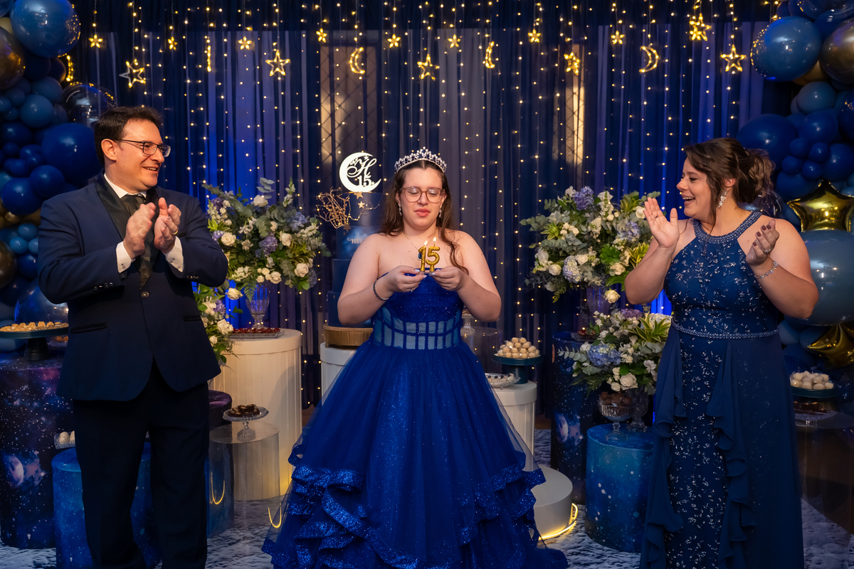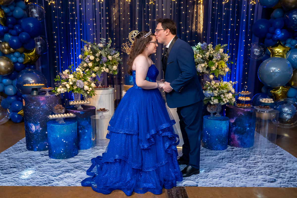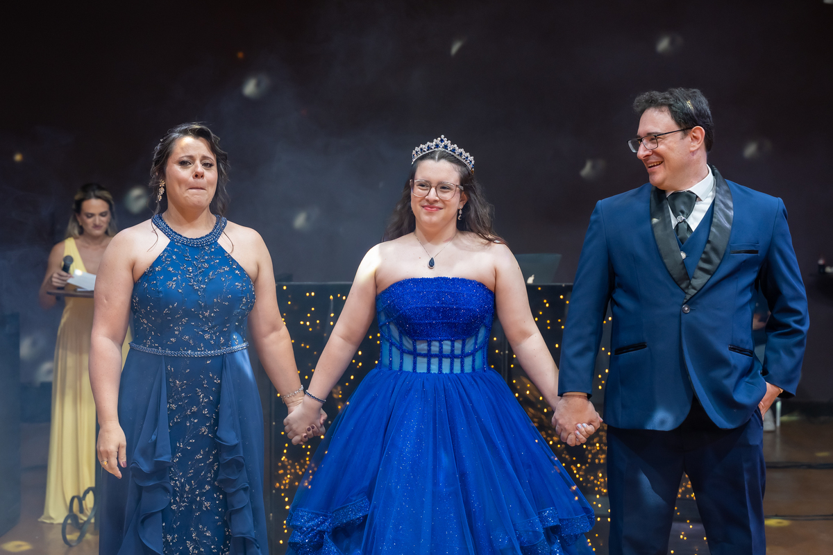 A pista de dança ficou animadíssima, com muita alegria e energia. Teve dança com o pai, com a mãe, com as amigas… momentos emocionantes e cheios de significado.