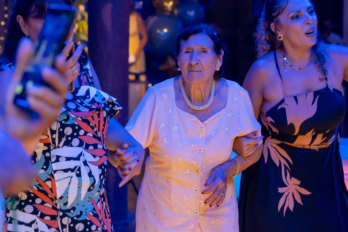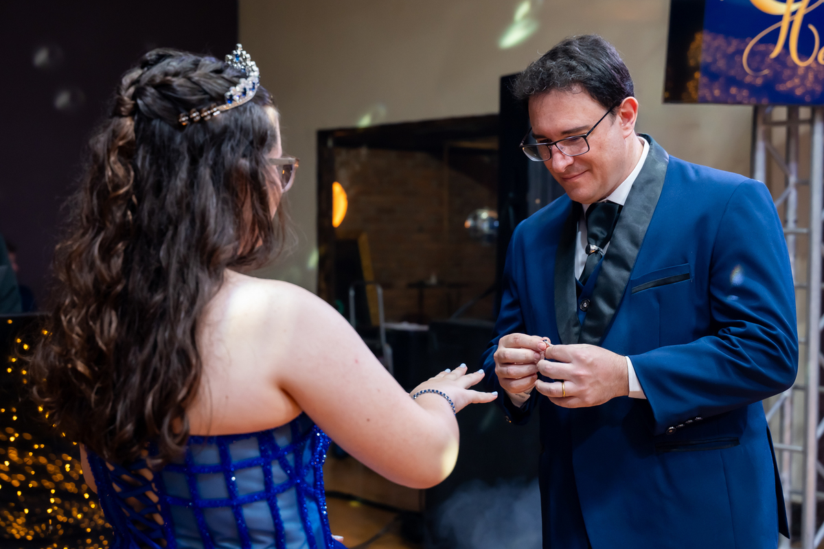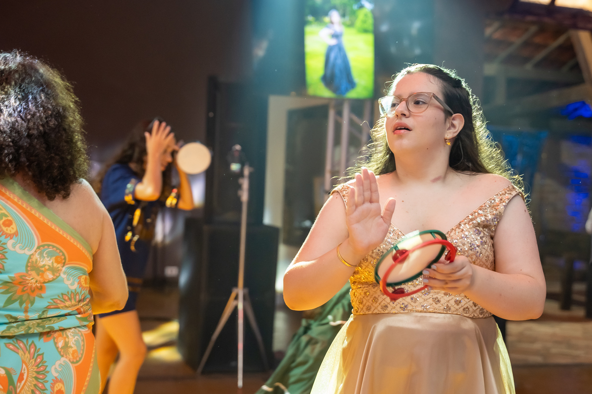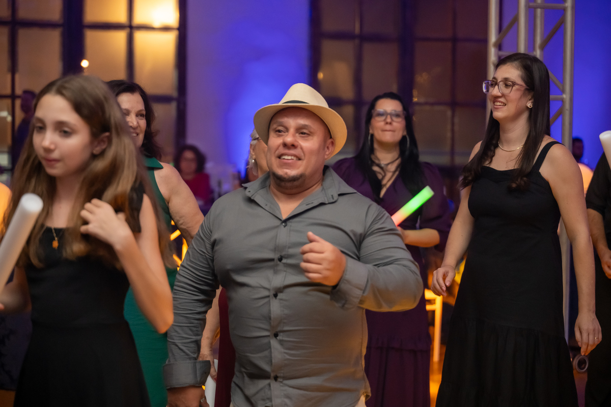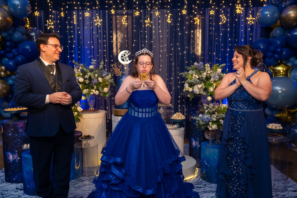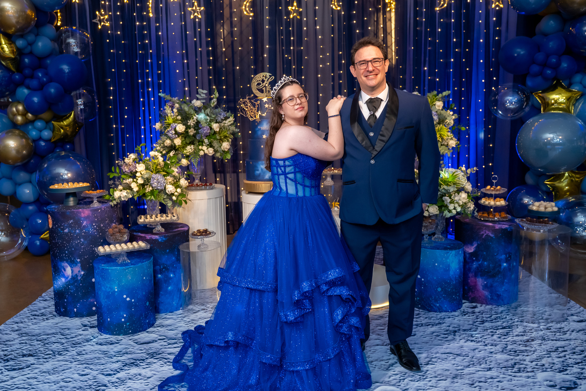 A pista de dança ficou animadíssima, com muita alegria e energia. Teve dança com o pai, com a mãe, com as amigas… momentos emocionantes e cheios de significado.