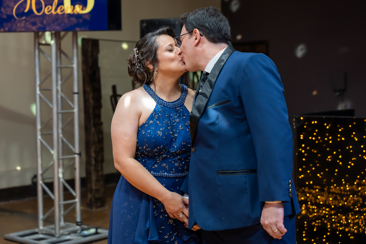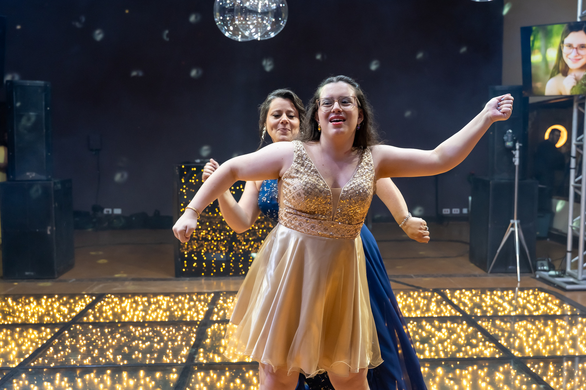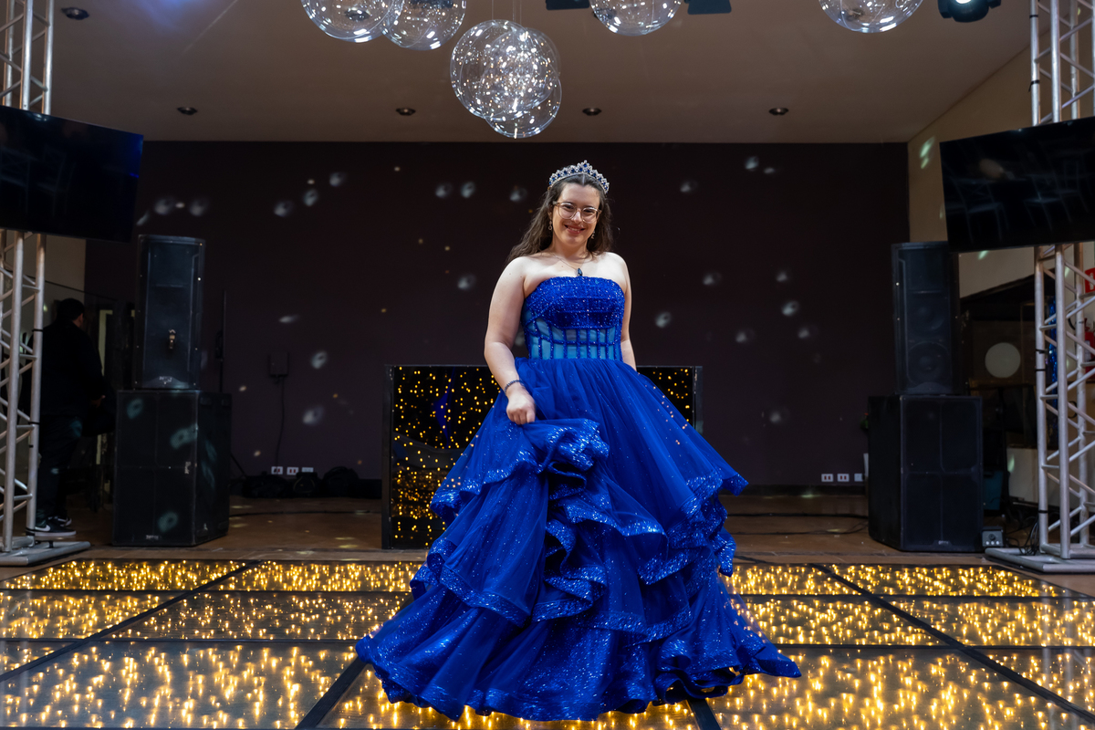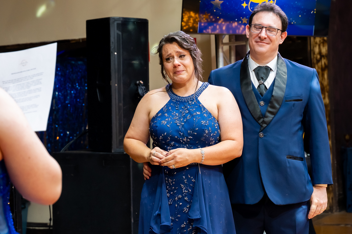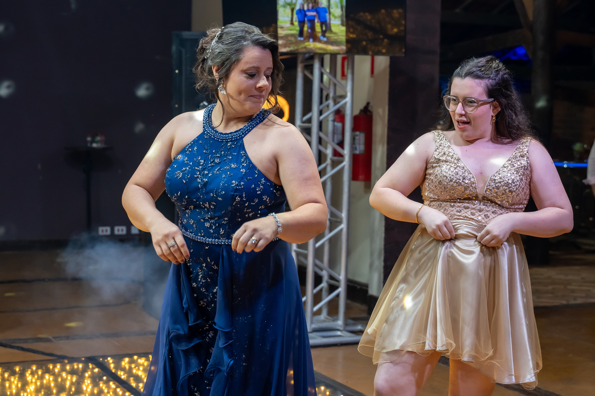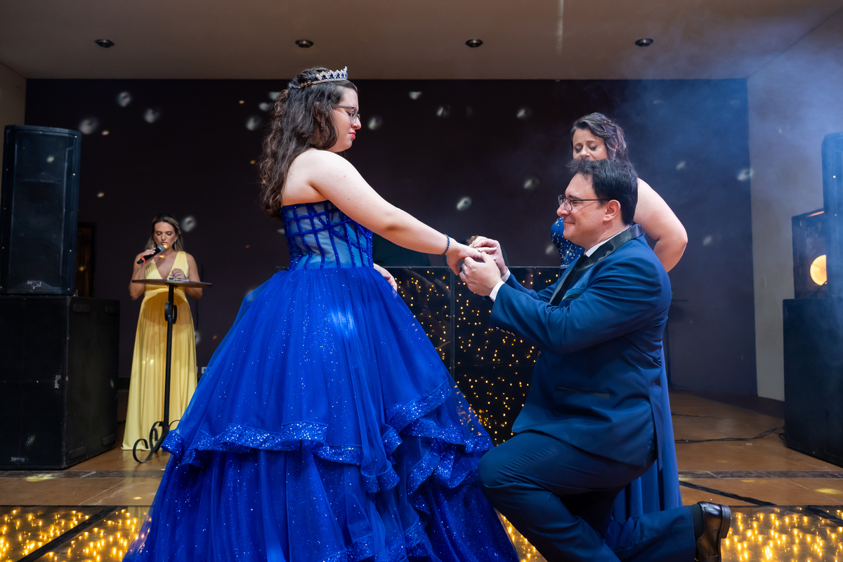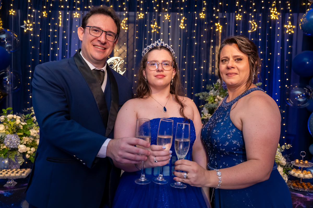 A pista de dança ficou animadíssima, com muita alegria e energia. Teve dança com o pai, com a mãe, com as amigas… momentos emocionantes e cheios de significado.