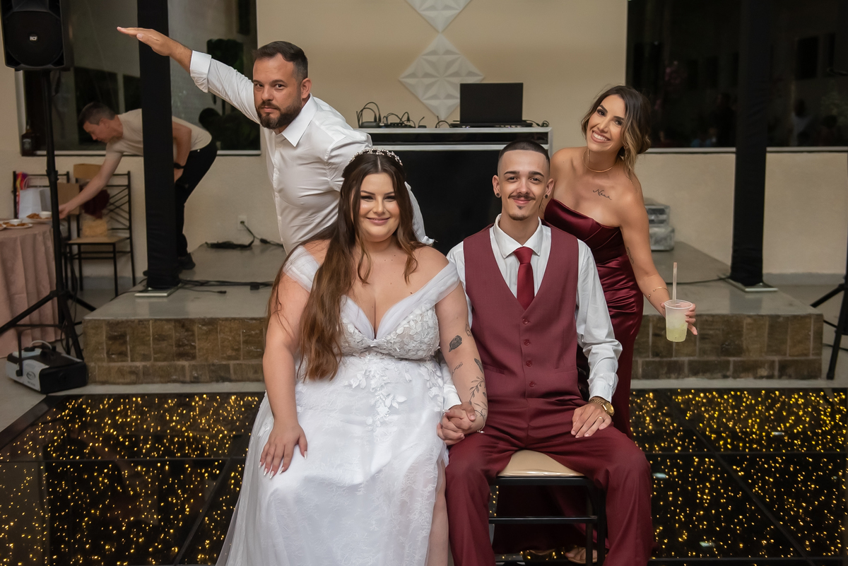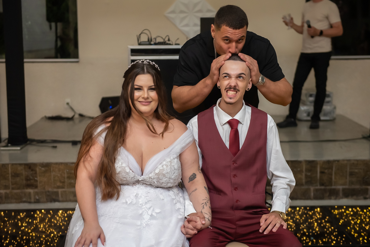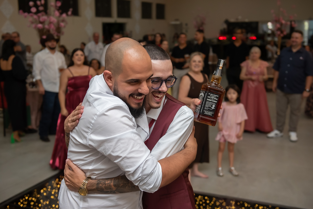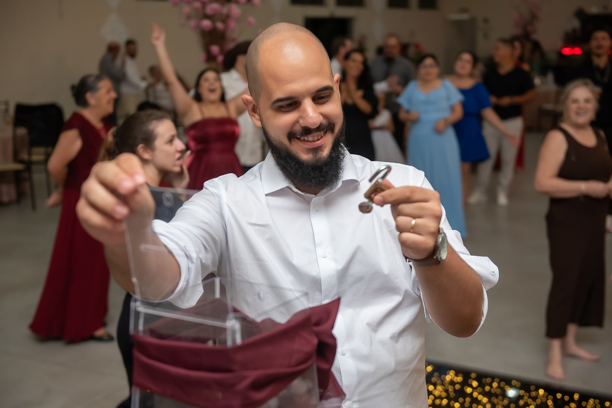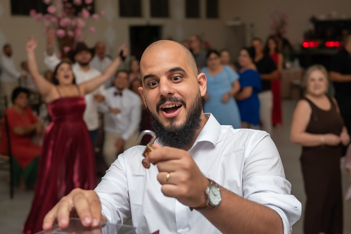 Os noivos aproveitaram cada instante: entraram na brincadeira com os convidados, fizeram trend, inovaram na tradição oferecendo chaves para resgatar litros de whisky 🥃 e garantiram muita diversão ao longo da noite.