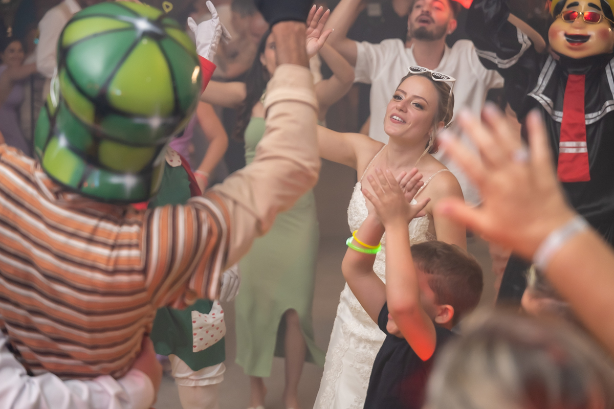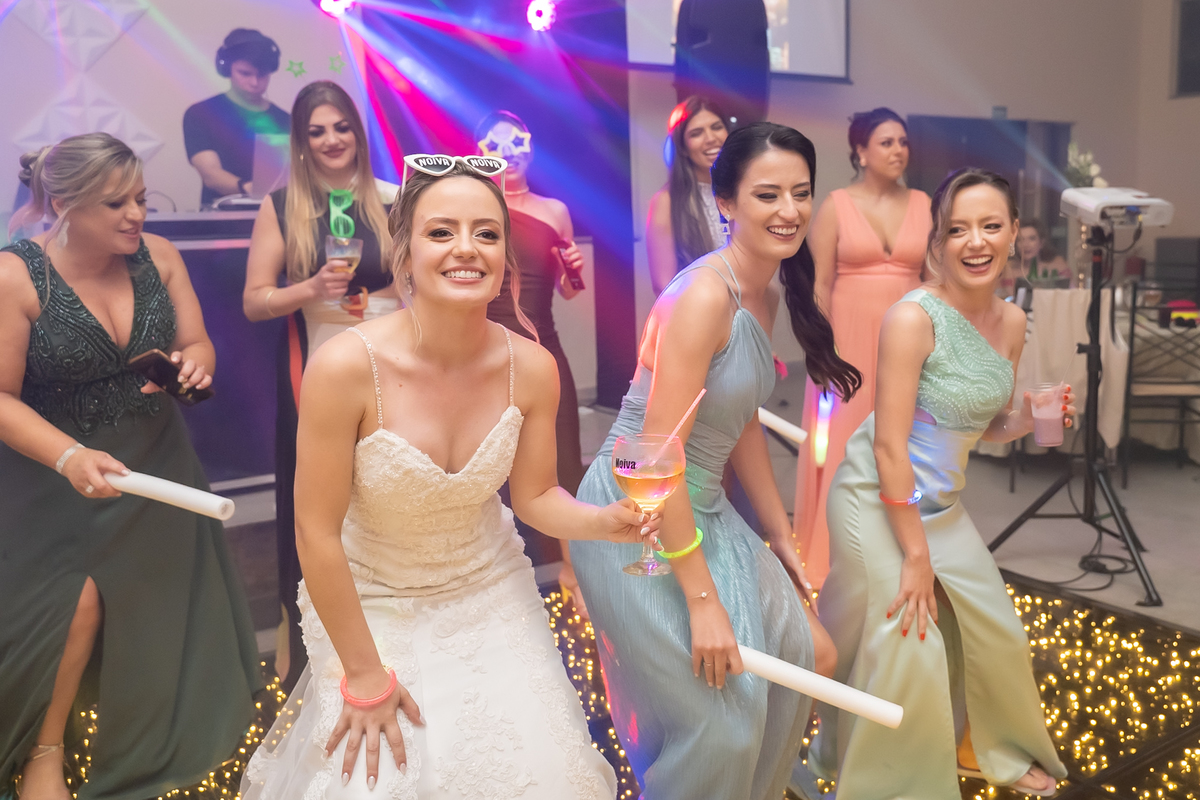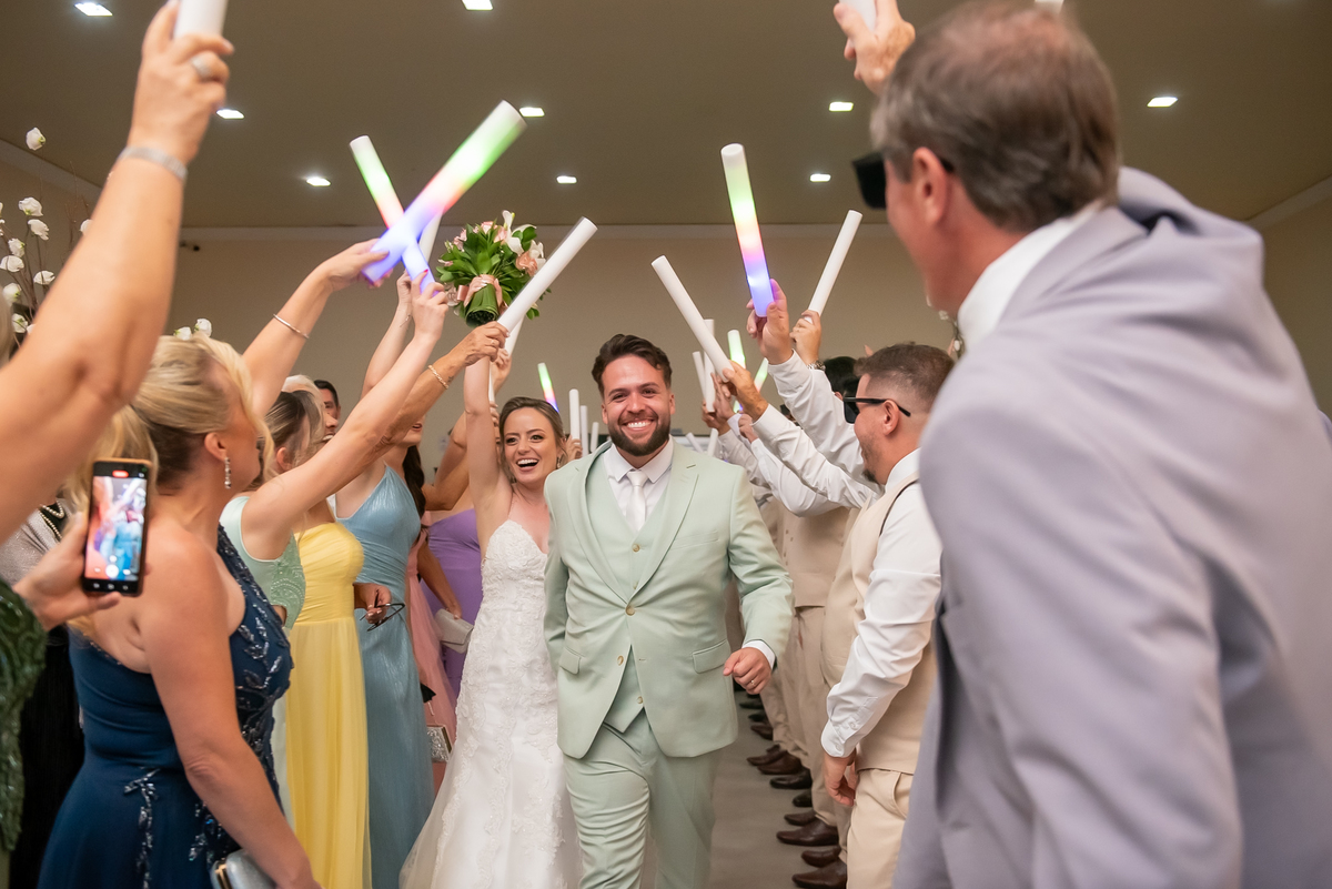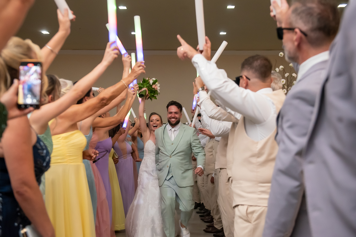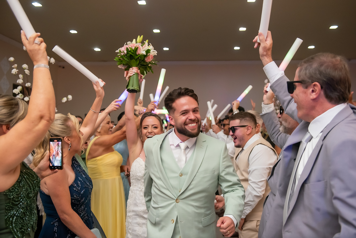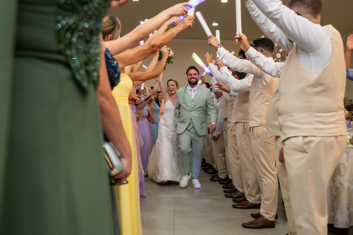 Na entrada da festa, os padrinhos prepararam um túnel animado para receber os noivos, dando início a uma noite cheia de energia!