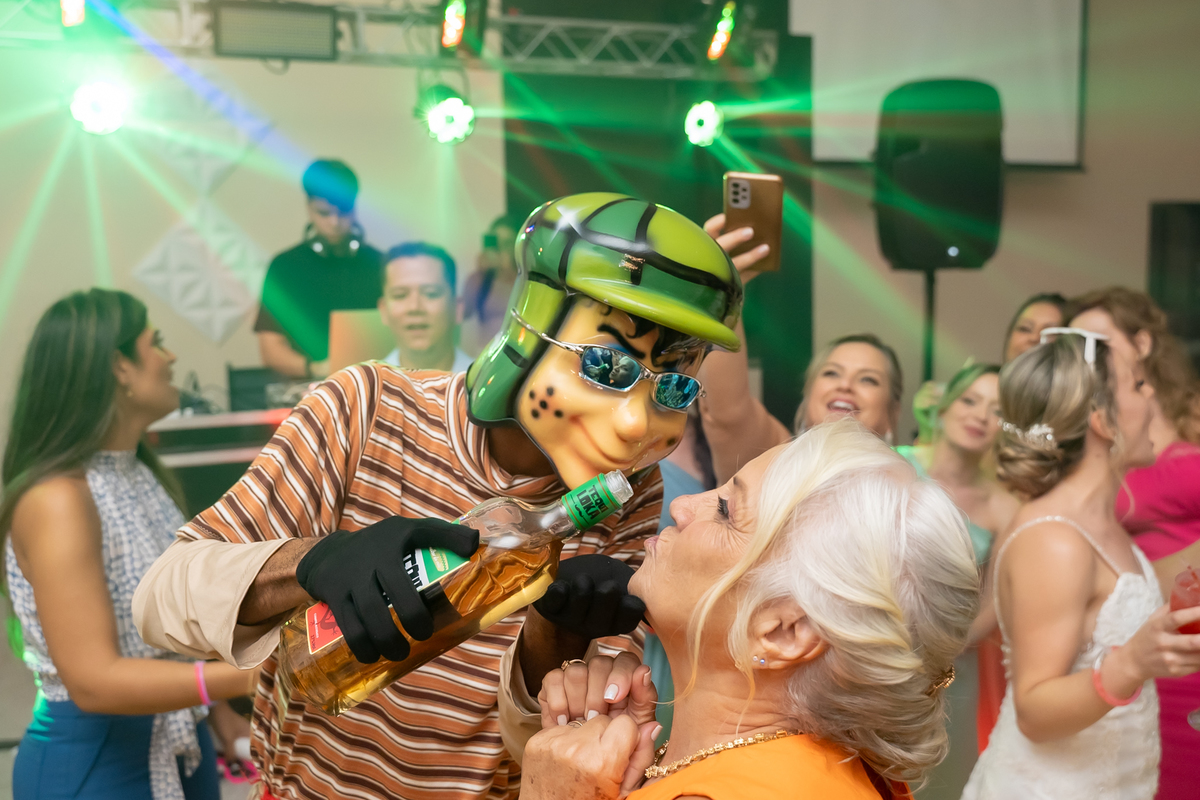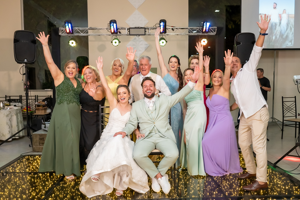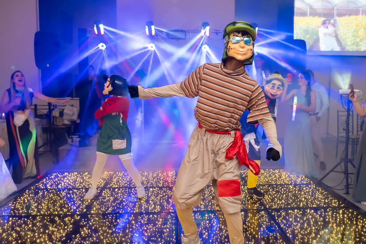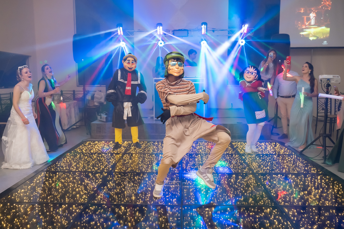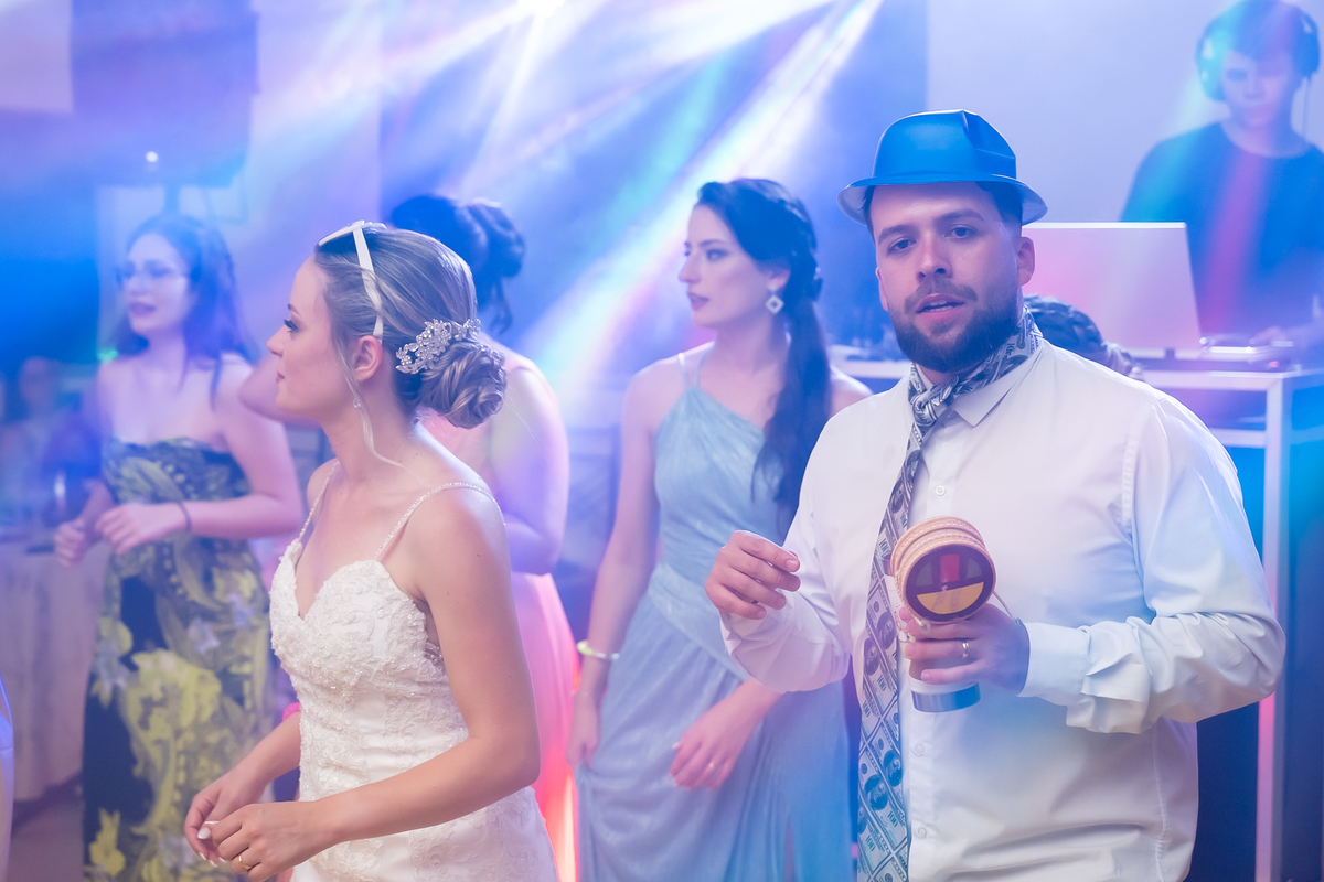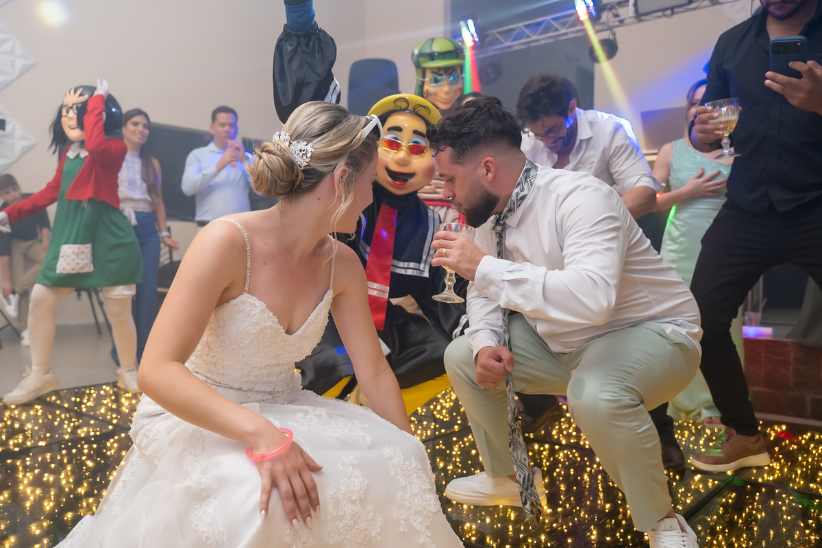 Na entrada da festa, os padrinhos prepararam um túnel animado para receber os noivos, dando início a uma noite cheia de energia!