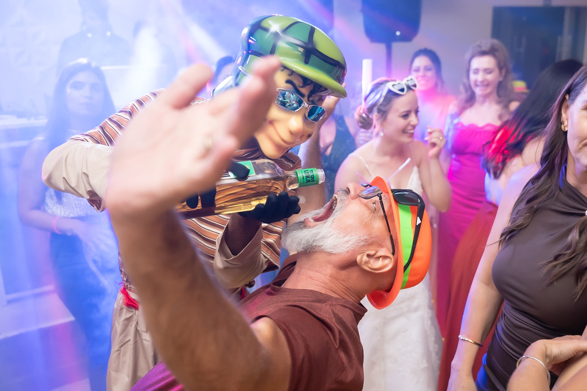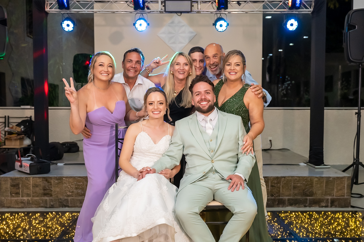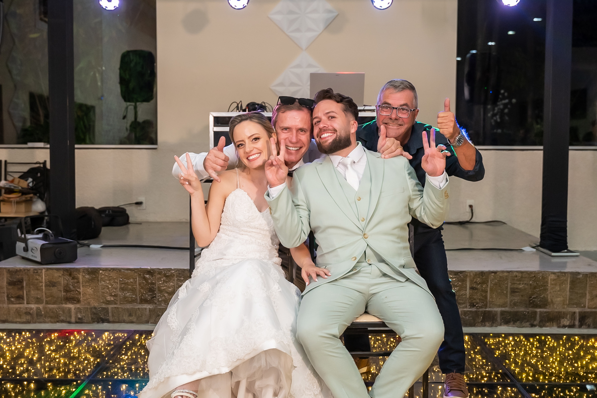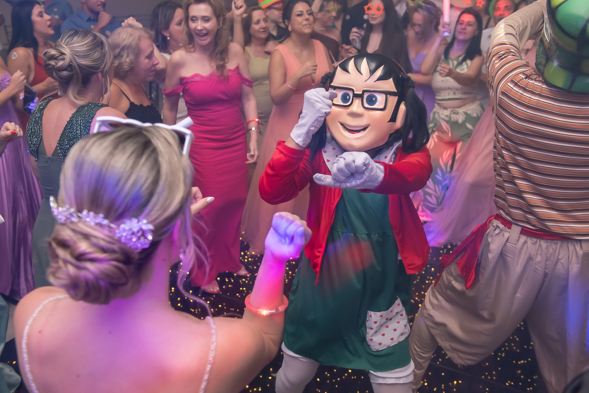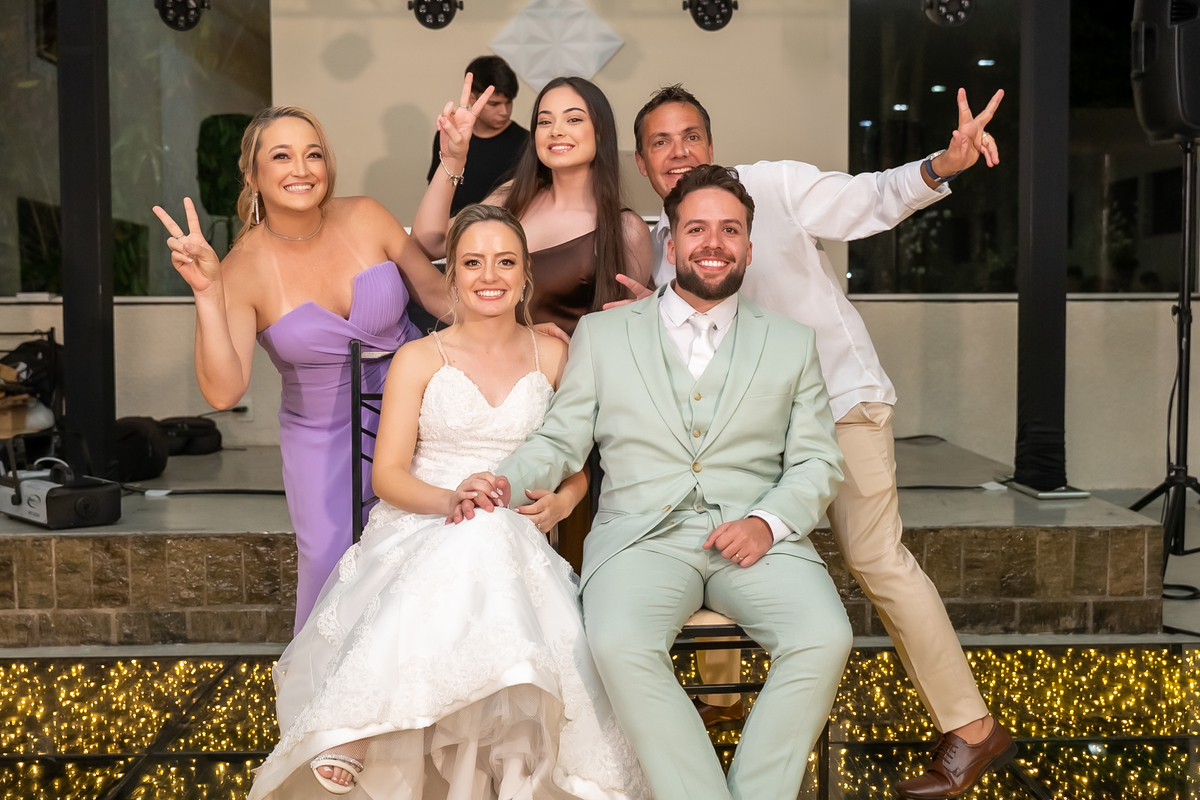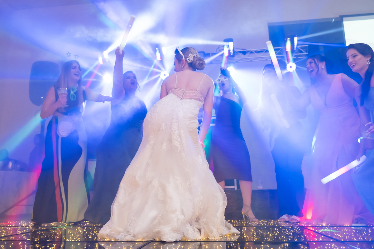 Na entrada da festa, os padrinhos prepararam um túnel animado para receber os noivos, dando início a uma noite cheia de energia!