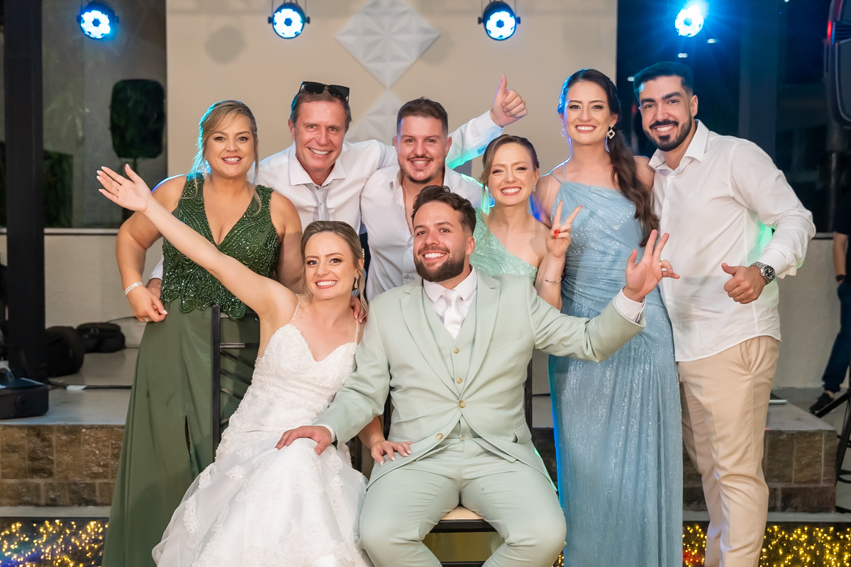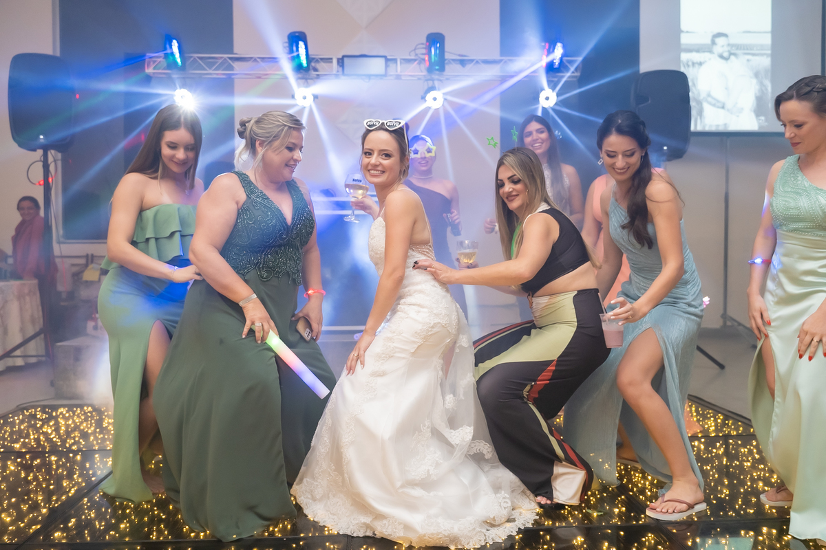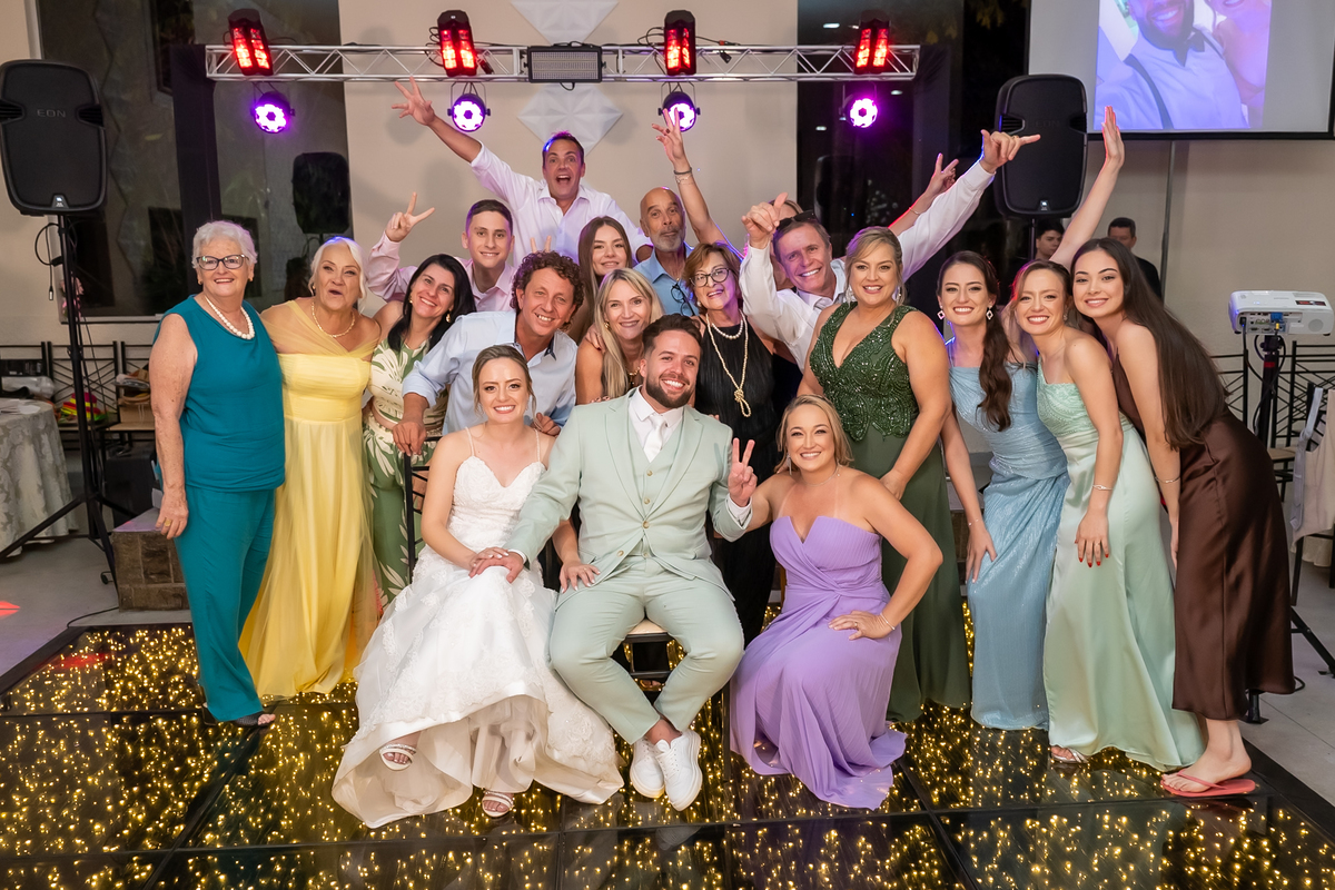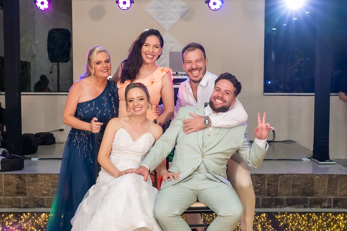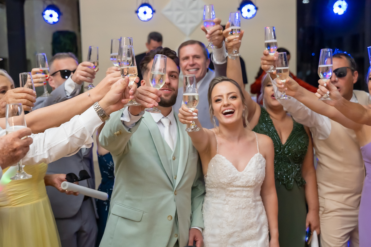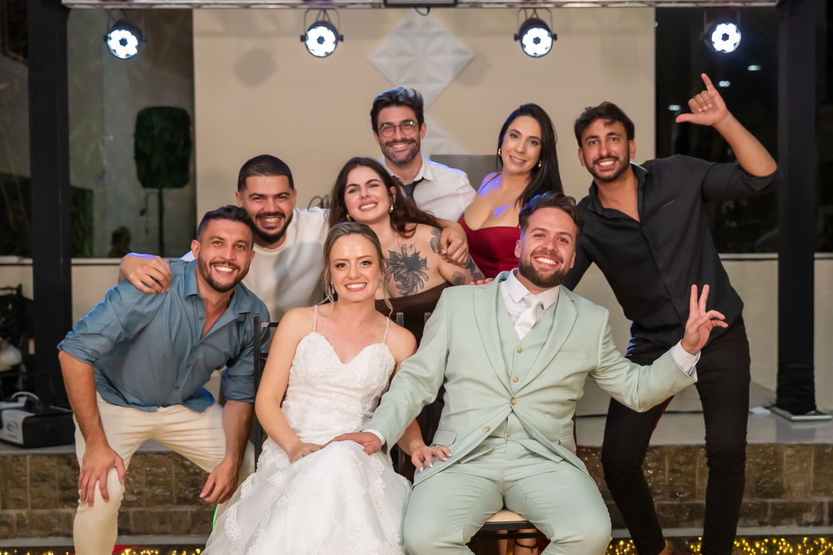 Na entrada da festa, os padrinhos prepararam um túnel animado para receber os noivos, dando início a uma noite cheia de energia!
