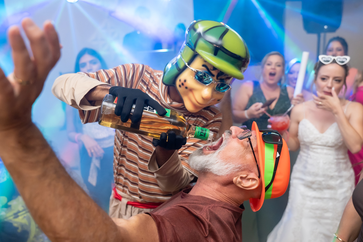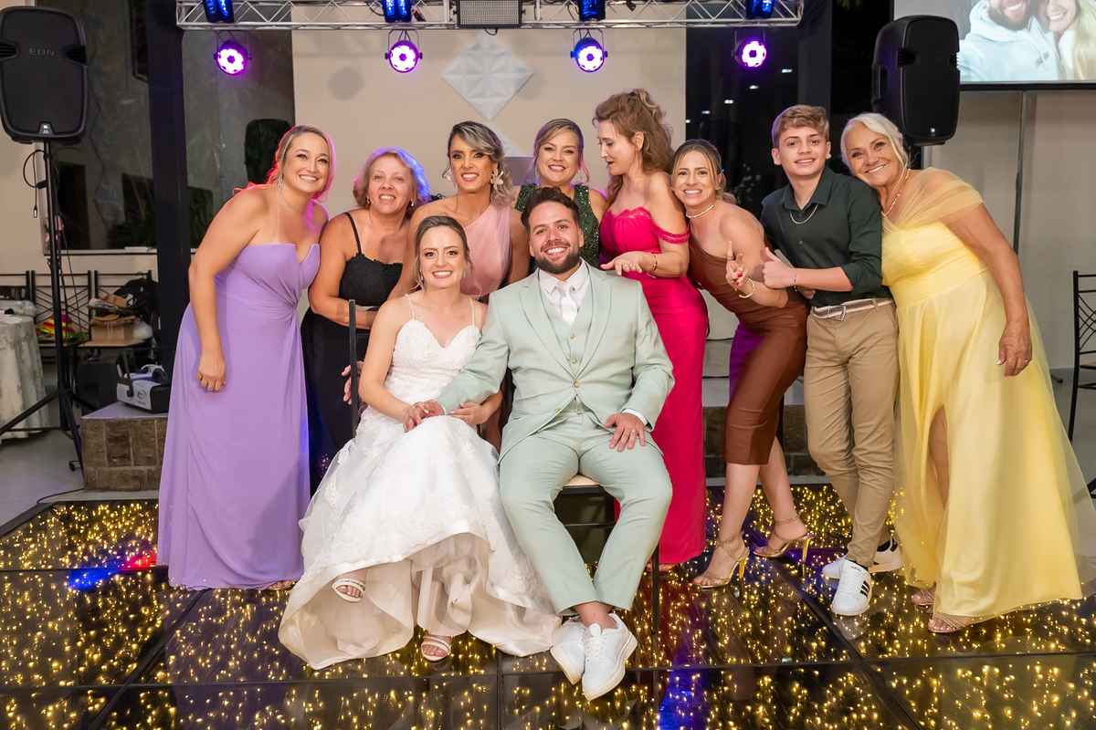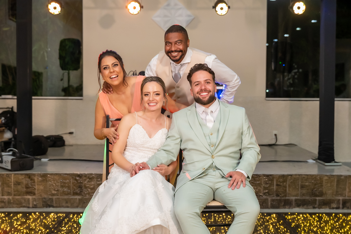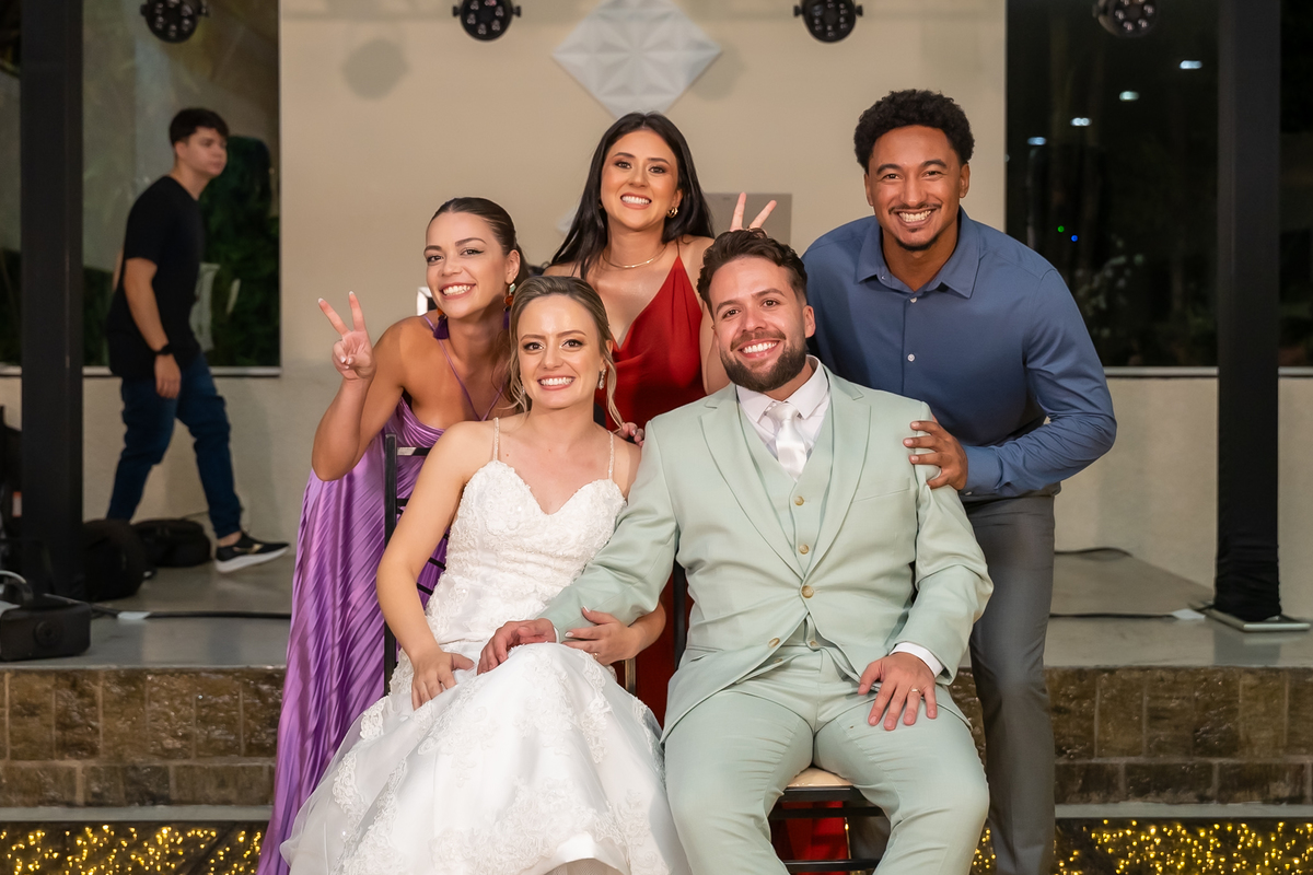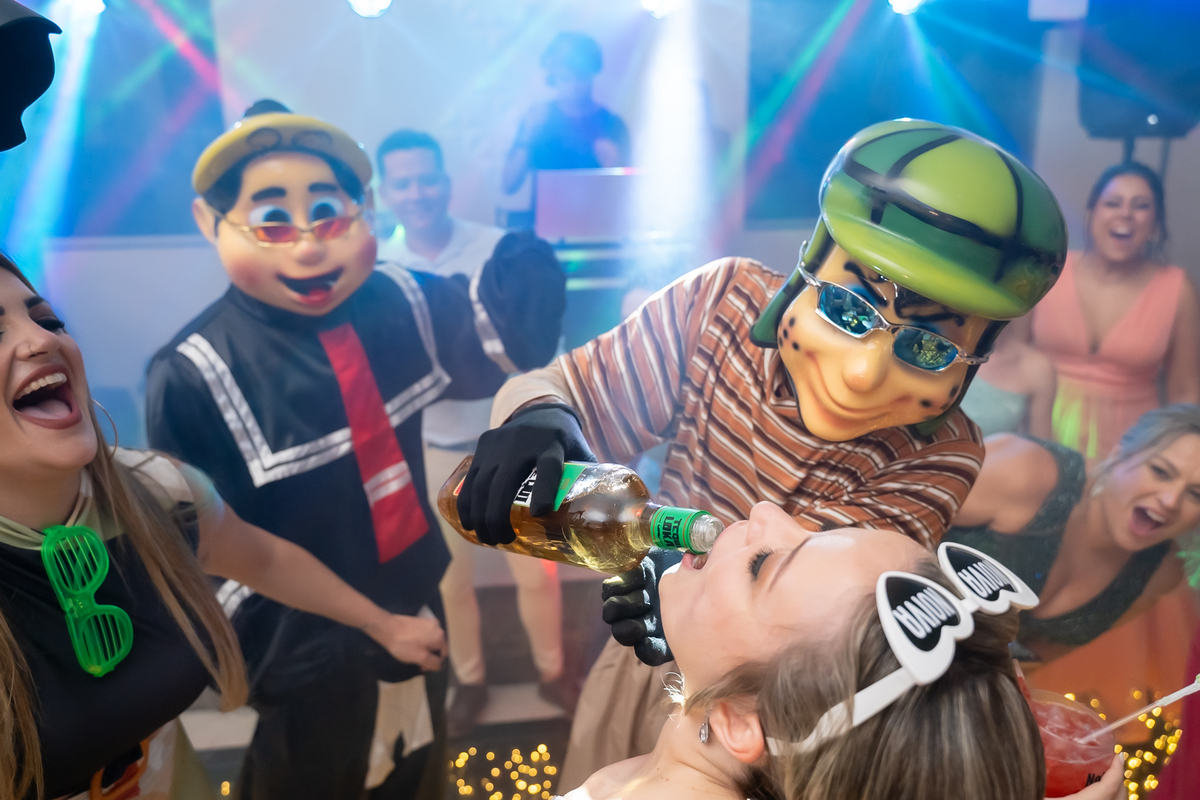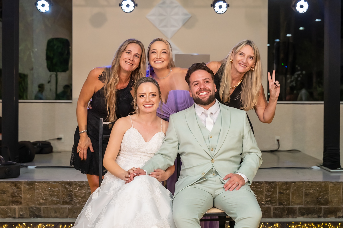 Na entrada da festa, os padrinhos prepararam um túnel animado para receber os noivos, dando início a uma noite cheia de energia!