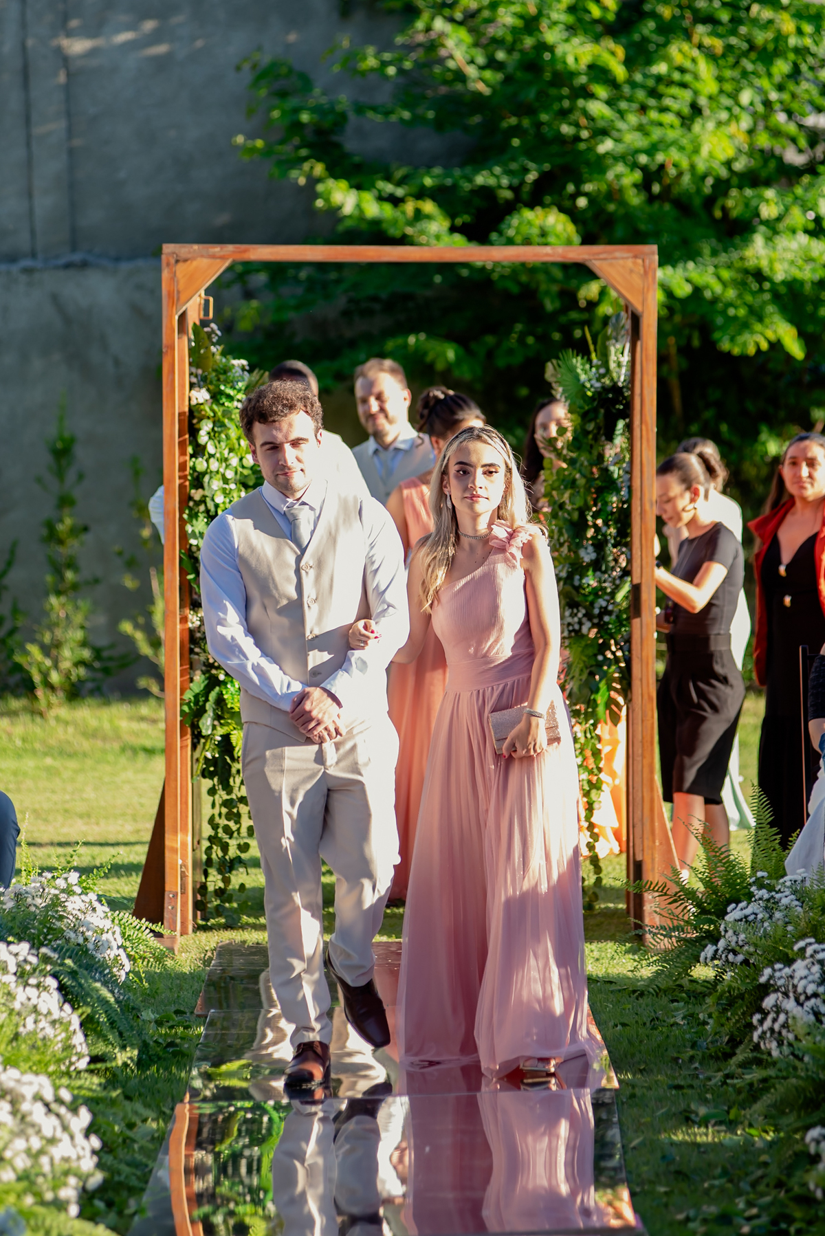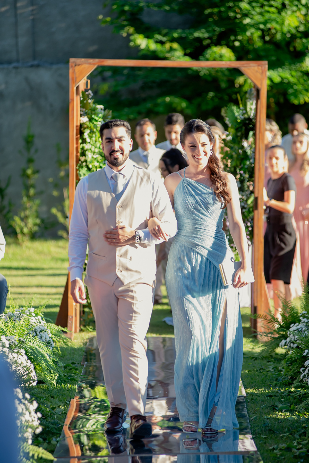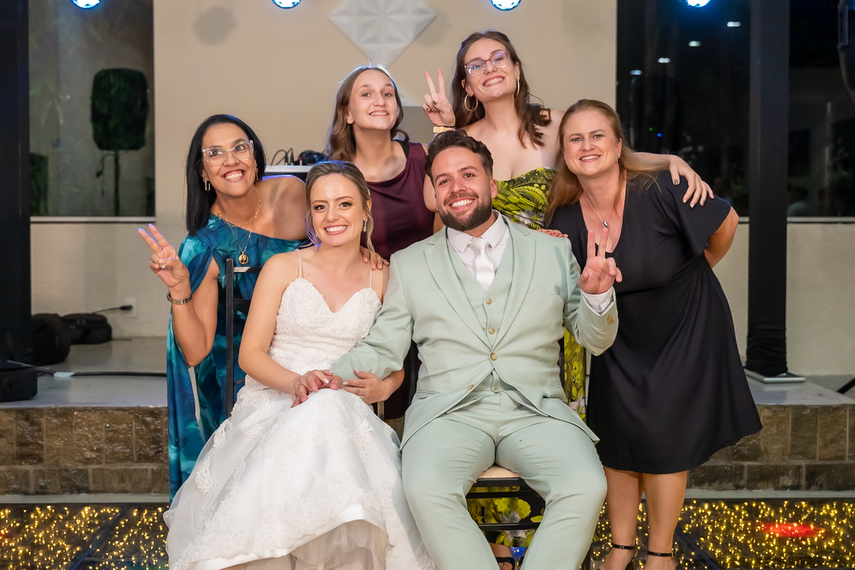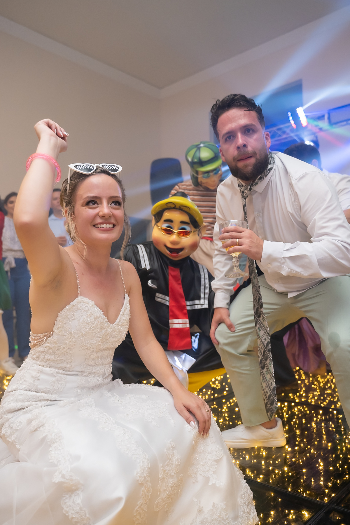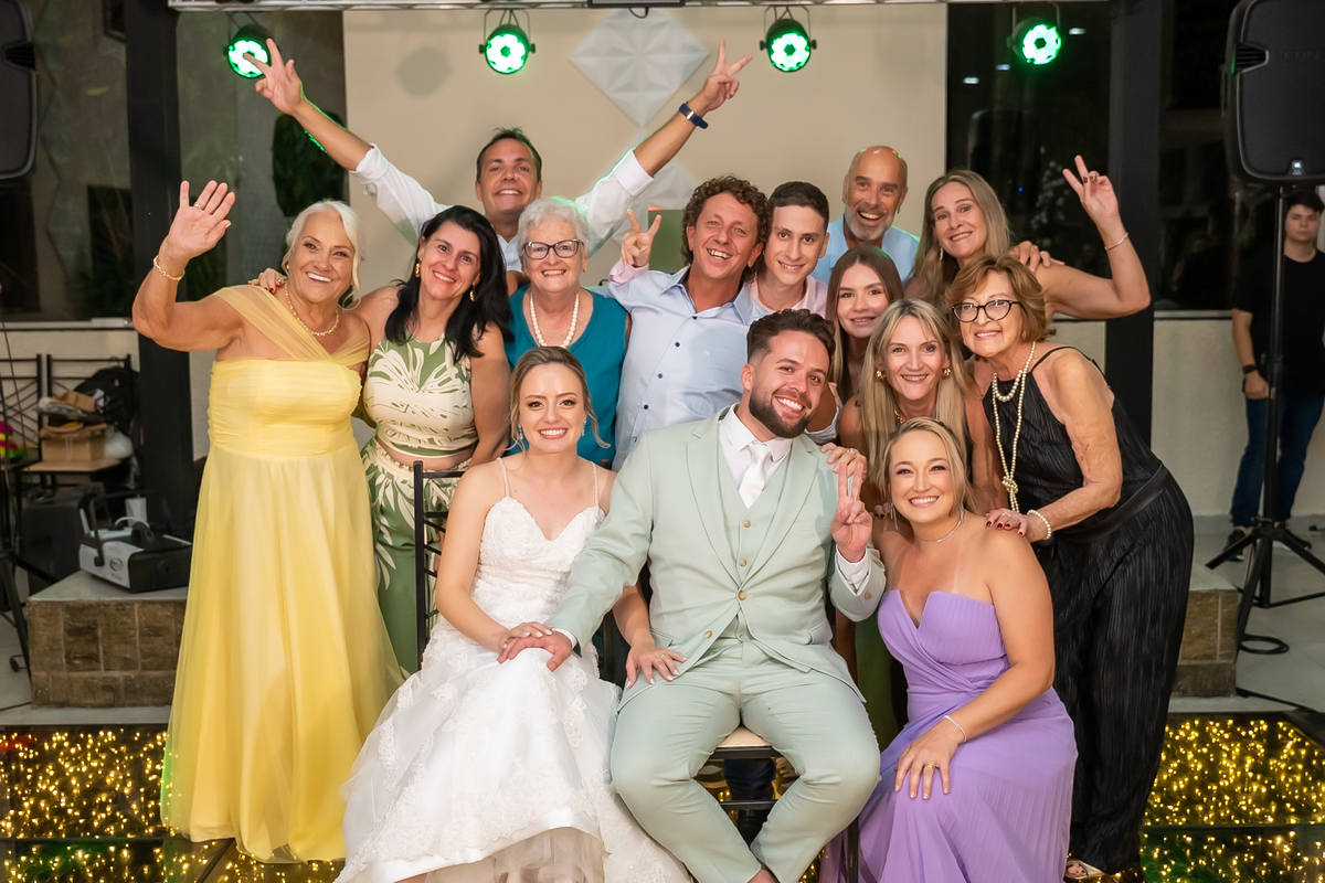 Na entrada da festa, os padrinhos prepararam um túnel animado para receber os noivos, dando início a uma noite cheia de energia!