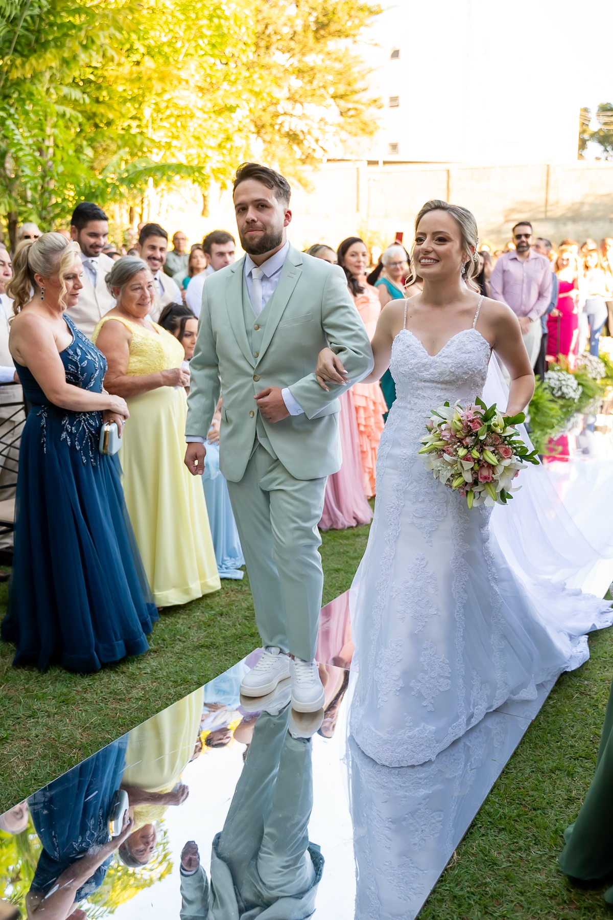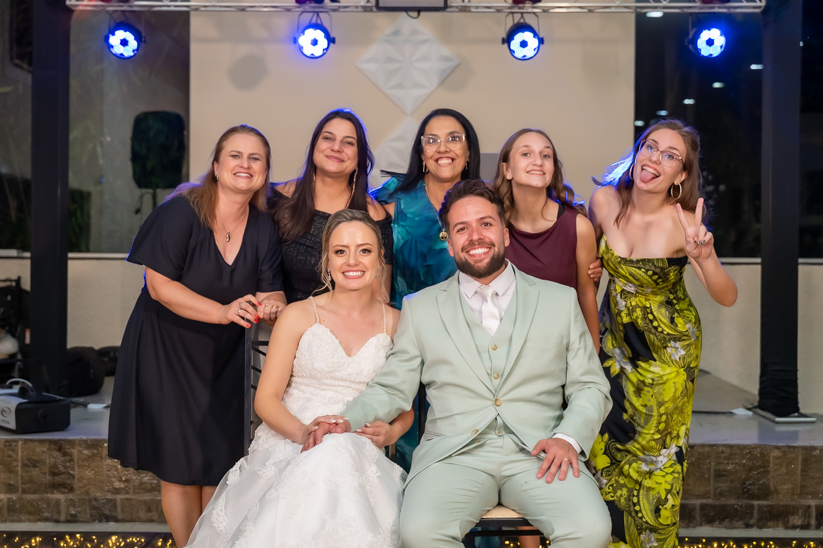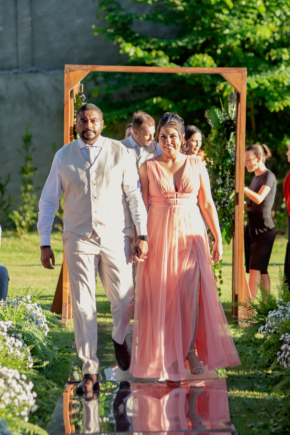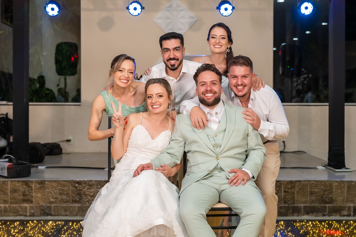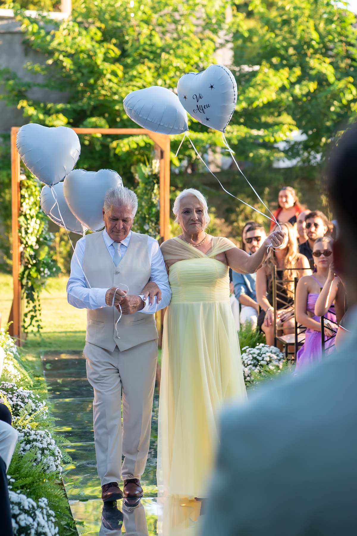 Na entrada da festa, os padrinhos prepararam um túnel animado para receber os noivos, dando início a uma noite cheia de energia!