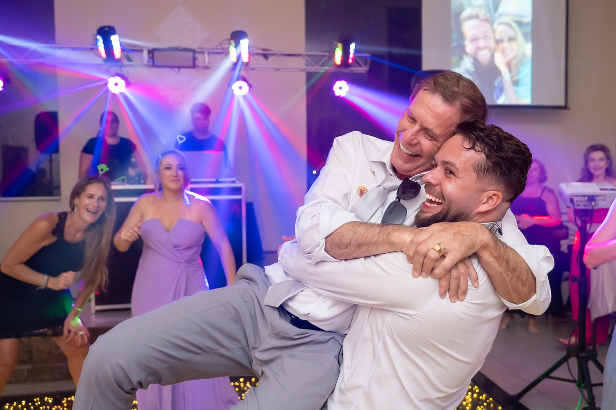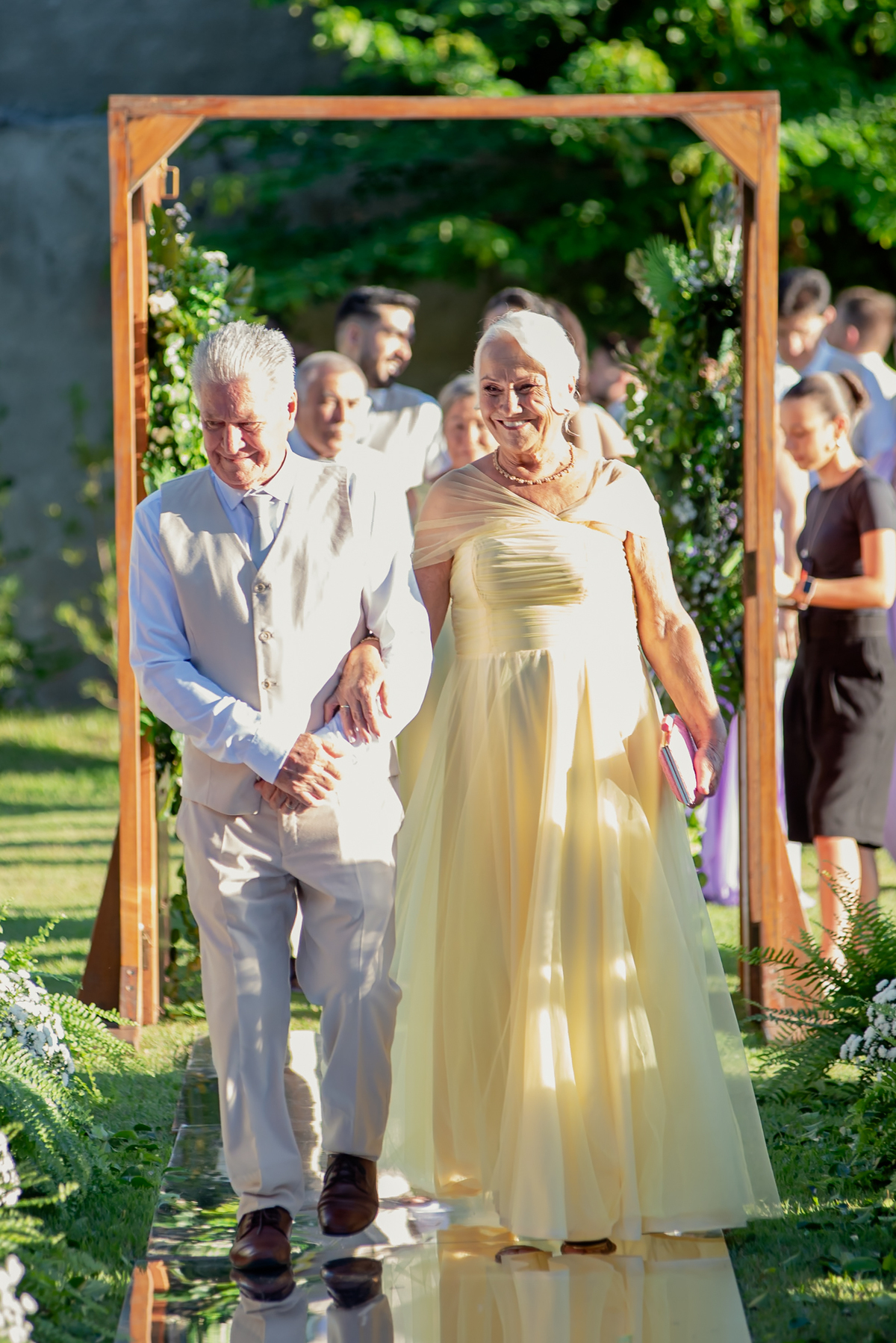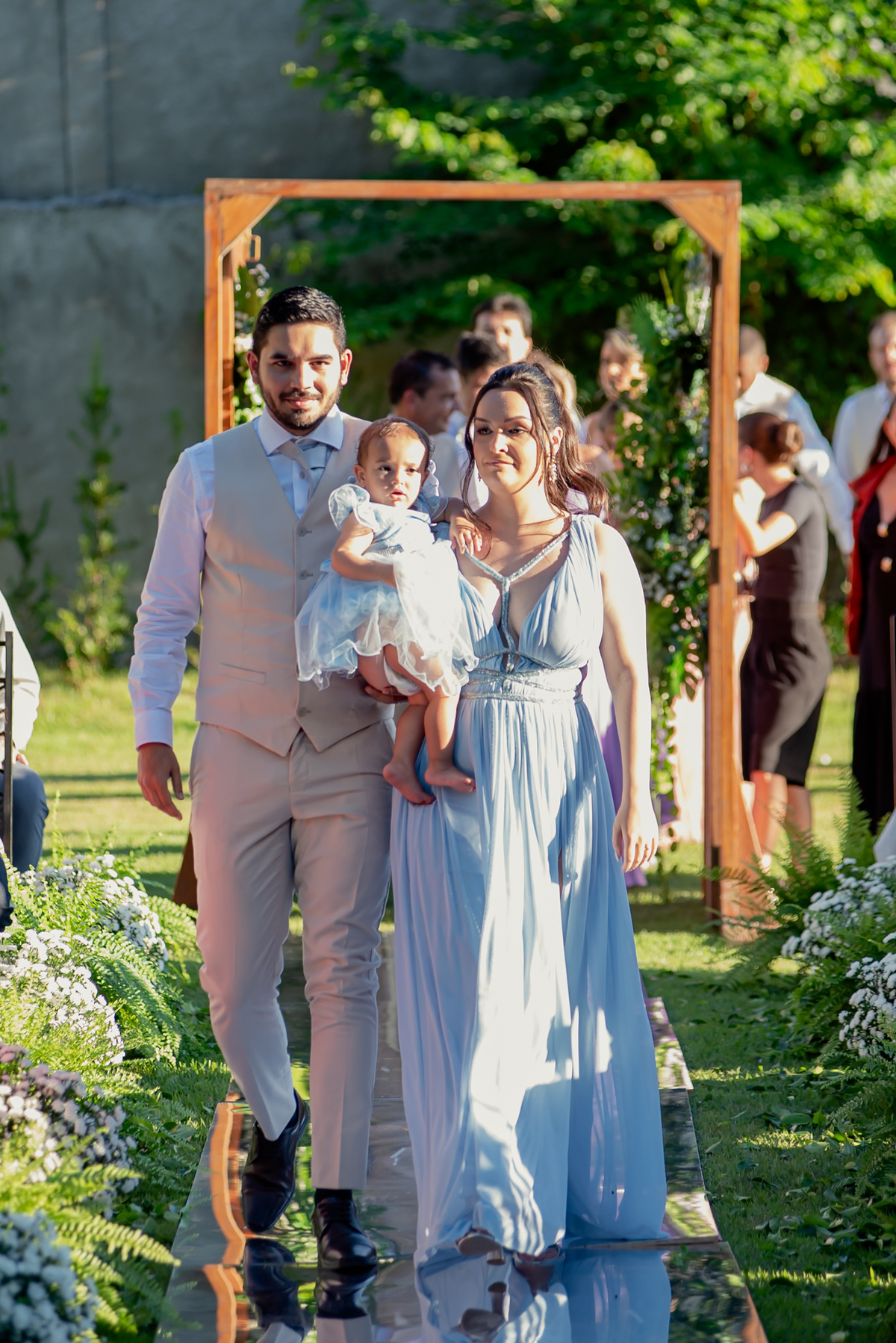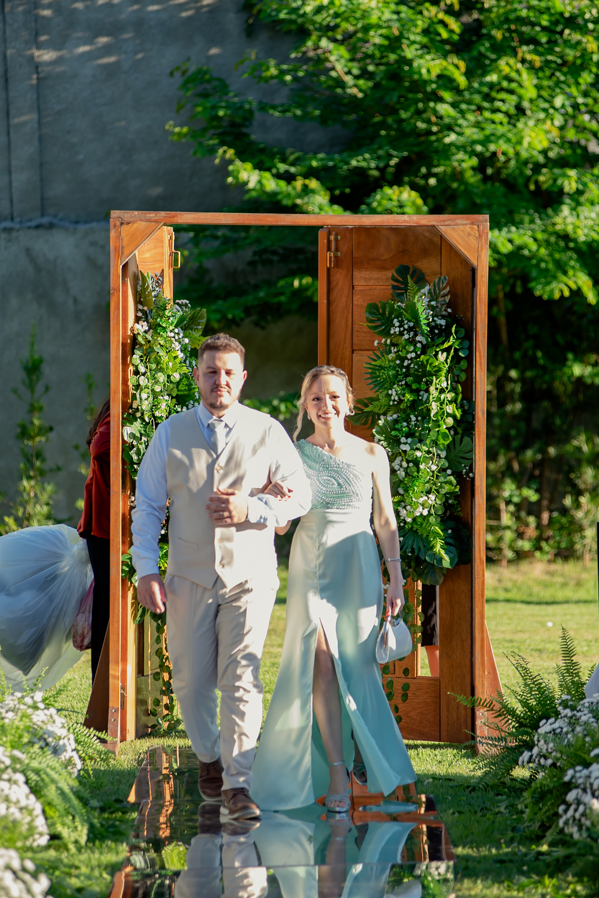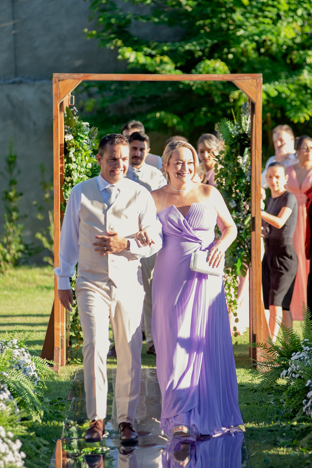 Na entrada da festa, os padrinhos prepararam um túnel animado para receber os noivos, dando início a uma noite cheia de energia!