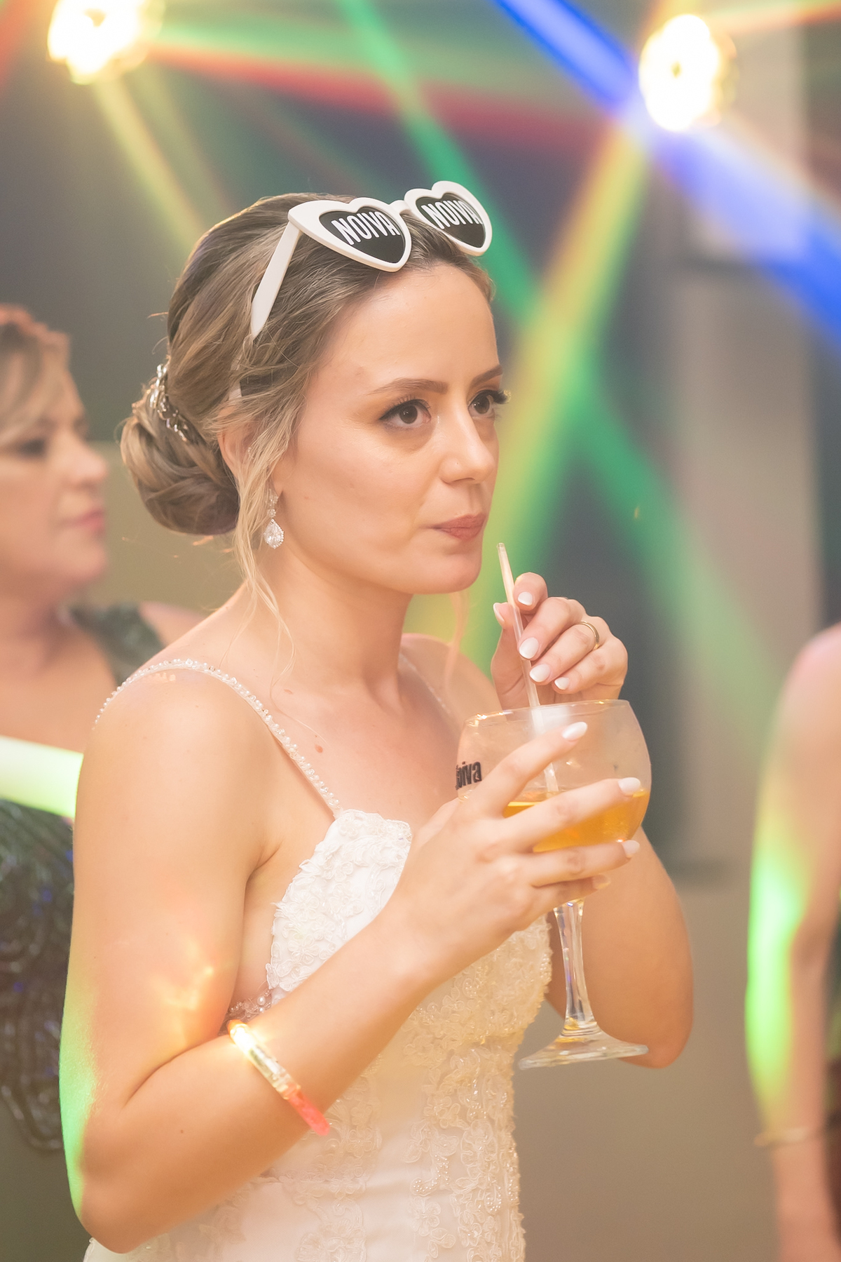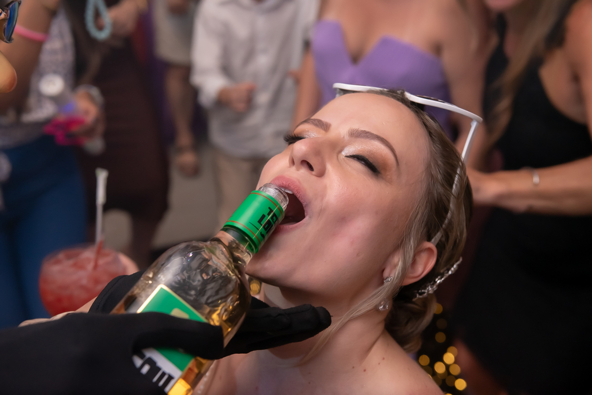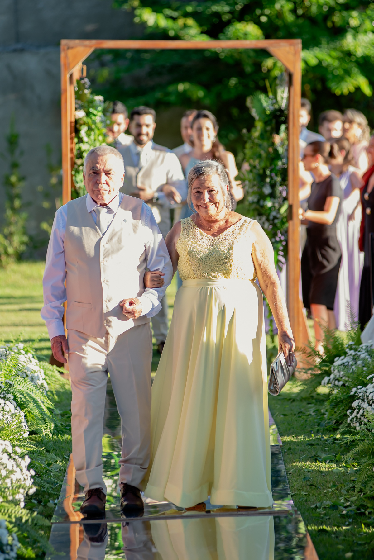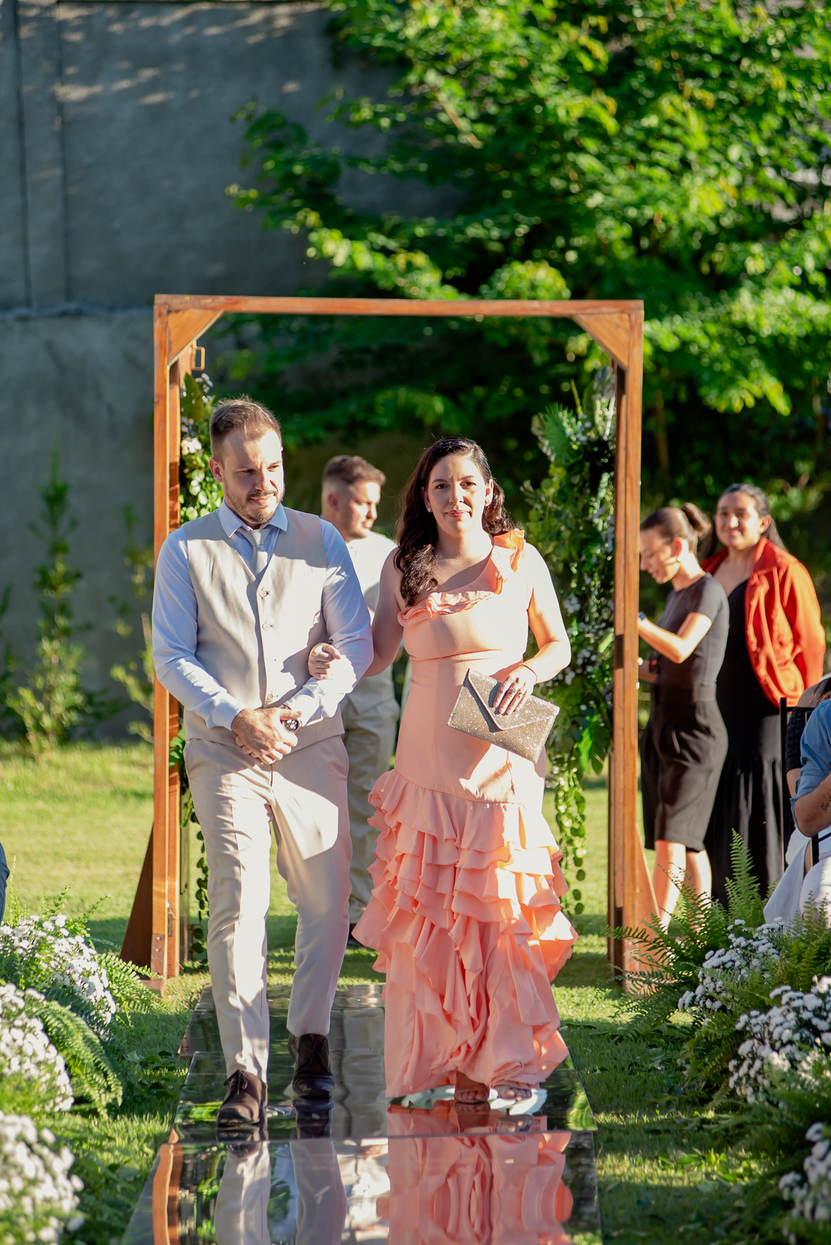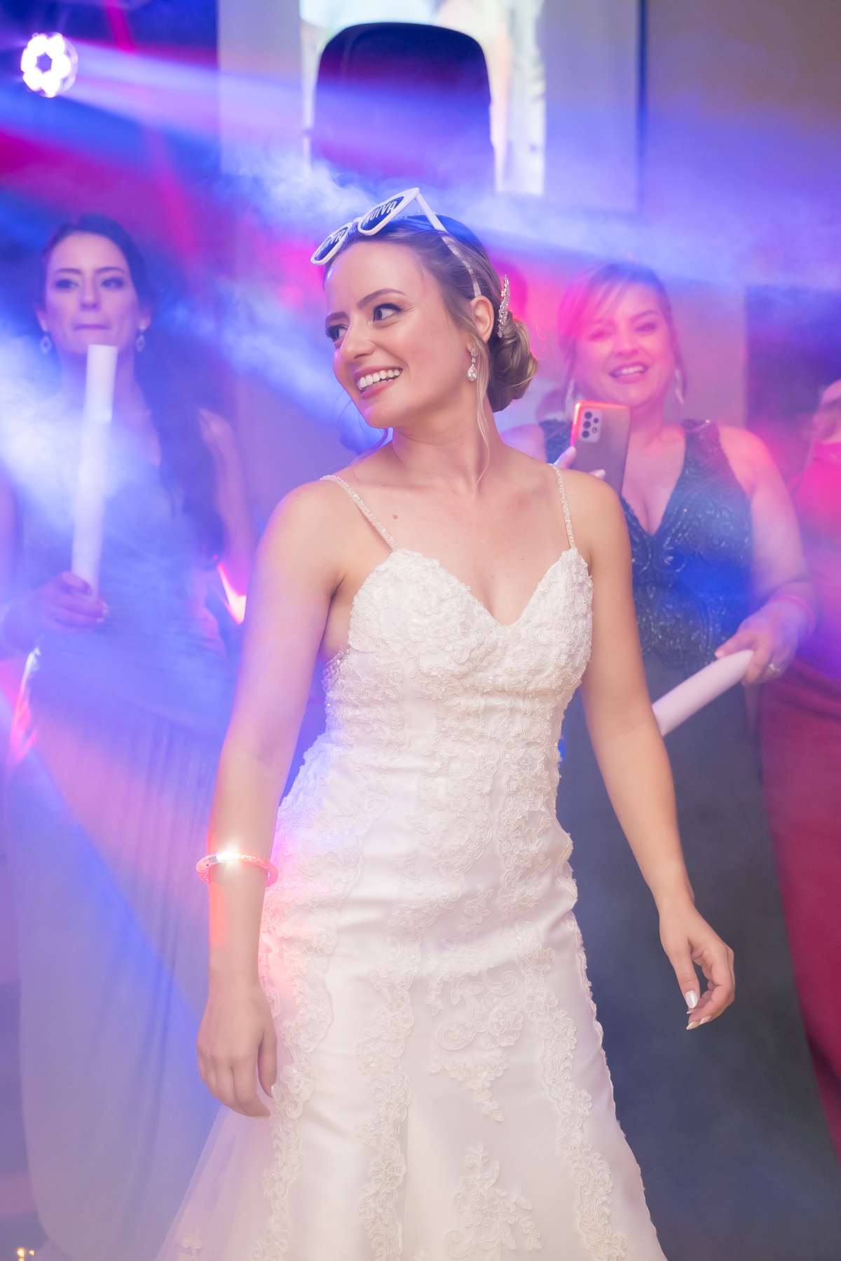 Na entrada da festa, os padrinhos prepararam um túnel animado para receber os noivos, dando início a uma noite cheia de energia!