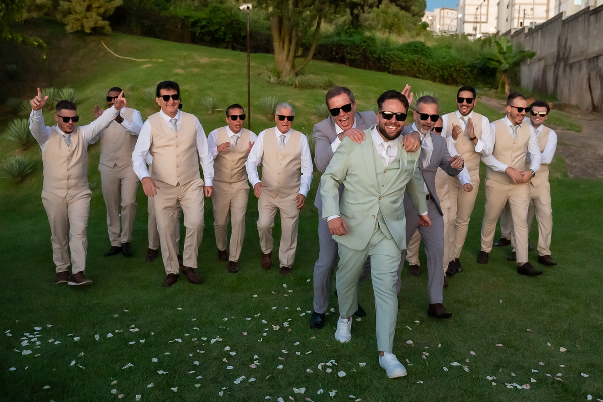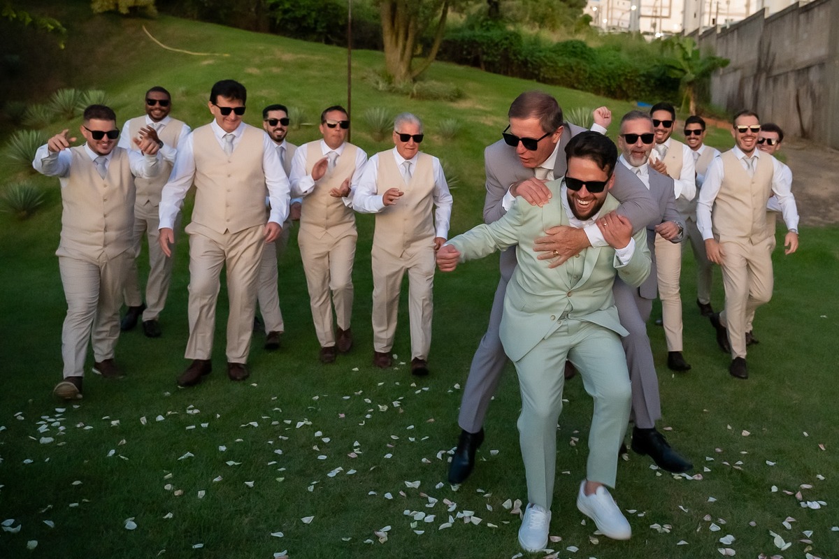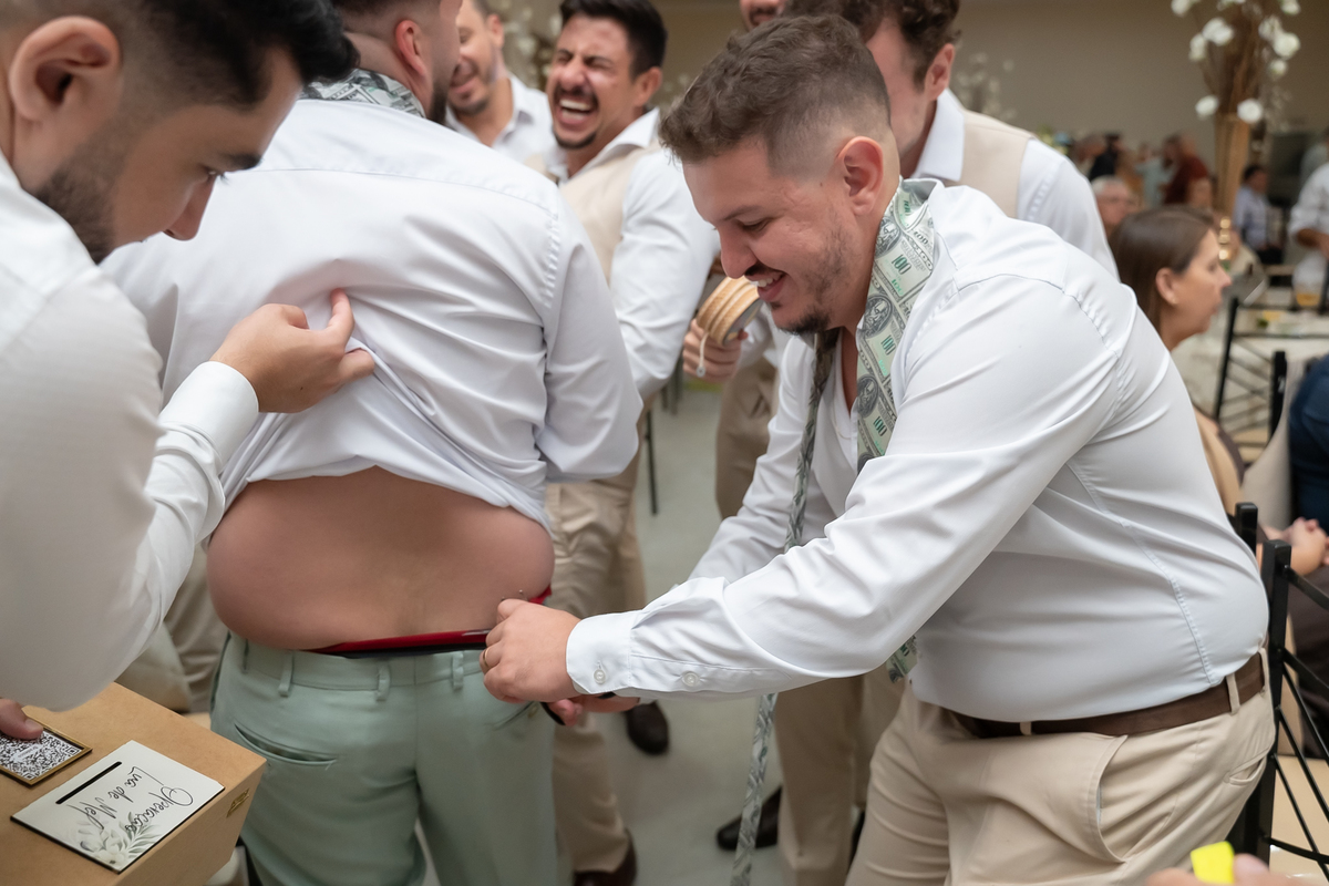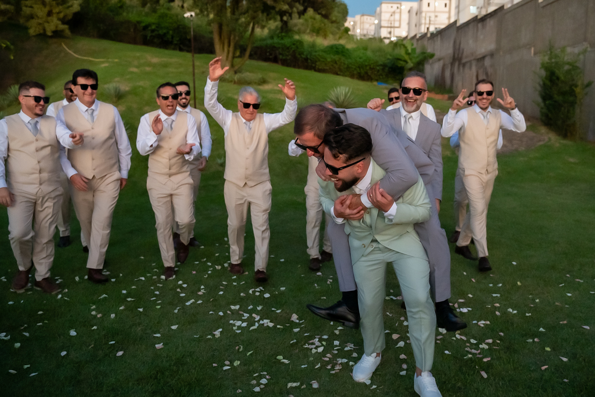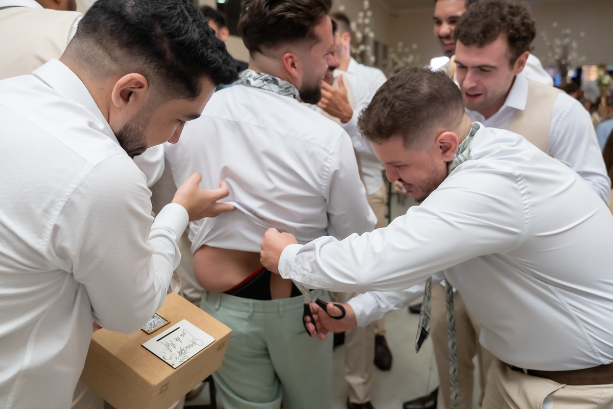 A passagem da gravata virou pura bagunça com o noivo e os padrinhos, e claro, não faltou o tão esperado lançamento do buquê.