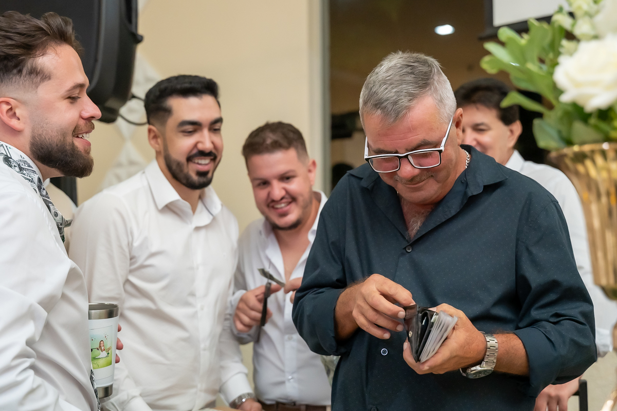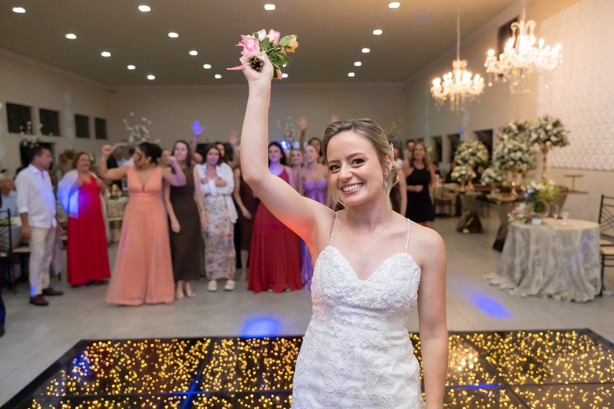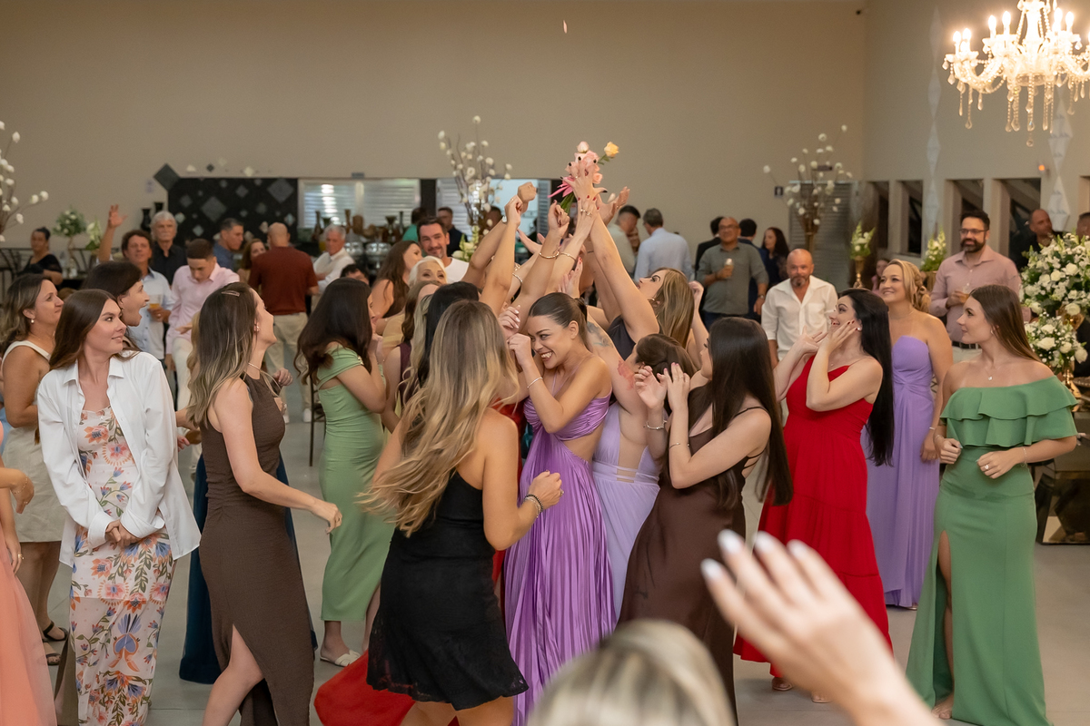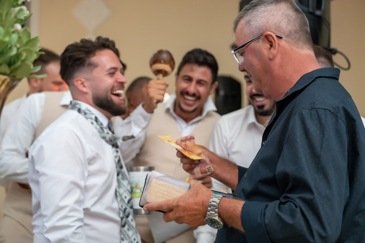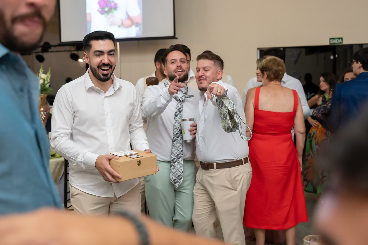 A passagem da gravata virou pura bagunça com o noivo e os padrinhos, e claro, não faltou o tão esperado lançamento do buquê.