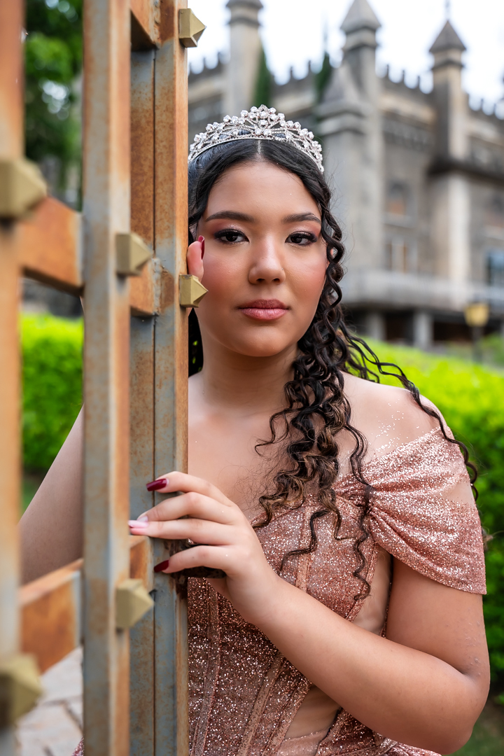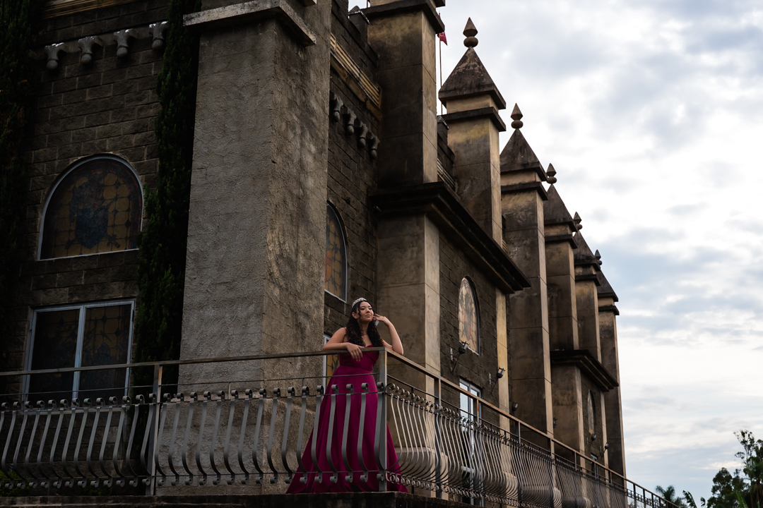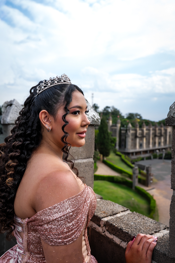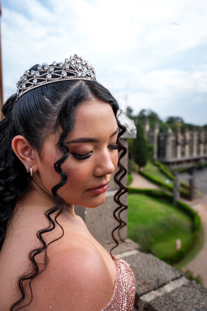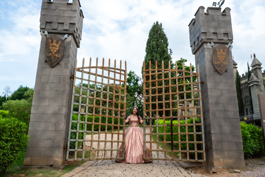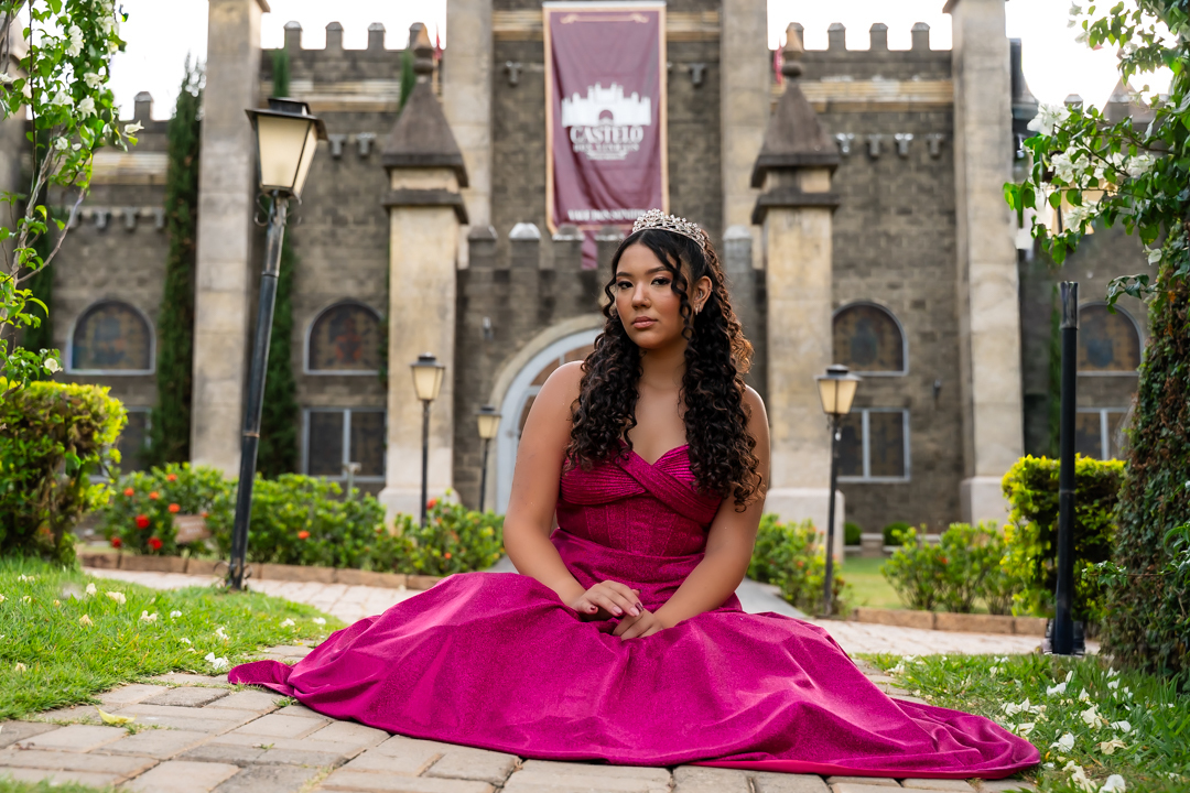 No Castelo dos Vinhais, em Vinhedo, registramos um momento tranquilo, cheio de sutileza. Mesmo tímida e com poucos sorrisos, Raphaela estava linda com seu vestido de festa, vivendo essa fase tão especial do seu jeito — discreto e encantador.